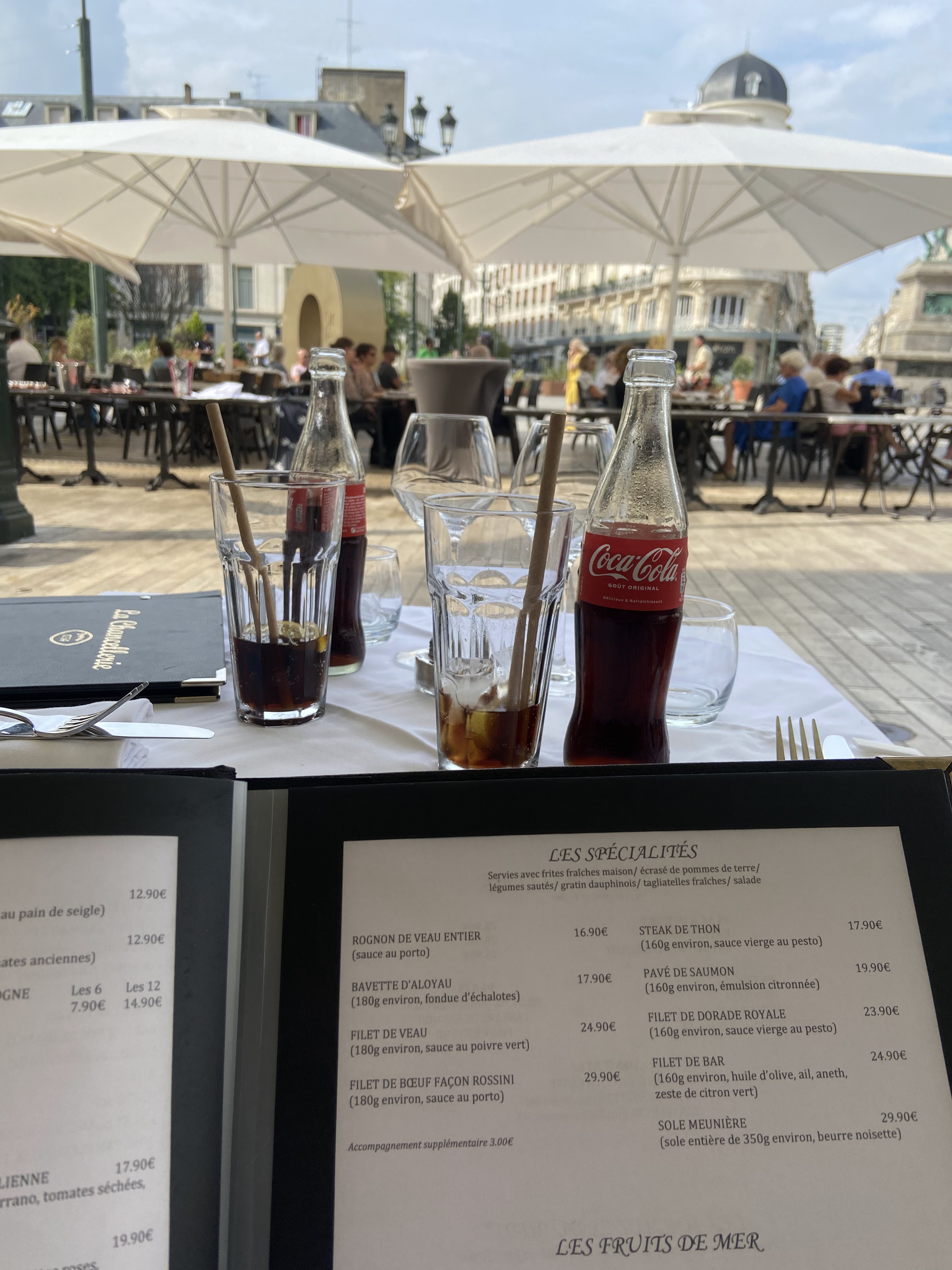 Petit verre en terrasse 1 café 1 diabolo fraise 7€, avec une jolie vue sur la place du martroi. Serveur hyper sympa. Je recommande cet établissement.