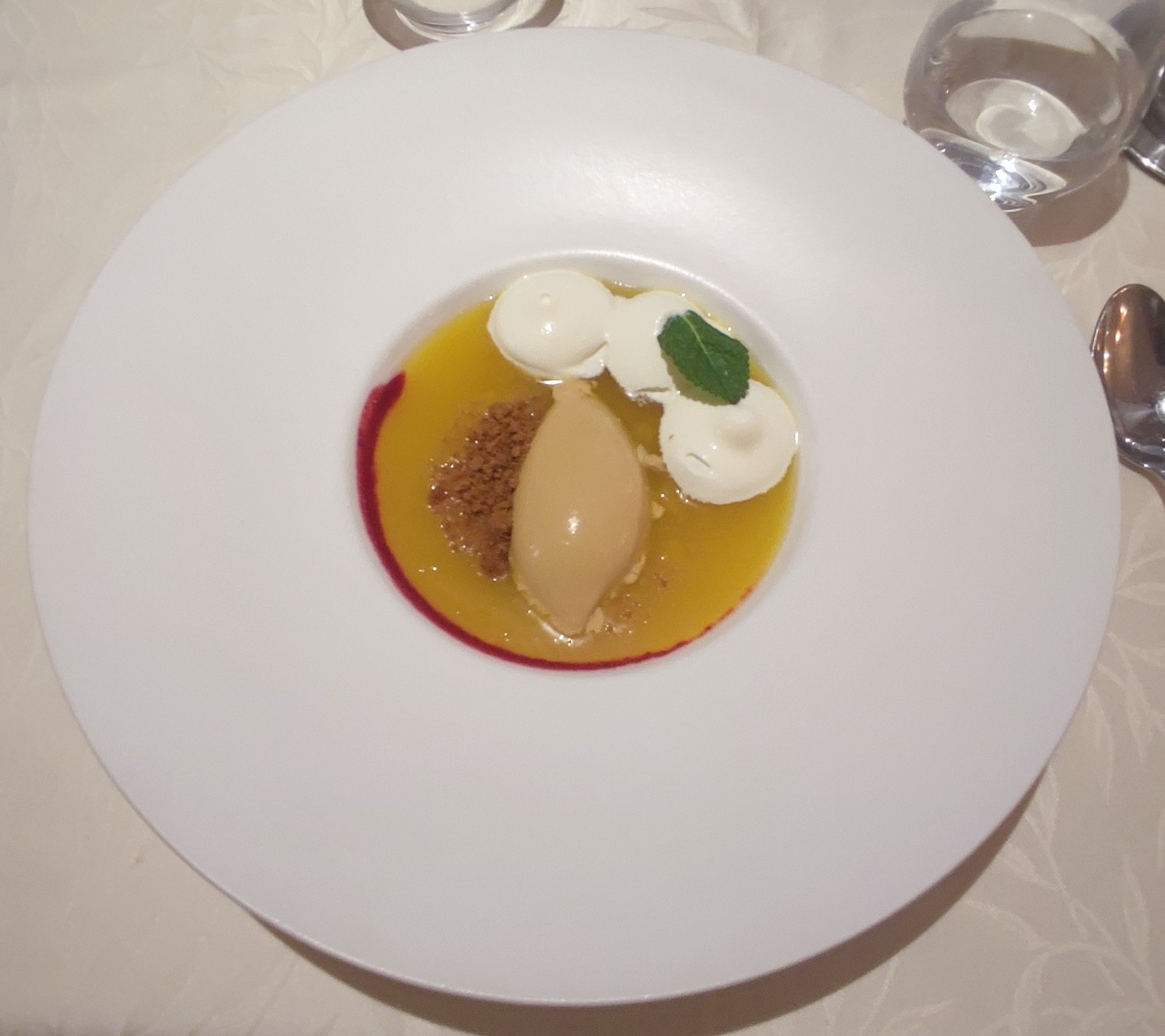 Pour Pâques menu du déjeuner à 80 €. D’abord amusé-bouche bouillon de légumes et petite quiche,escalope de foie gras de canard poêlée tiède sur pain perdu froid, puis noix de Saint-Jacques froid avec une émulsion froide qui n’en était pas une et quelques bouts d’asperge, puis poitrine de volaille farcie (farce verte sans saveur) avec champignons, le tout tiède, dessert ultra sucré… quelle honte pour un menu à 80 €, c’est du vol…