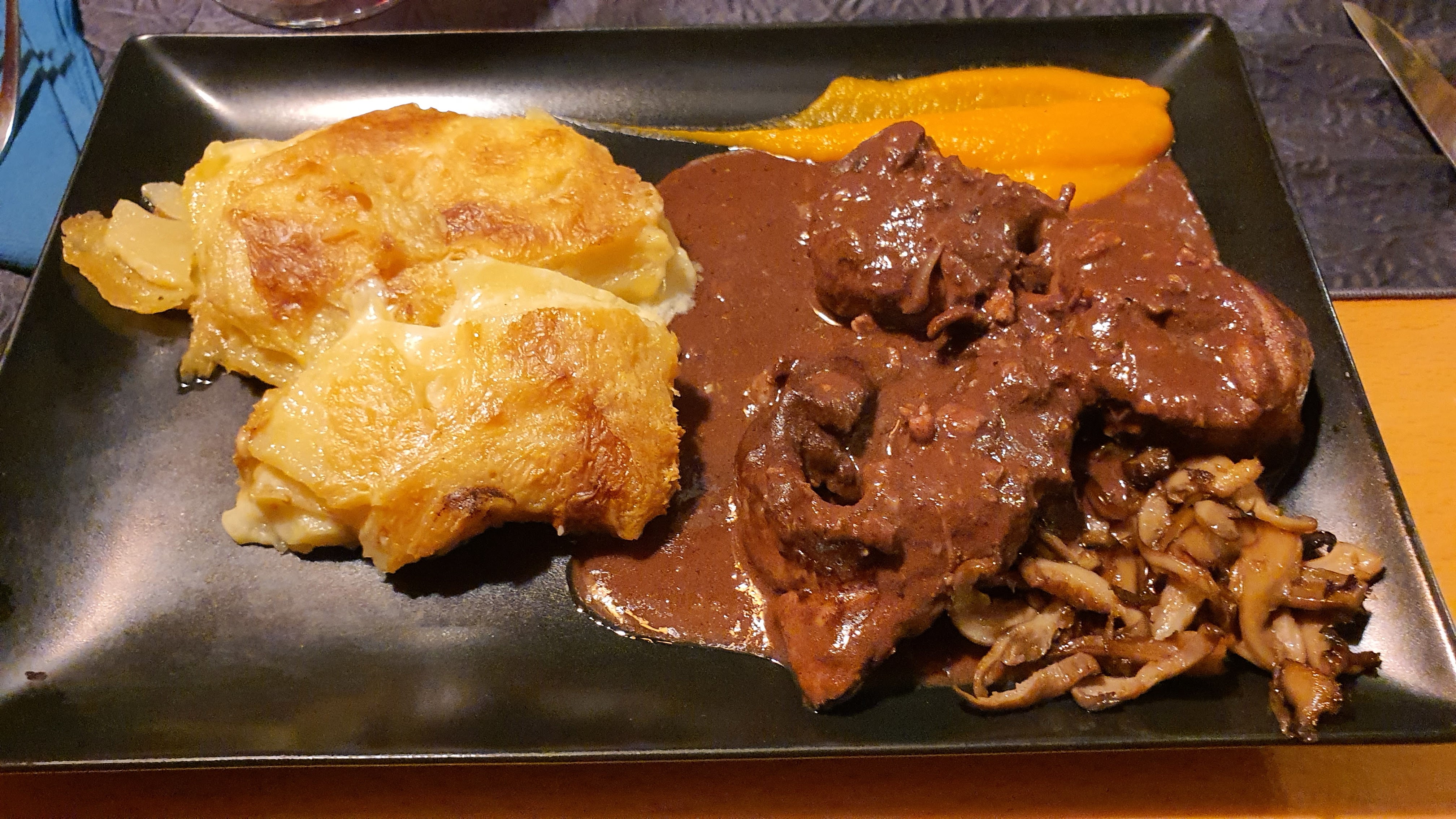Somme toute correct. Cover de lapin un peu juste en quantité. Mais sauce bonne et gratin dauphinois excellent. La raclette est bonne : le fromage n'a rien d'exceptionnel, la charcuterie est pas mal. La tartiflette était bien gratinée et bonne. La déco et le service au top. J'oubliais : la tarte au noix... miam 😀
