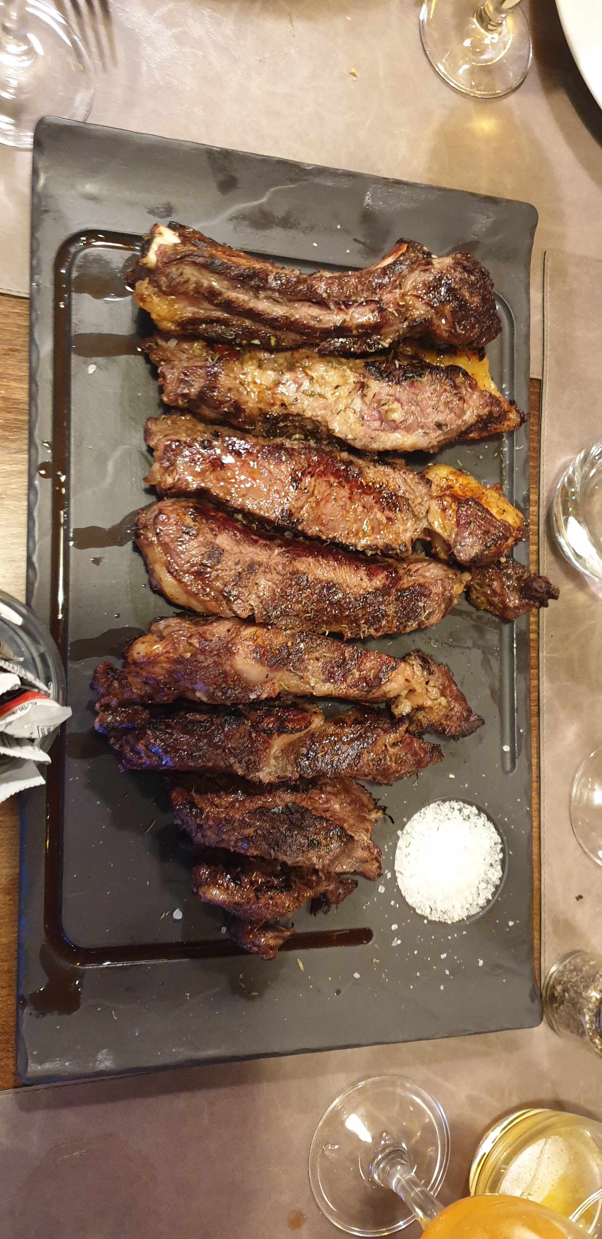 Partagé, mitigé Assiette de jambon ibérique un peu trop nerveux. Mon tartare de bœuf très bon en revanche entrecôte de ma compagne avec un goût de rance. Viande sous vide!? Je penses. En tout cas pour la cote de bœuf oui Tout n’est pas grillé en front comme on pourrait le penser. Dommage car c’est un show aussi. Les gambas sont sûrement des produits industriels dommage qu’avec une petite carte il n’y est pas que des produit frais.