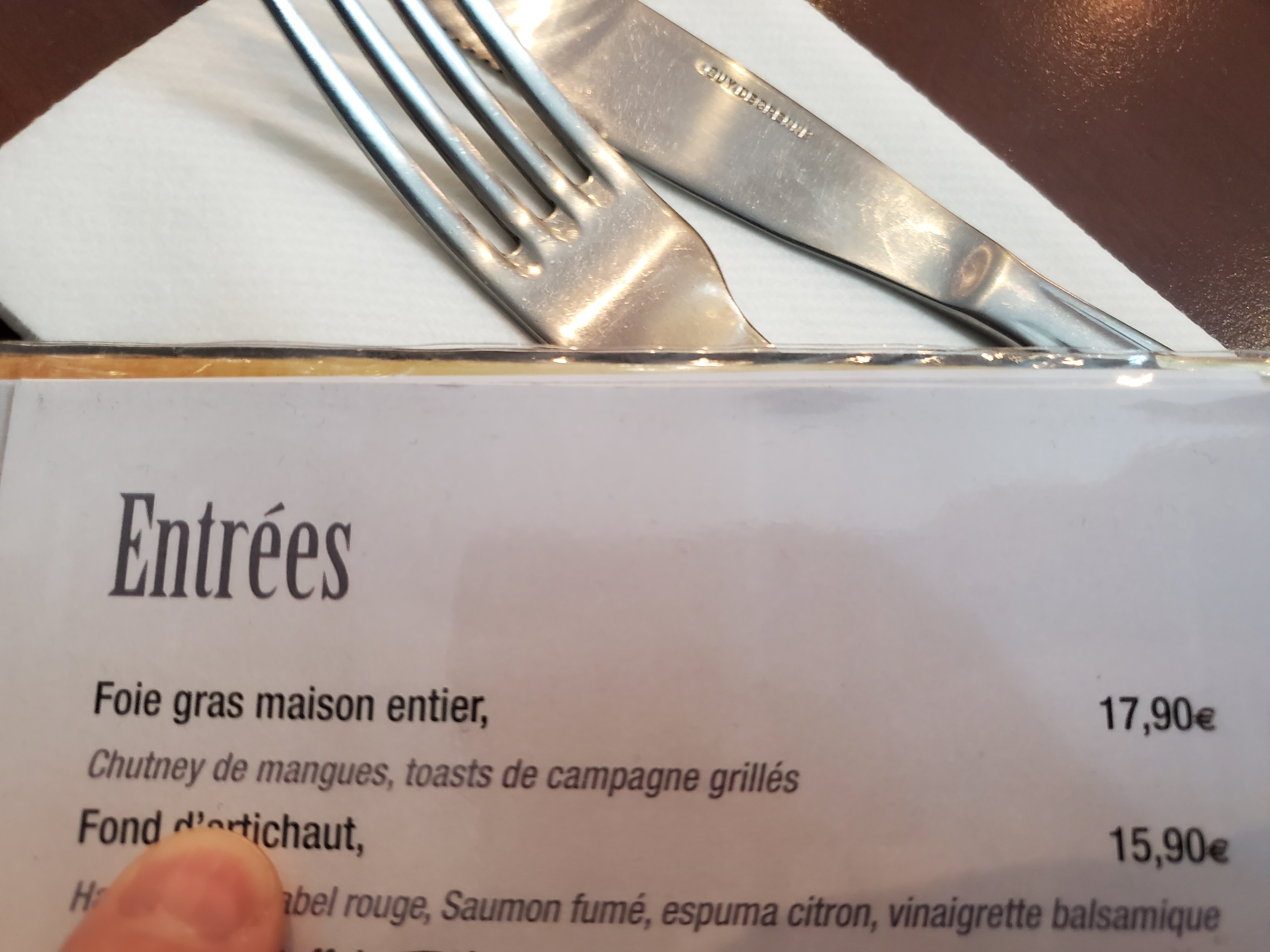 dans le cadre d une smartbox foie gras ordinaire , pas de morilles comme indiqué sur la carte avec le filet de bœuf , pas de dessert du jour et pas de crème brûlée come prévu sur la carte Apéritif vin et café non compris pour un montant de 100 euros . Fromage non compris non plus