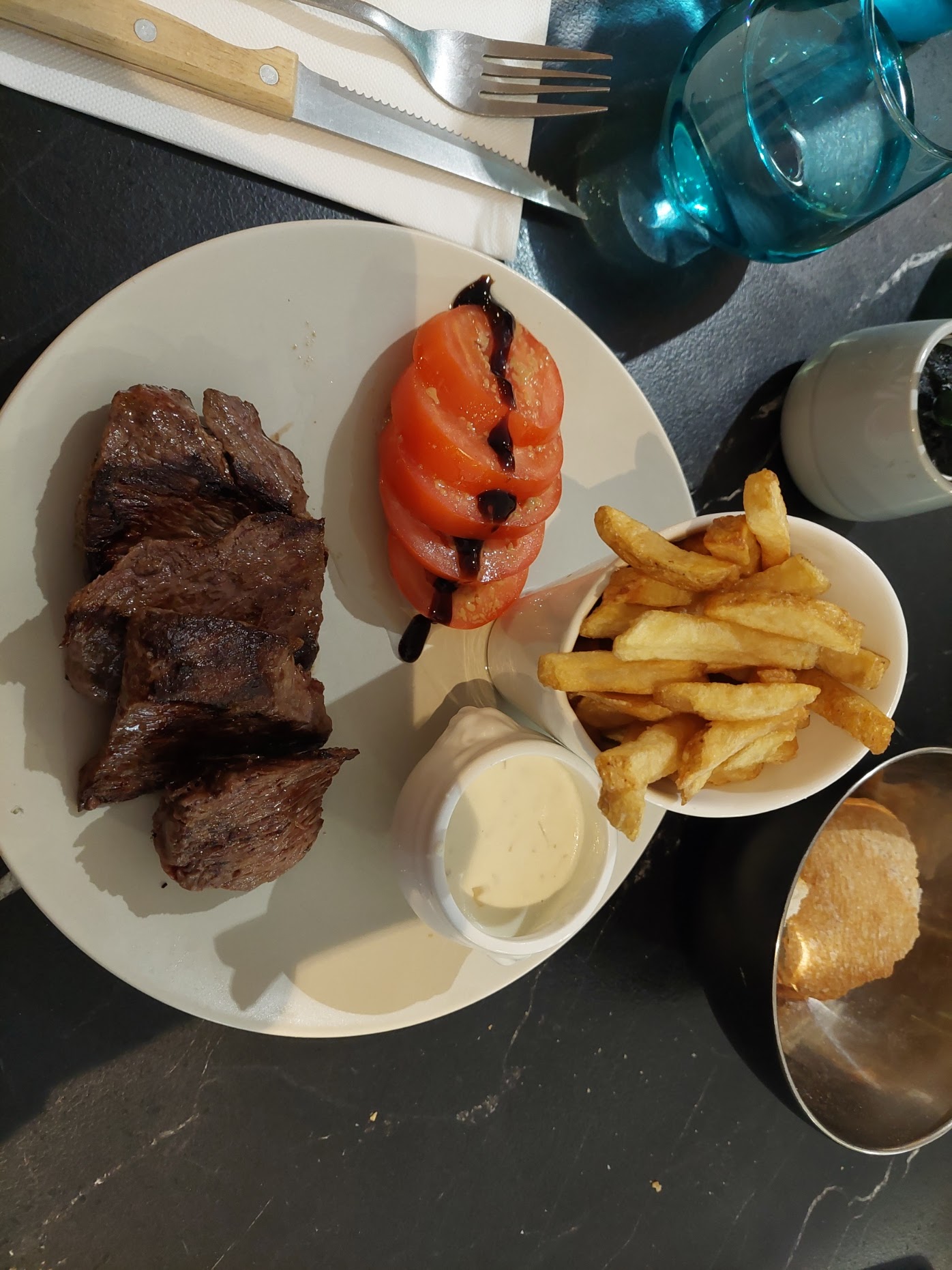 Restaurant très correct pour manger au centre d'Avignon. Service très sympathique et j'étais reconnaissant qu'ils aient changé un ingrédient dans mon plat sans aucun problème dû à une intolérance. Nous avons commandé chacun un plat : « Filet de rumsteack, 200 g, sauce au poivre (15 €) » et « Aligot de l'Aubrac, Saucisses au sel de Guérande (15 €). Tout aurait été presque parfait si le steak n'était pas un peu dur. Nous avons mangé au sommet et nous avions un peu froid, je pense que le chauffage n'arrive pas beaucoup au sommet. Prix total 30 €. Nous le répéterions et le recommanderions.