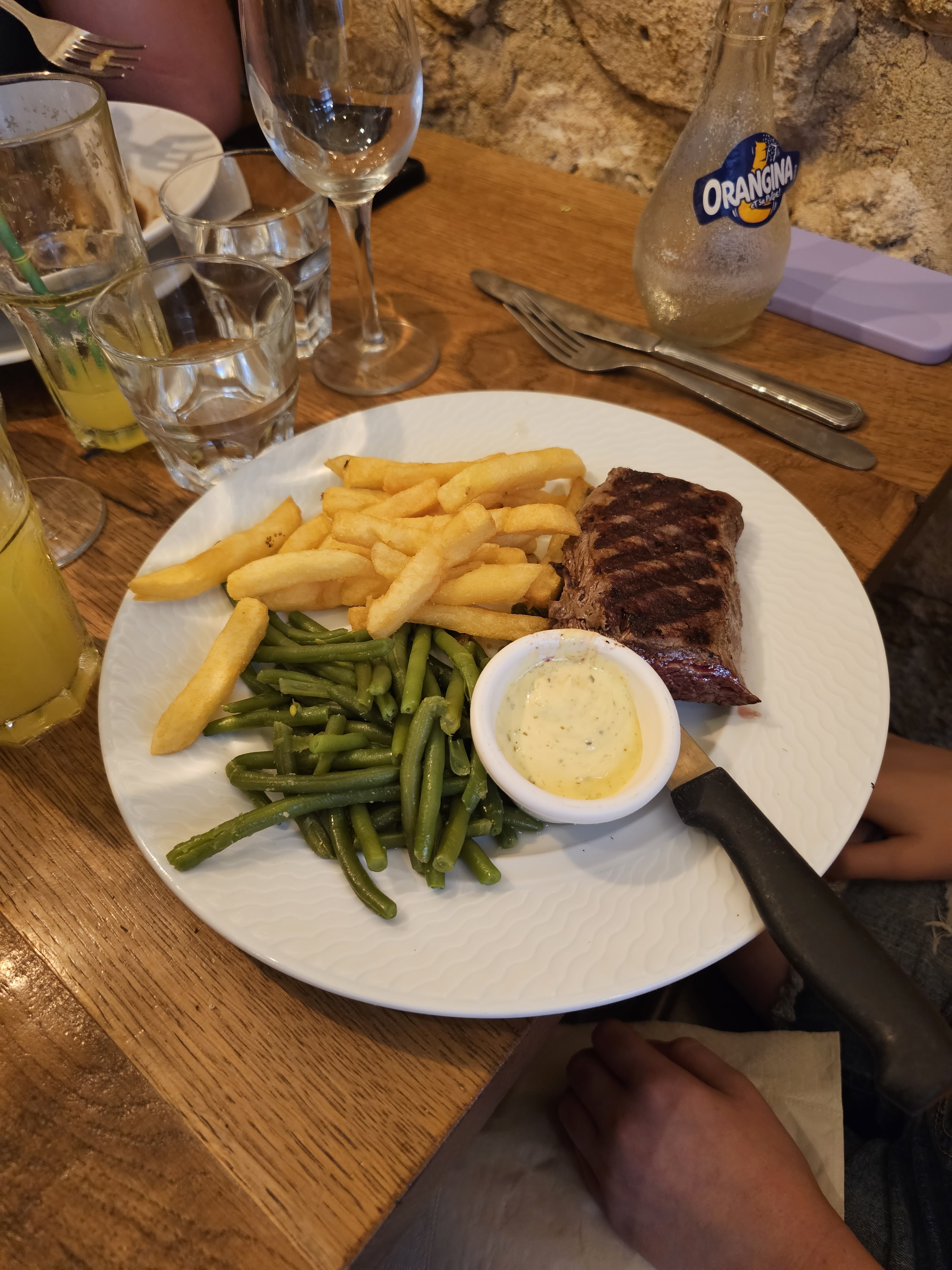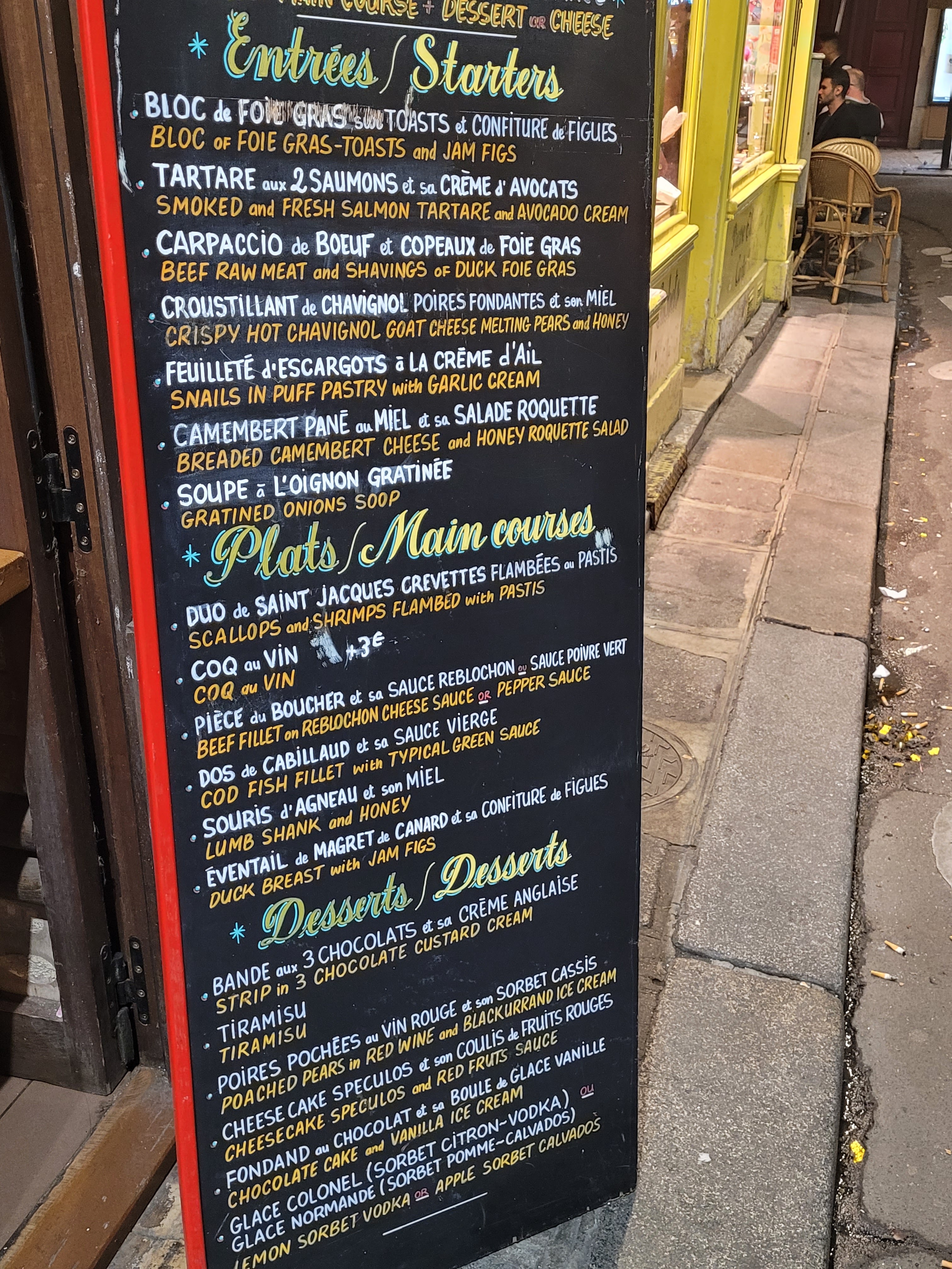 J'ai lu les critiques et j'ai décidé de venir en famille pour vivre l'expérience de la cuisine française avec ma femme et mes enfants. Nous sommes arrivés vers 18 heures samedi et il y avait plein de tables libres, mais après environ une heure, c'était complètement plein. Nous avons essayé les escargots et les cuisses de grenouilles ainsi que la soupe à l'oignon et le poulet frites. Tout était bon et savoureux. J'ai pris le combo à 23€ et je l'ai aimé. Les portions étaient assez bonnes pour nous et au moment où ils ont apporté ma crème broulle, nous avons décidé de la partager avec 4 d'entre nous car tout le monde était rassasié. Nous avons dépensé environ 30 € par personne (sans compter les pourboires) pour une famille de 4 personnes et seulement deux coupes de champagne. Le service était assez bon, mais ce n'est pas comme aux États-Unis, nous avons donc ajusté nos attentes et apprécié la nourriture qui était bonne. Je recommande cet endroit aux visiteurs avec des enfants.