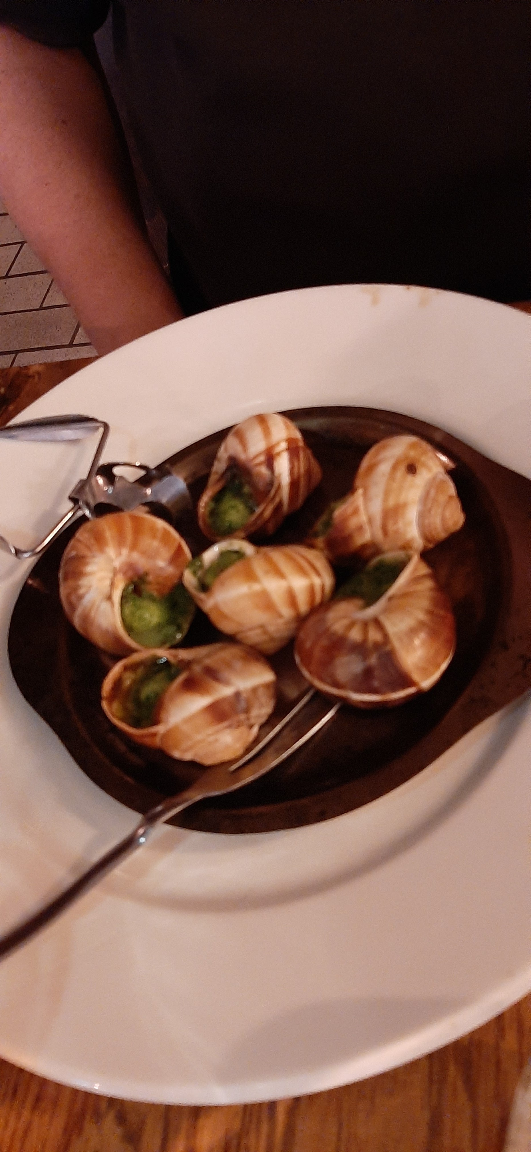 Ma femme et moi y avons mangé à Paris en septembre 2023. Ma femme a commandé son escargot préféré en entrée et elle a adoré. Mes moules étaient également savoureuses. J'ai commandé le steak frites et ma femme a commandé le spécial. Nous avons tous les deux adoré l'ambiance et le service. Nous reviendrions absolument si nous revenions à Paris.