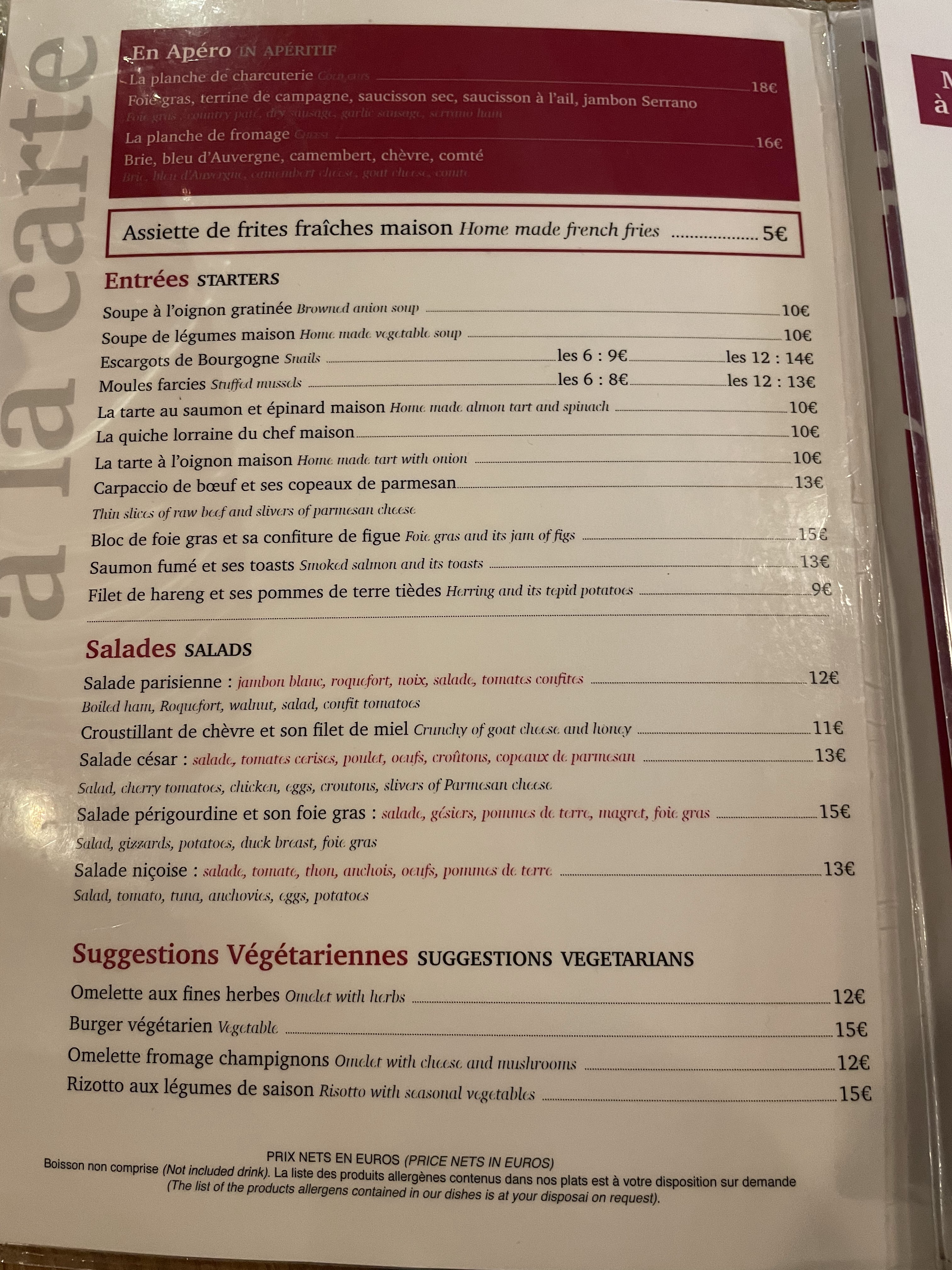 Enfin un resto avec des plats traditionnels...bourguignon, poissons, etc . Prix très corrects. Menu entrée + plat à 13 euros. Ouf...j'évite ainsi le snacking du midi ou la malbouffe : Merci ! 😁👍🏻
