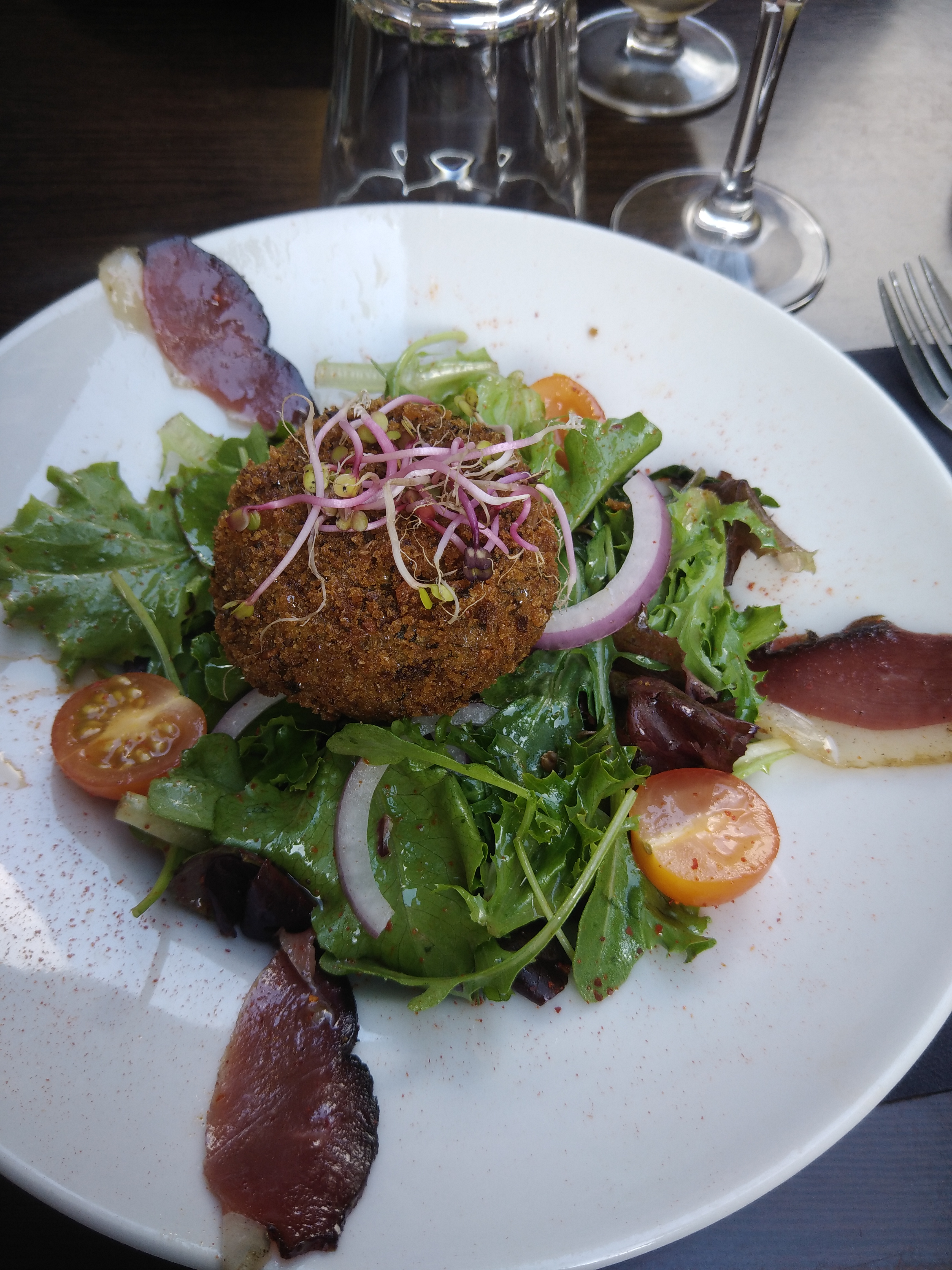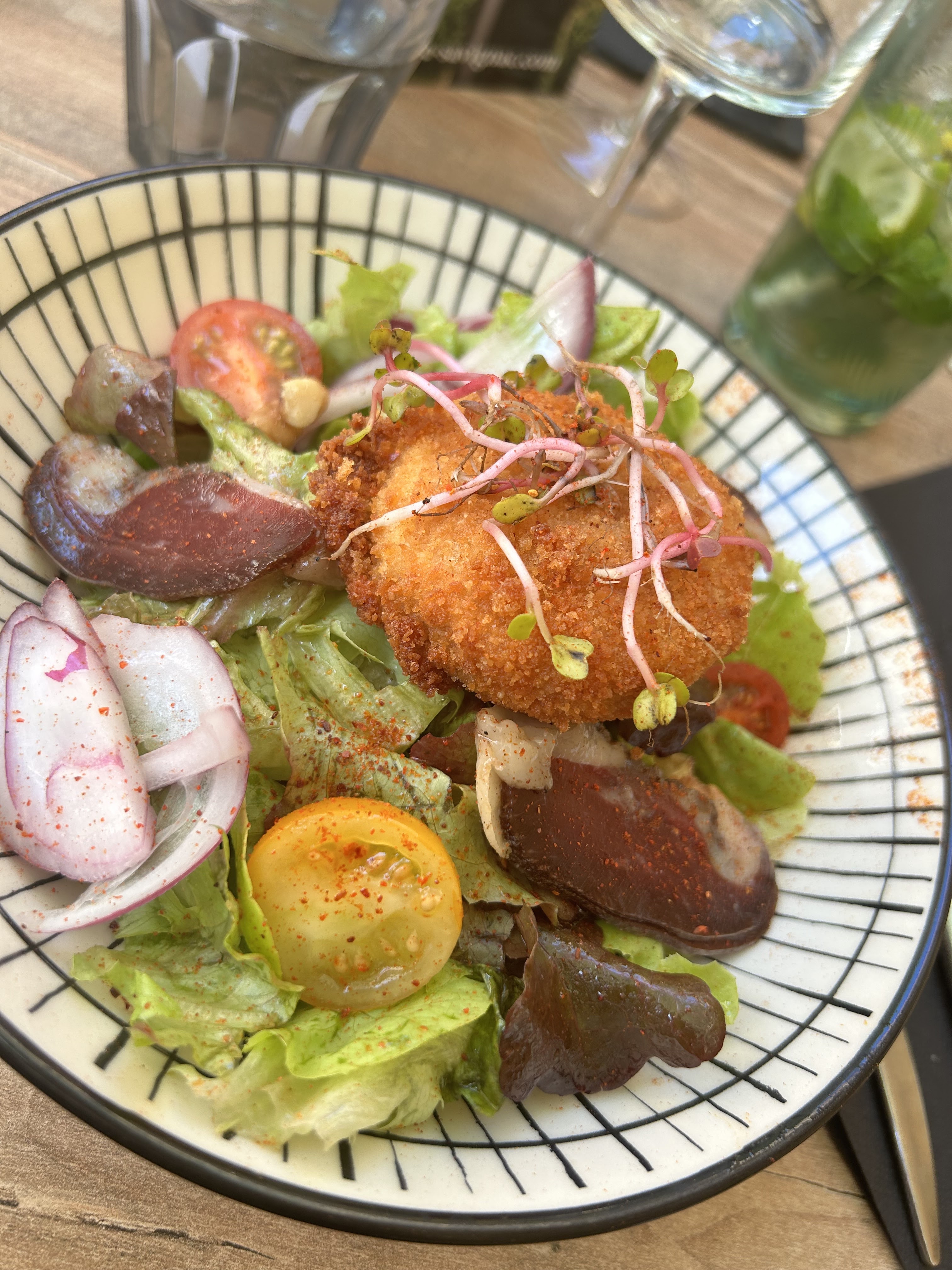 Les plats étaient plutôt bons, même si ça reste un peu cher. Une grande salade à 22€50. Le cadre est vraiment joli avec la salle vouteé. Les serveurs sont sympas, mais dépassés, bien que la salle ne soit pas immense. Beaucoup dattente, on est resté 2h30 pour une salade et un dessert. Par contre, c'est plus une ambiance de bar que de restaurant. Assis à côté d'une table d'habitués très bruyants, nous nous ecoutions pas parler.