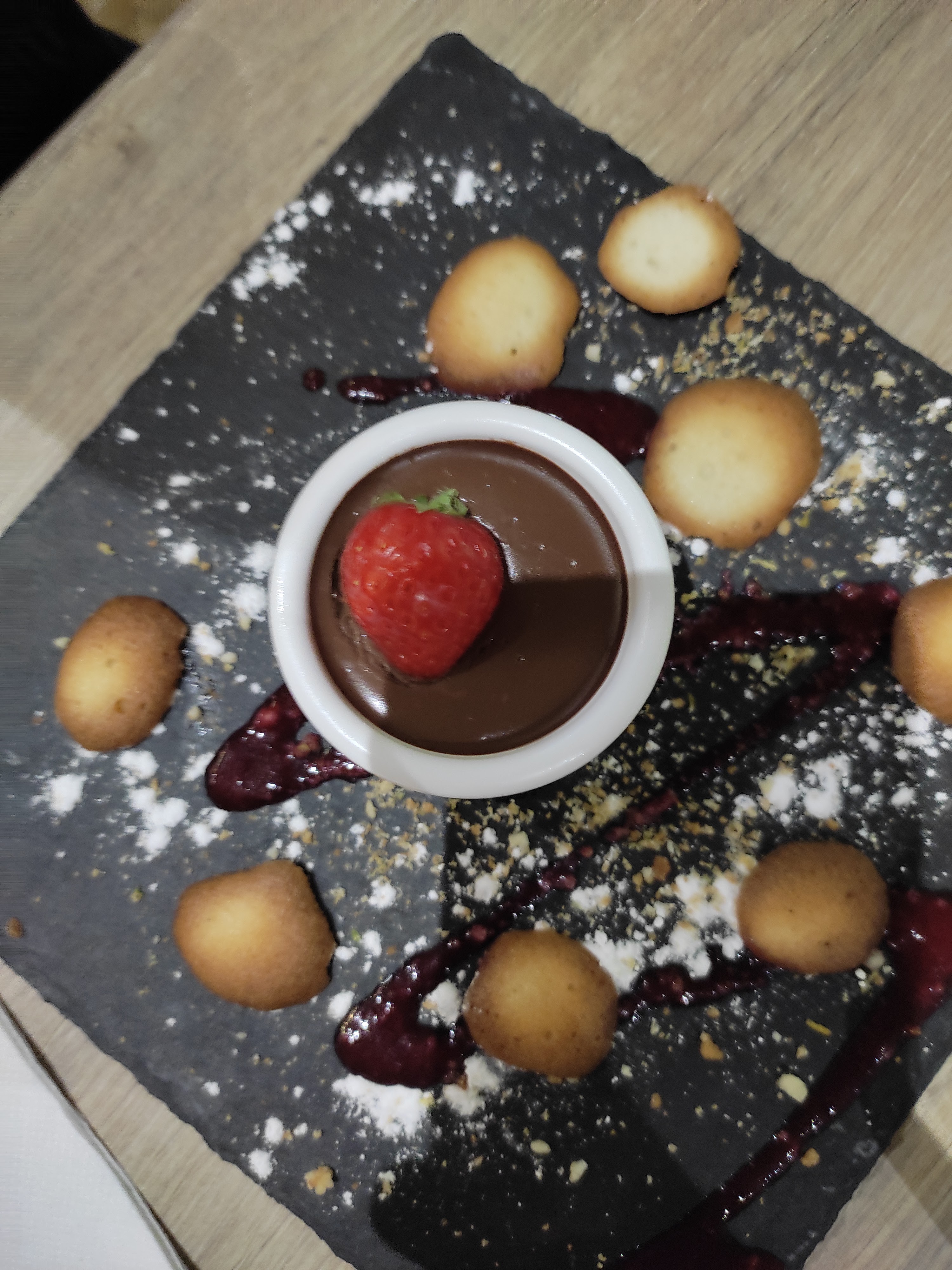 Nous avons attendu longtemps avant d'être servi, placés à une table où nous sentions de l air frais. Mon magret de canard était cru et non rosé, mousse au chocolat soi disant maison à fuir. C'est un vrai platras sans goût au lieu d une mousse maison onctueuse. Je l'ai signalé et demandé comment la mousse était faite. Réponse du serveur : avec des pastilles??? Ca fait peur...