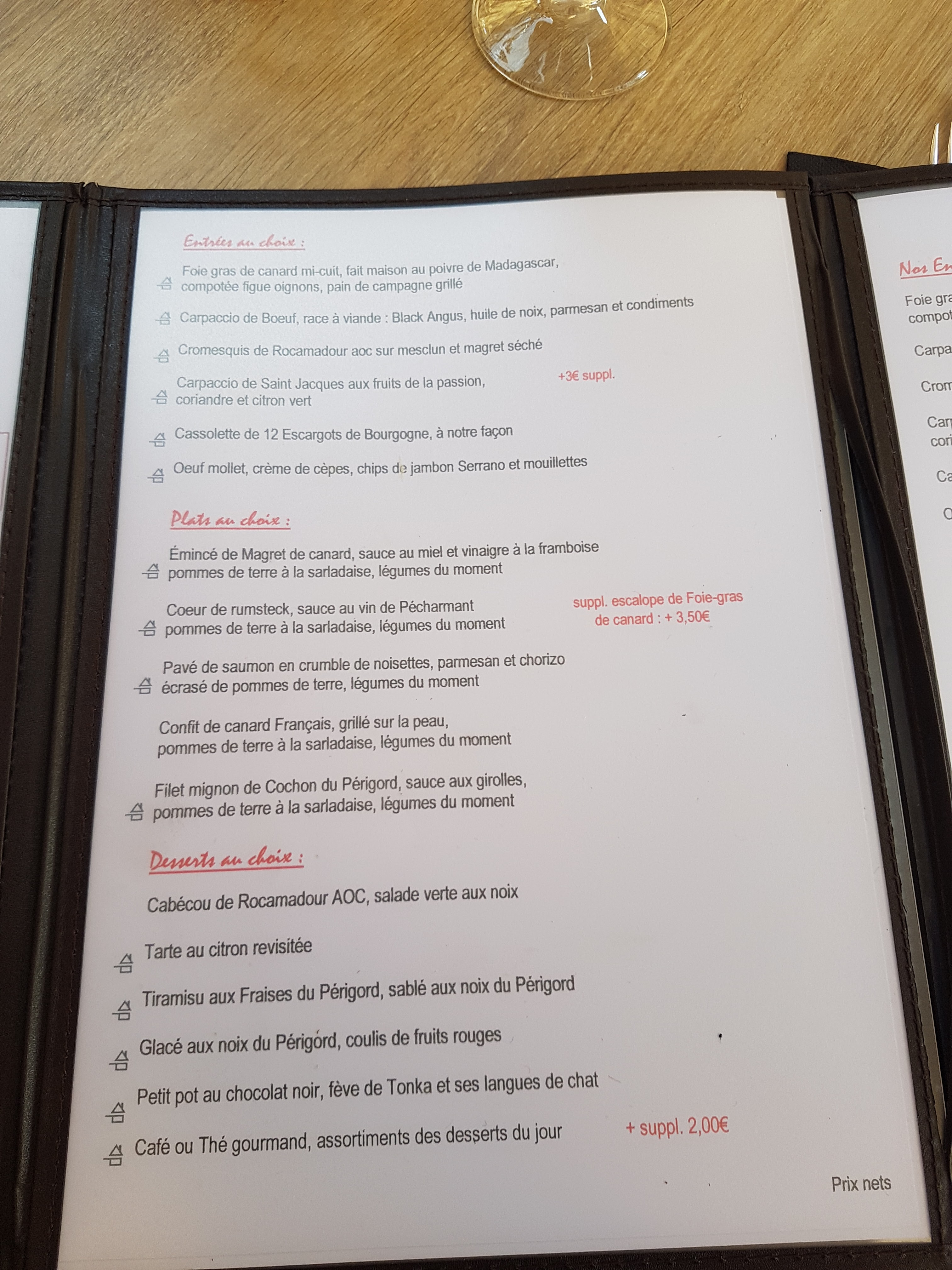 Visité le 9 décembre pour déjeuner. Arrivée tardive. L’accueil était excellent et chaleureux. Très bon rapport qualité-prix : un entrée / plat / dessert pour 27 euros. Une grande partie de la carte disposant de la mention « fait maison ». Service irréprochable. Menus périgourdins à tomber : soupe à l’oignon, magret de canard ... Je recommande.