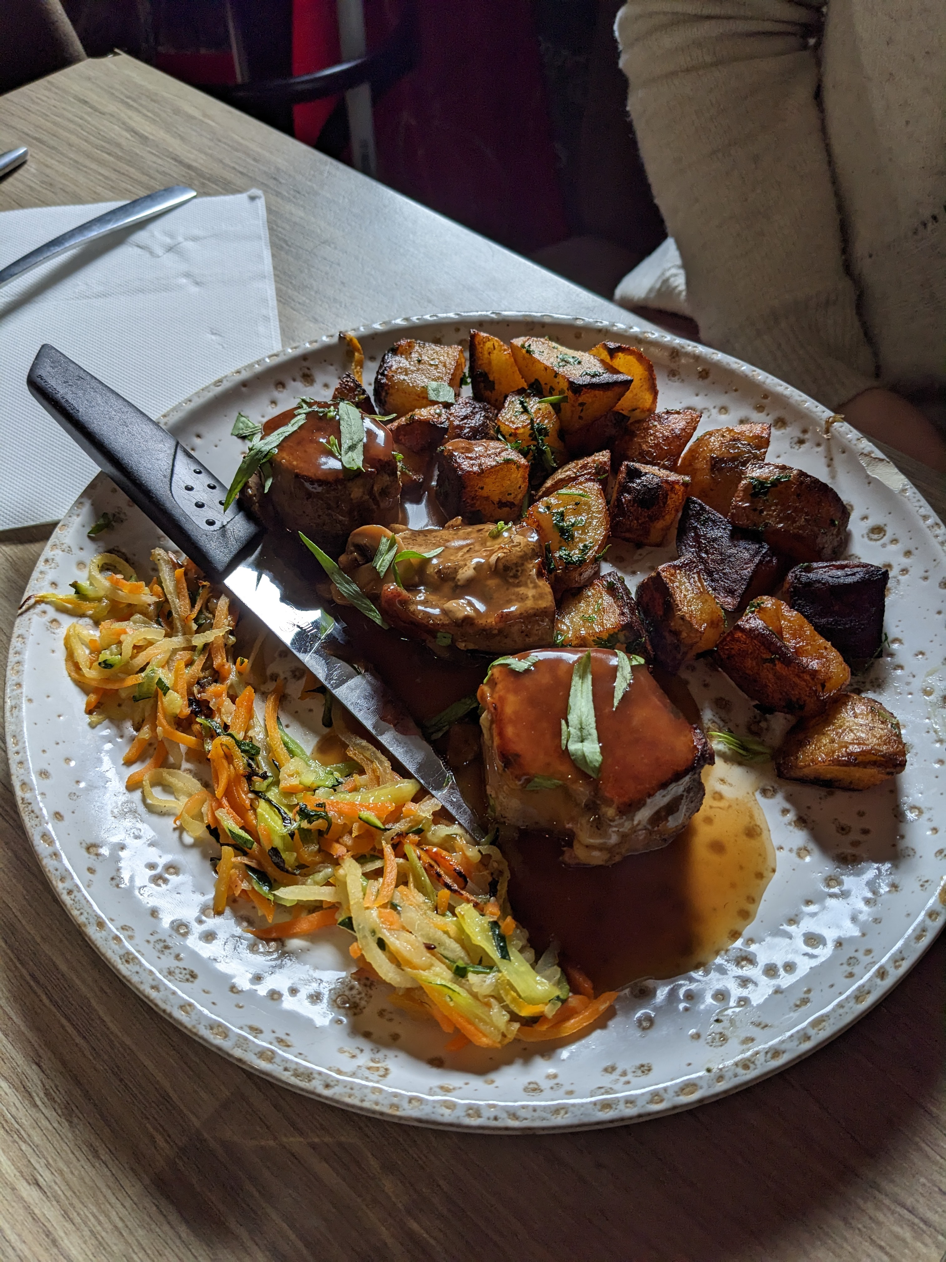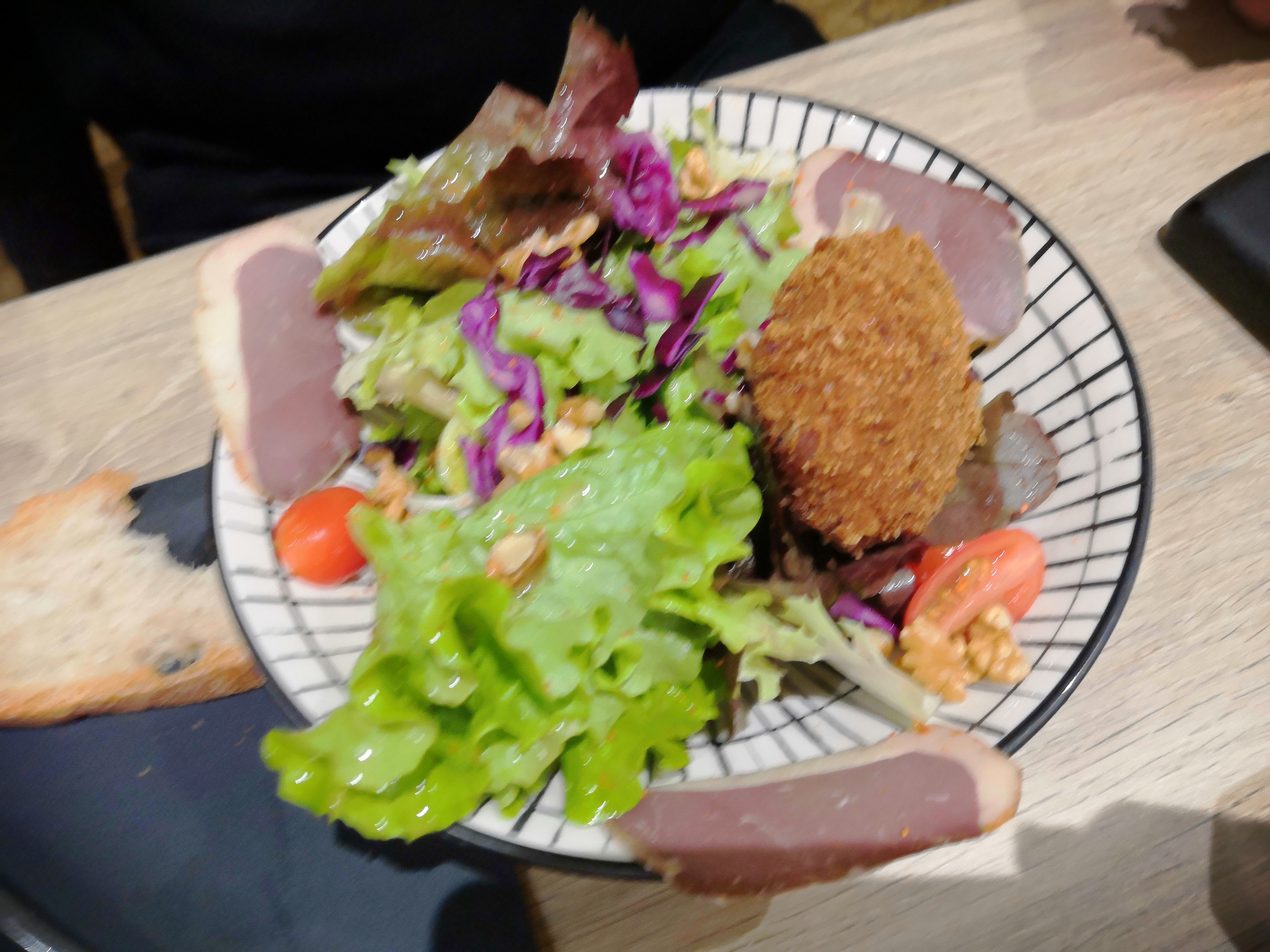 Dommage car le cadre est joli, et la carte donne envie MAIS ... Cuisine : Ingrédients de qualité mais mal travaillés. Les plats sont joliment présentés mais manquent de saveur (juste salés mais pas vraiment assaisonnés). Service : avec le sourire mais désorganisé et pas d'attention minimum au confort du client. 1h d'attente entre les plats sans même des excuses sur l'attente. Le serveur ouvre en grand la porte à côté de notre table, merci pour les courants d'air froids pendant 5min. La dame au comptoir (gérante ?) est complètement à la ramasse et manque de professionnalisme. Erreur à l'addition. Quand on se retrouve en tant que client.e à s'adapter et prendre sur soi, c'est que la notion de service client n'existe pas. Recette du parmentier à revoir : 3 couches compactes de pommes de terre écrasées + une fine couche de canard effiloché + 1 tranche de fromage au noix fondue (dont on ne sent pas le goût de la noix), ça ne vaut pas 18€. Même avec un joli dressage. Ça sert juste à plâtrer l'estomac.