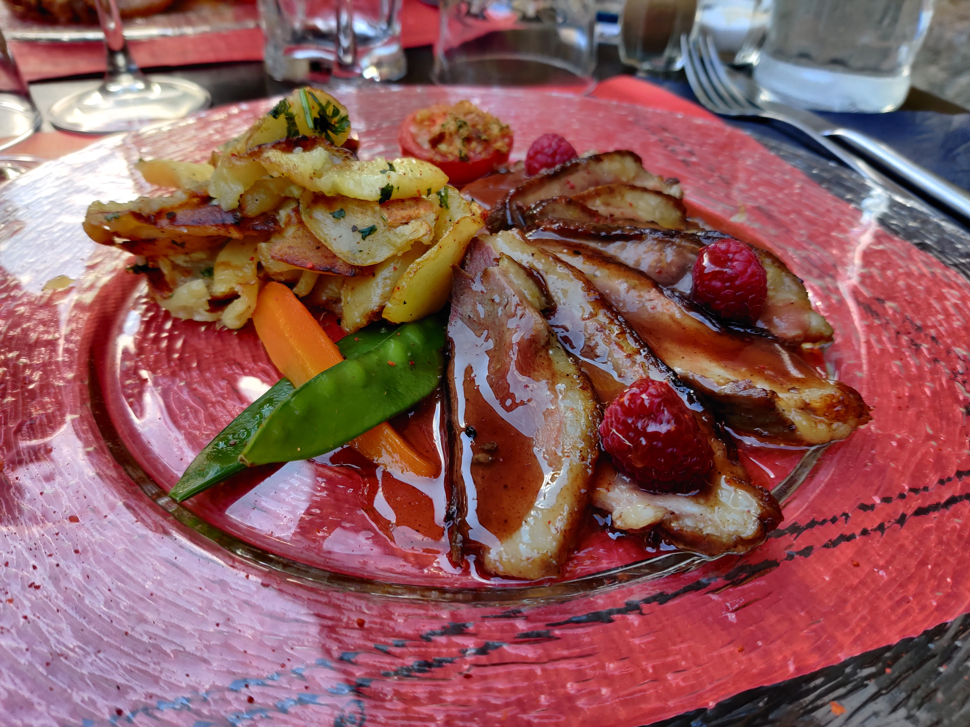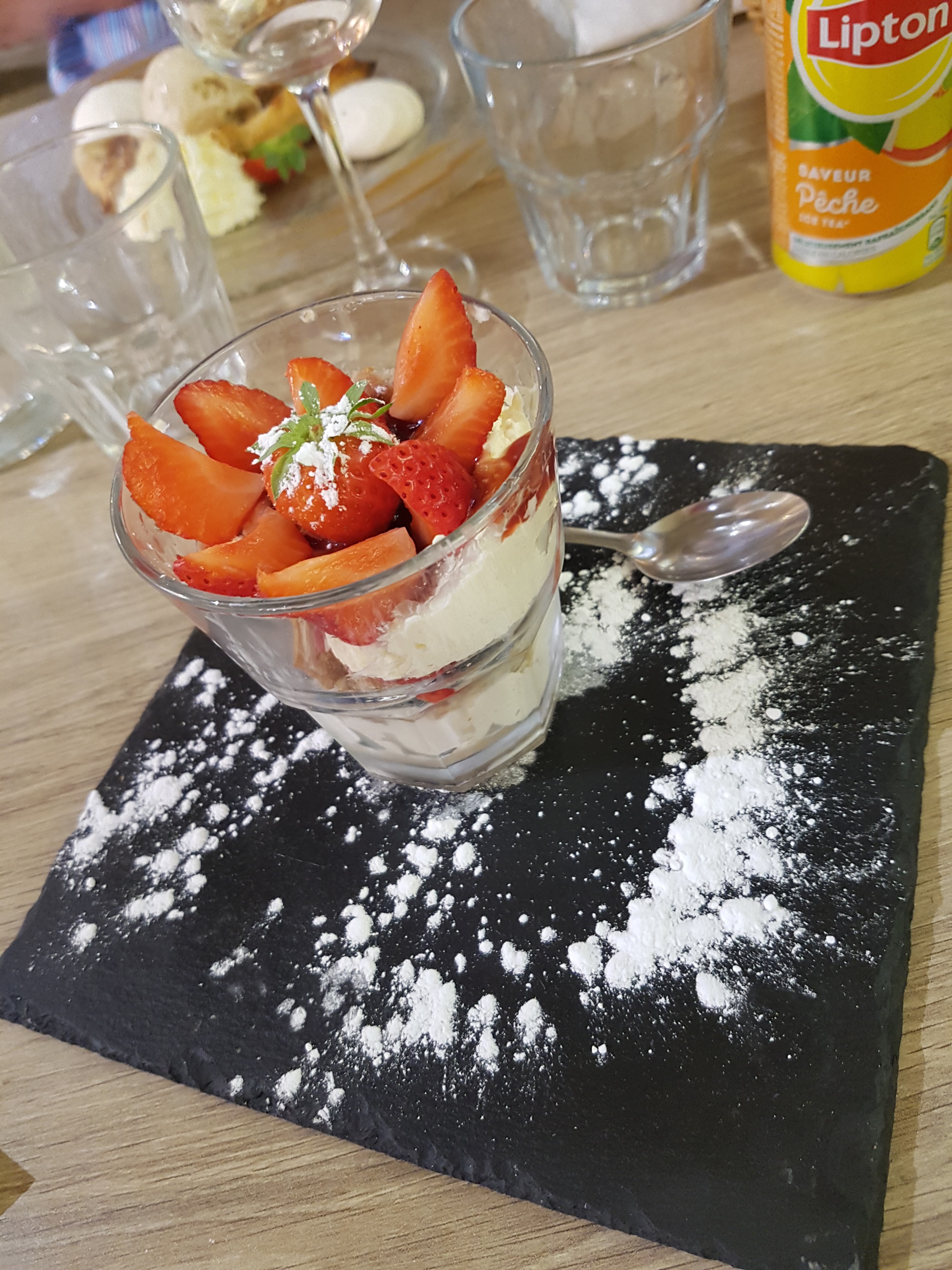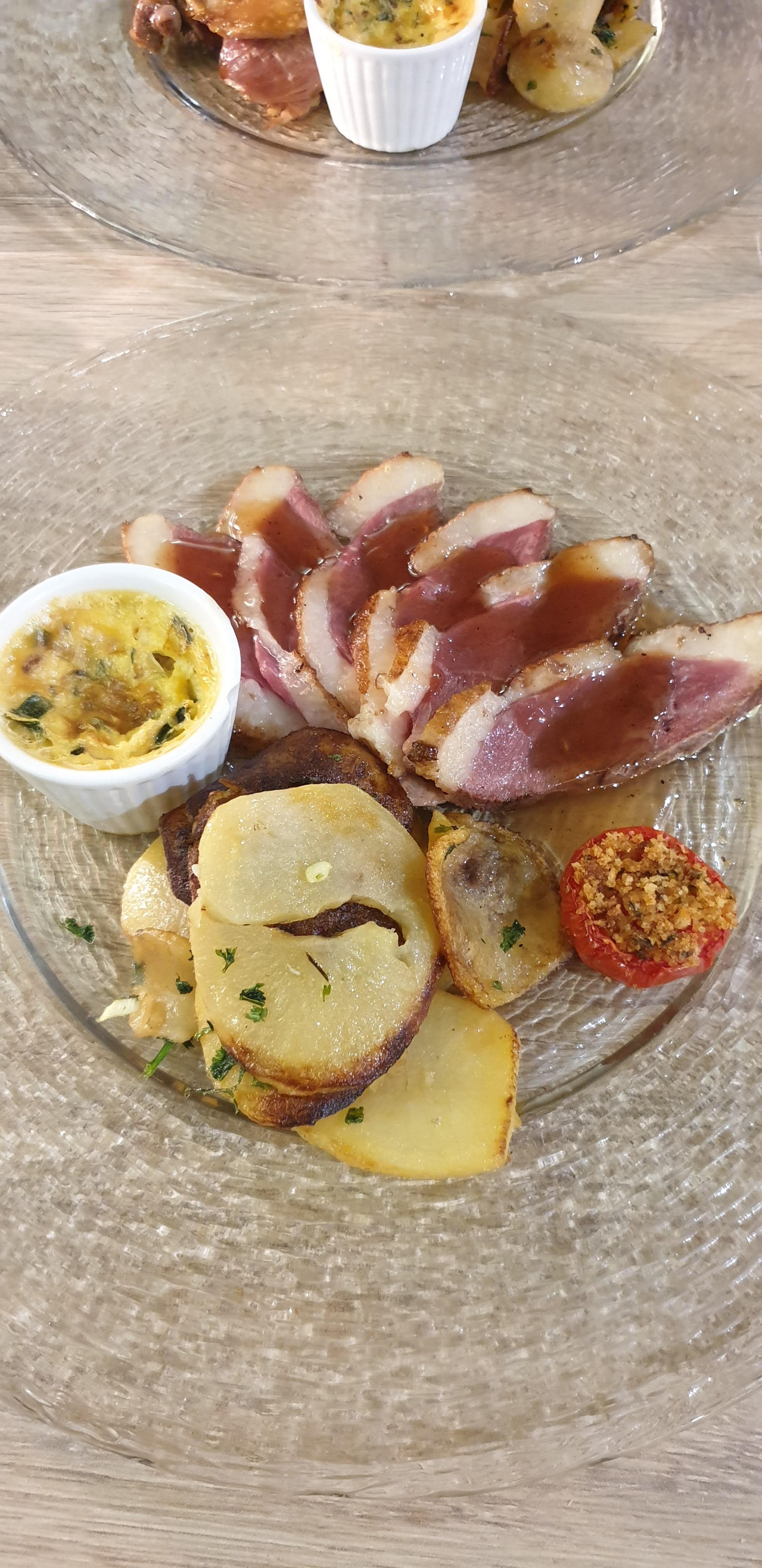 On a très bien mangé en quantité raisonnable donc pas ballonné 😂 l'émincé de magret au miel et vinaigre de framboise je vous recommande ainsi que le tiramisu a la fraise car c'est délicieux 🤤 rien que d'écrire j'ai envie d'en remanger... Pensez a réserver 😉