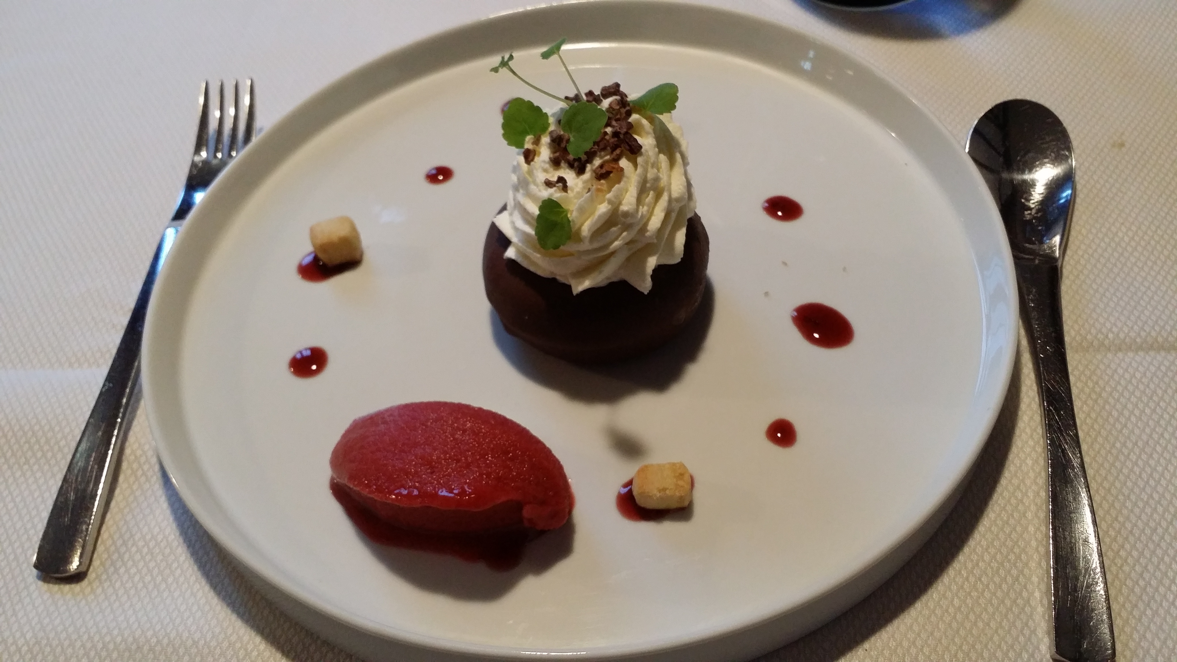 Resto gastronomique, super bon: en plat: Merlu coques épeautre risotto, en dessert: croquant chocolat blanc fraises sorbet basilique, une vraie tuerie!