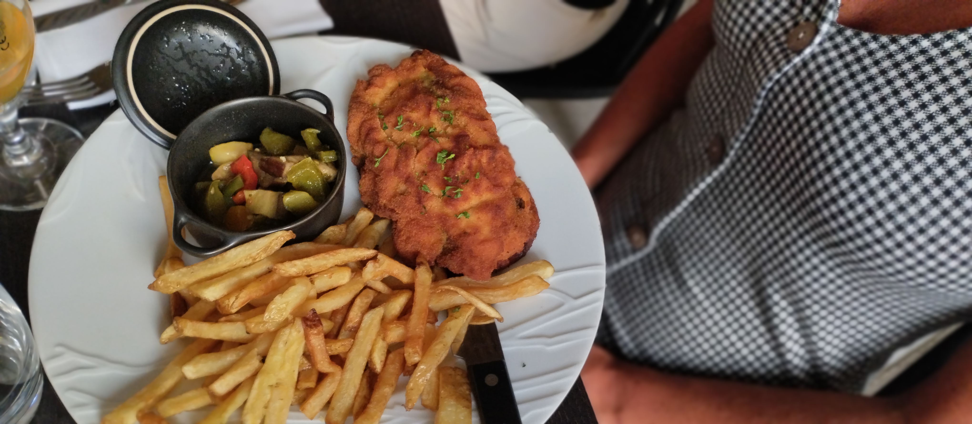Alors on était à 2 et notre commande a été prise avant la table de 8 Pas de chance la table de 8 servis avant nous Frites maison bien mais pas pelés, dommage Onglet de bœuf grillé mais froid mais geste commercial, apero offert , là je dis bien