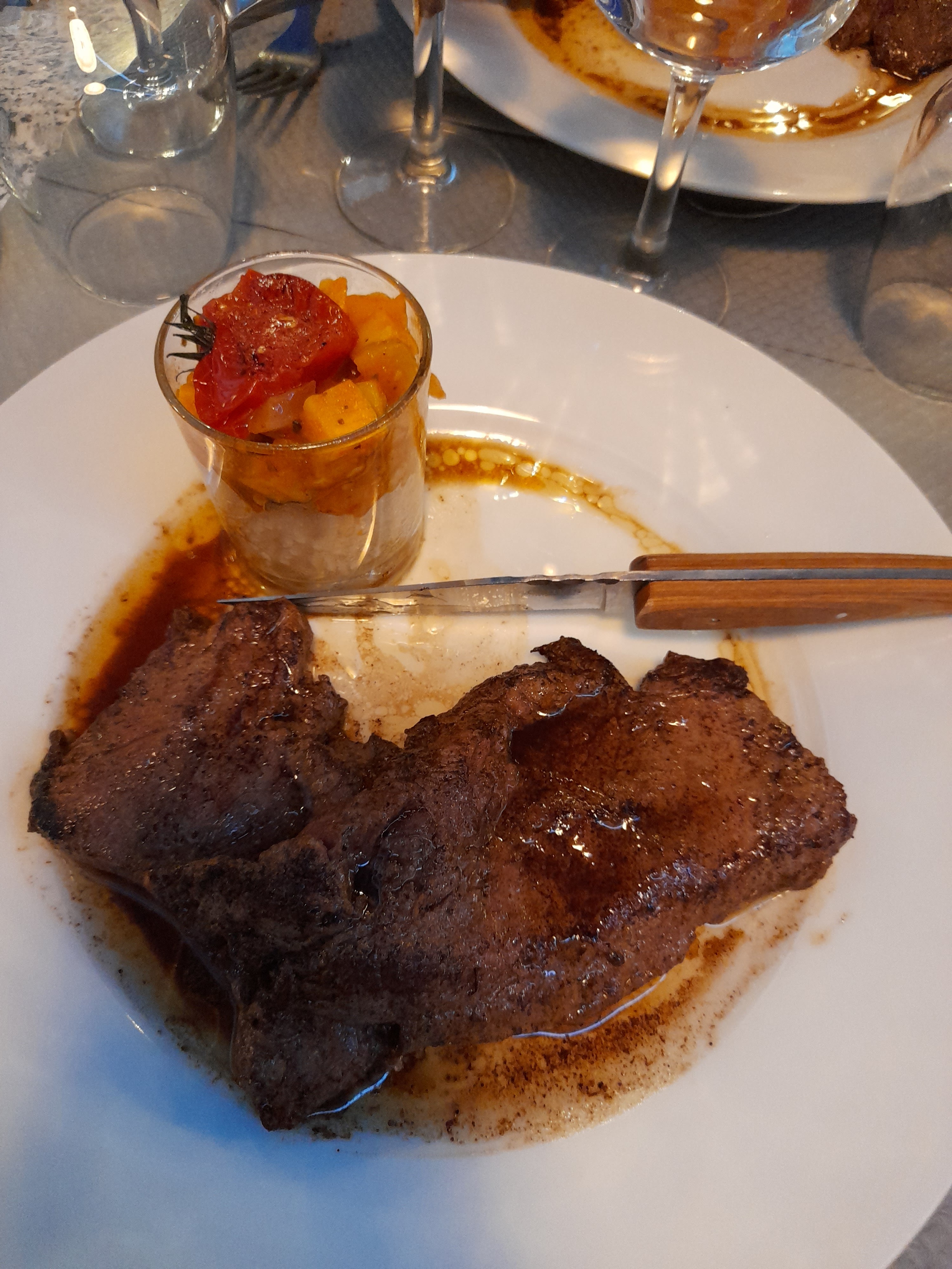 Un cadre idyllique pour un délicieux repas. Nous avons eu de la chance, il y avait encore une table de libre en terrasse, un samedi soir, alors que nous n'avions pas réservé ! A ne pas faire... Je vous conseille de réserver. La viande était succulente. Seul bémol si je veux chipoter, j'aurais aimé que la viande soit un peu plus saisie mais franchement c'était un régal
