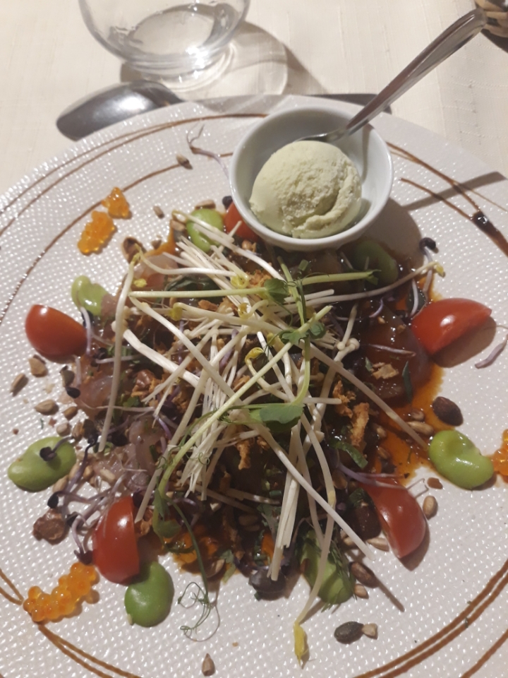 Un restaurant avec un cadre magnifique .nous avons mangé une entrée et un plat Délicieux avec Des produits de qualité un mélange sucré salé fait avec goût . Des gens très agréables .je recommande