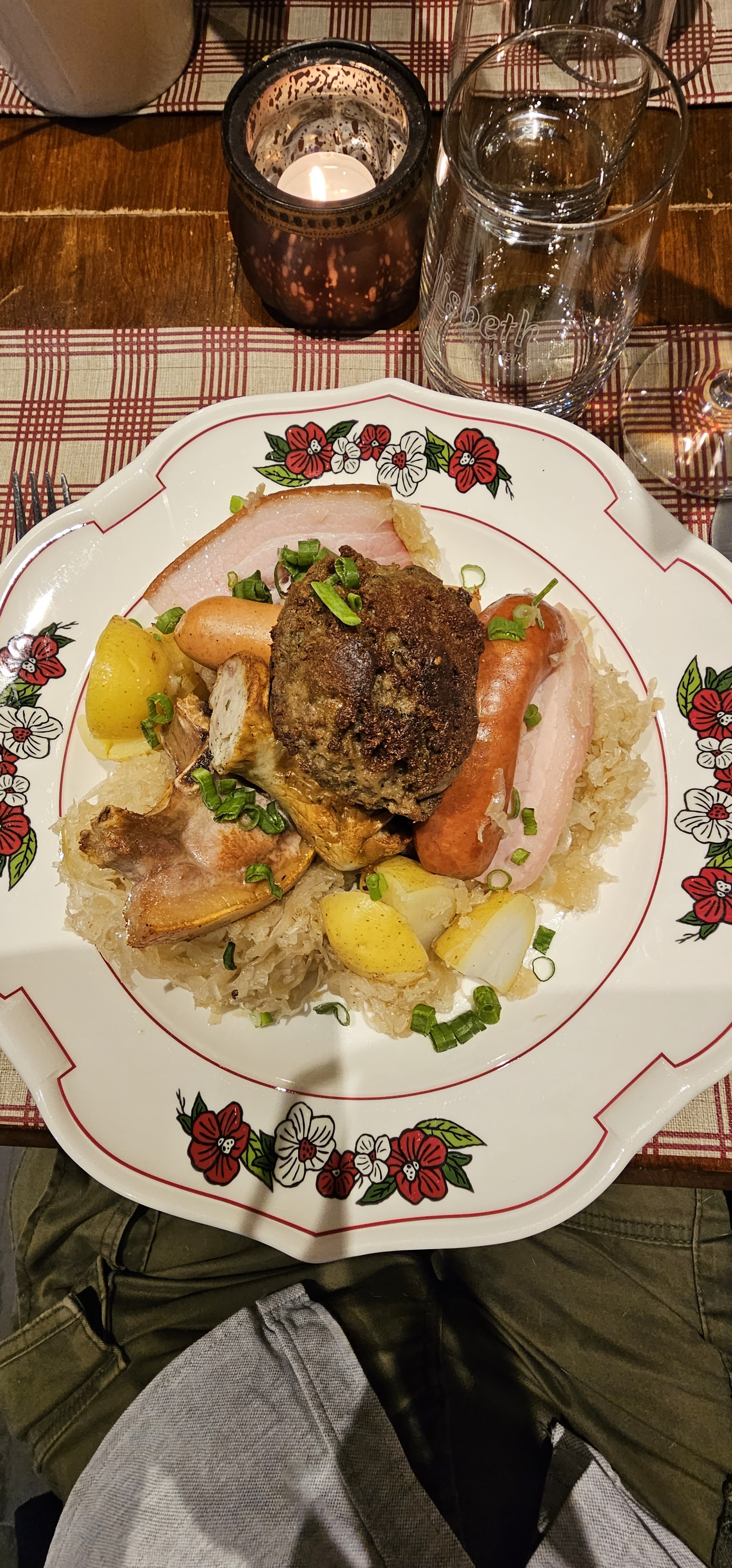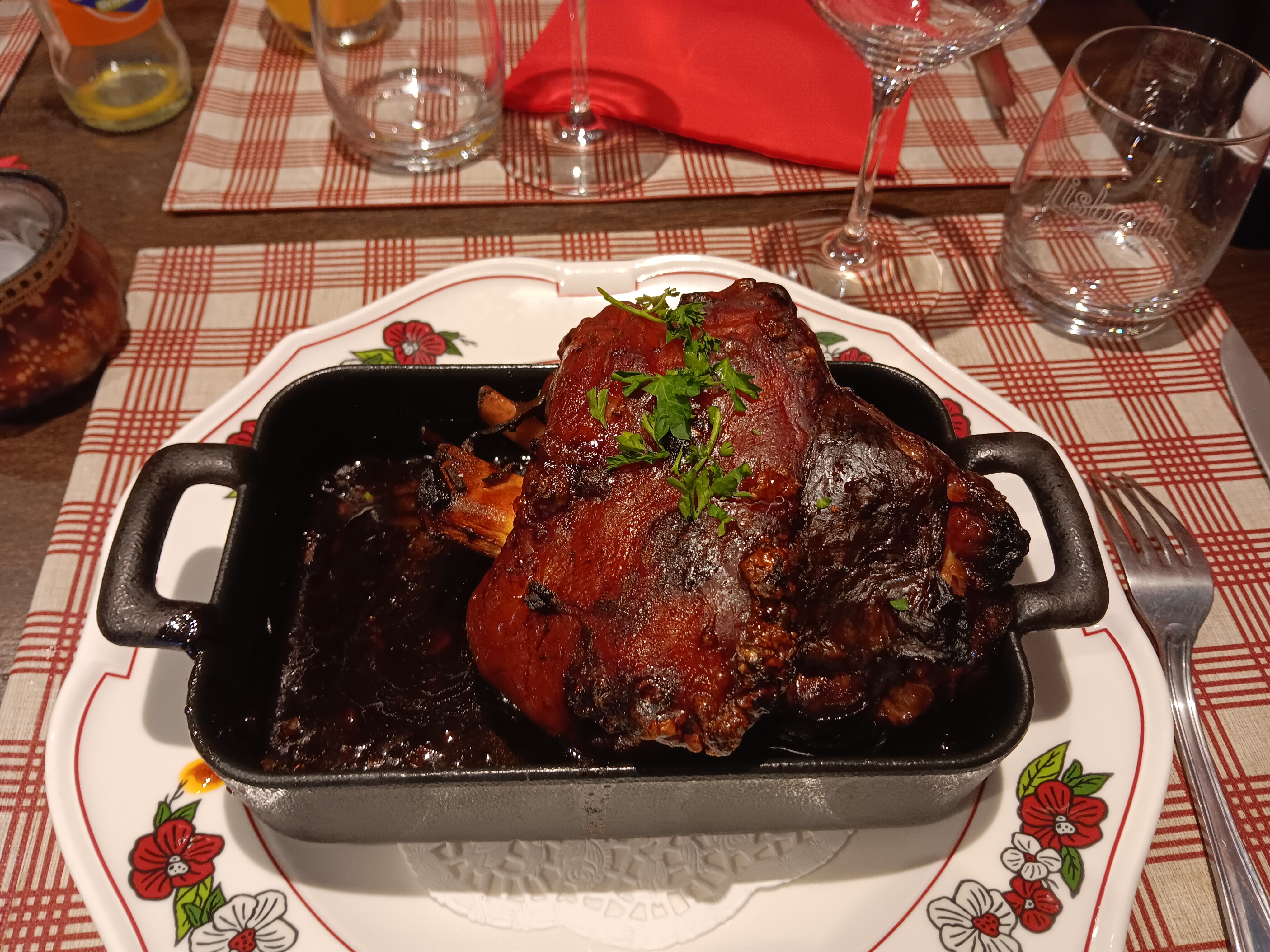 Nourriture délicieuse. Vins de très bonne qualité et offres hiver/Noël. Les prix ne sont pas plus chers que dans d'autres restaurants. Délicieux jarret de porc. Apéritif traditionnel inclus dans le prix, eau et pain gratuits. J'y reviendrai un jour 🙏