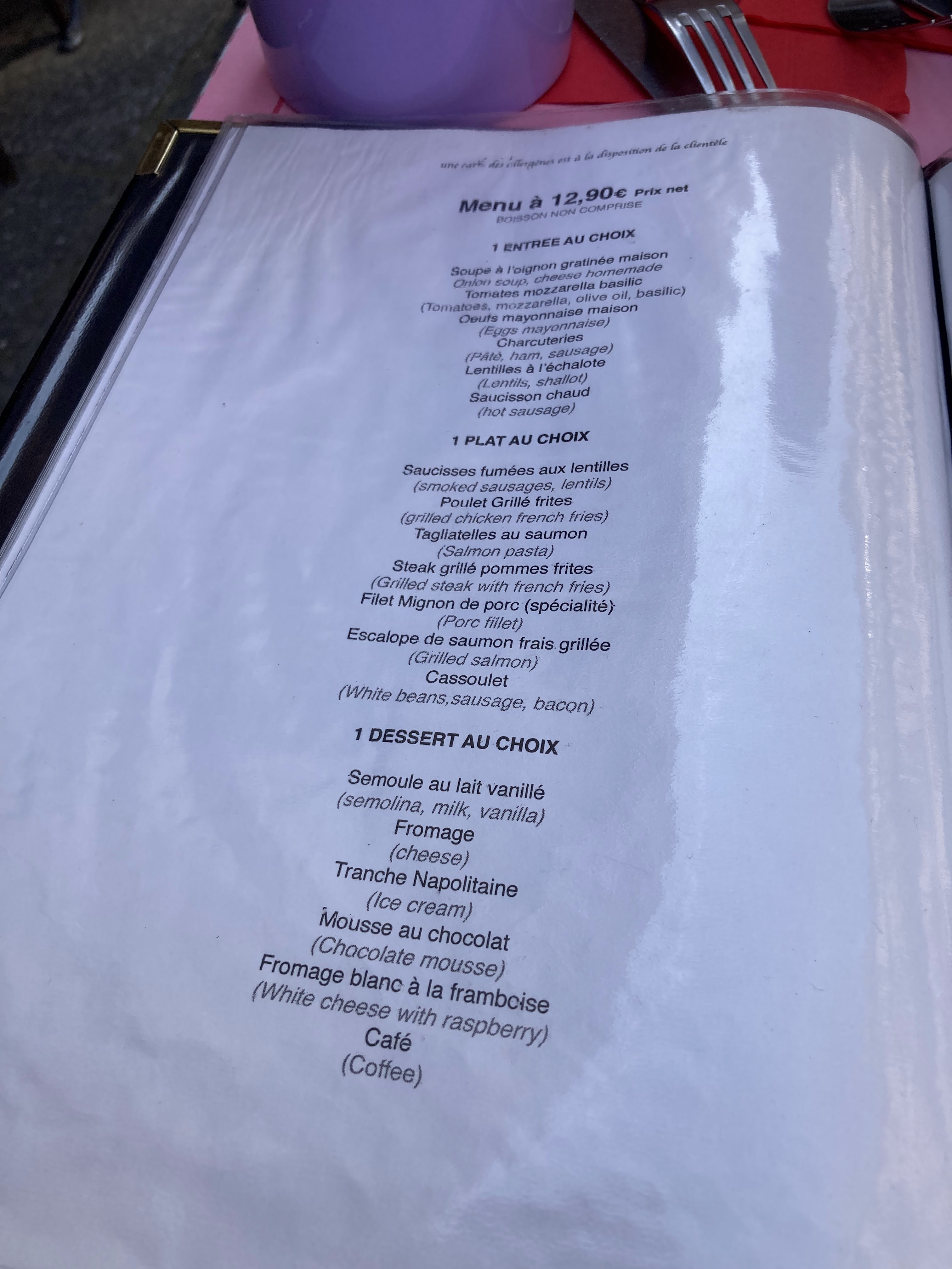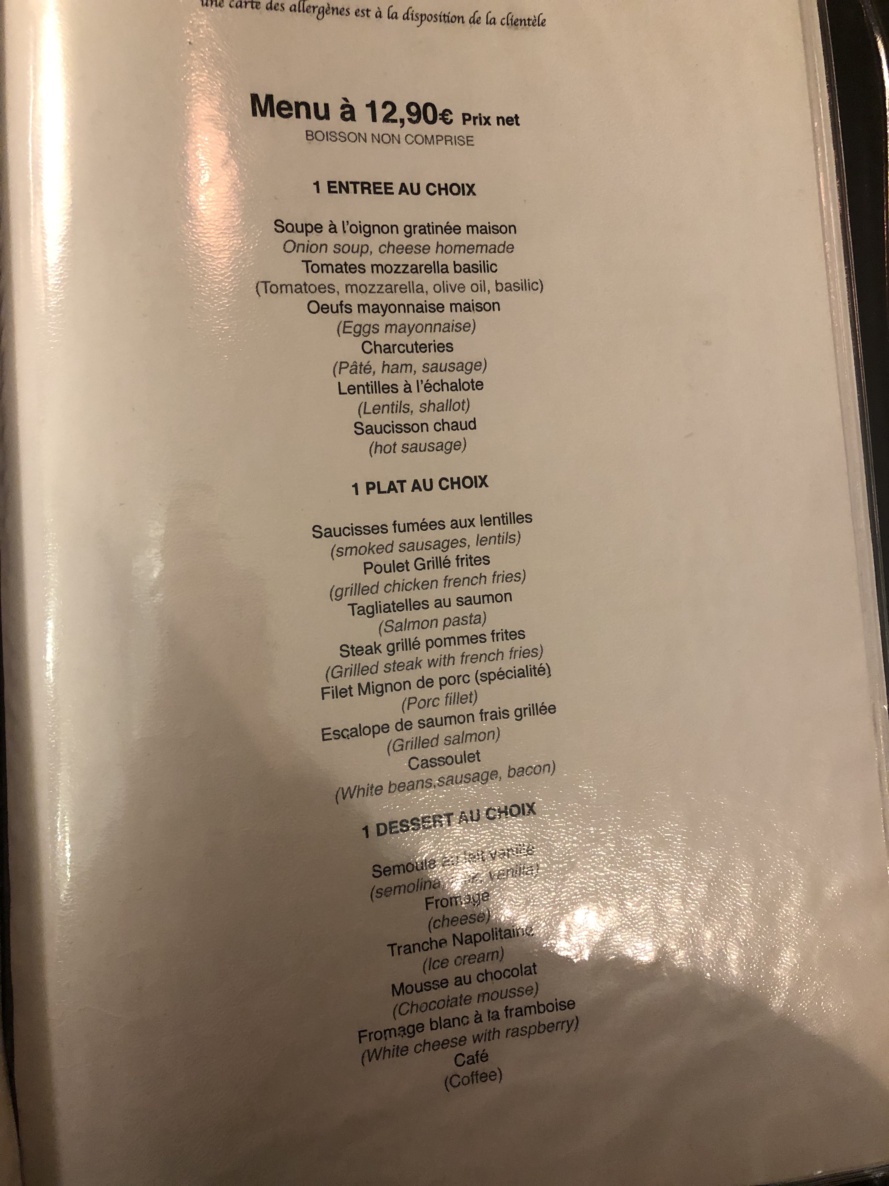 12,90 euros le menu ou 17,90 euros le menu premium le midi. Absolument délicieux pour le prix. Après quelques dîners raffinés et beaucoup de nourriture de rue des marchés de Noël, c'était parfait entre les deux. Cela m'a rappelé beaucoup de cuisine campagnarde qui n'était pas touristique dans des régions comme la Loire ou Reims. En ce qui concerne le service, il suffit d'être plus direct en France et de demander les choses poliment. Je pensais qu'ils étaient très attentifs quand on prend cela en compte.
