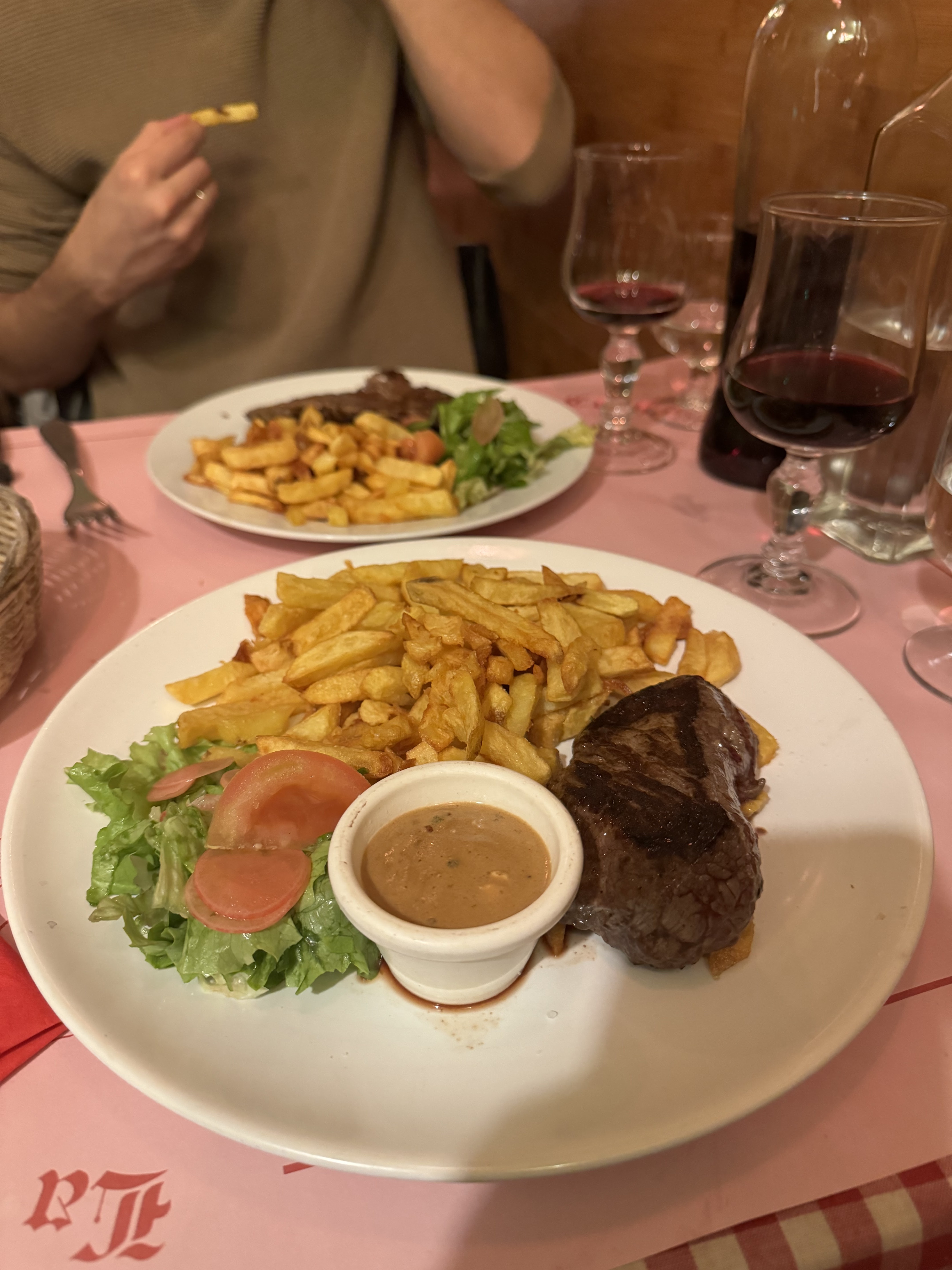 Le MEILLEUR pour moi : soupe à l'oignon sans chichi, steak frites, mousse au chocolat, carafe de rouge maison pour 2 couverts plus cognac à moins de 50 euros et l'eau à la bouche !