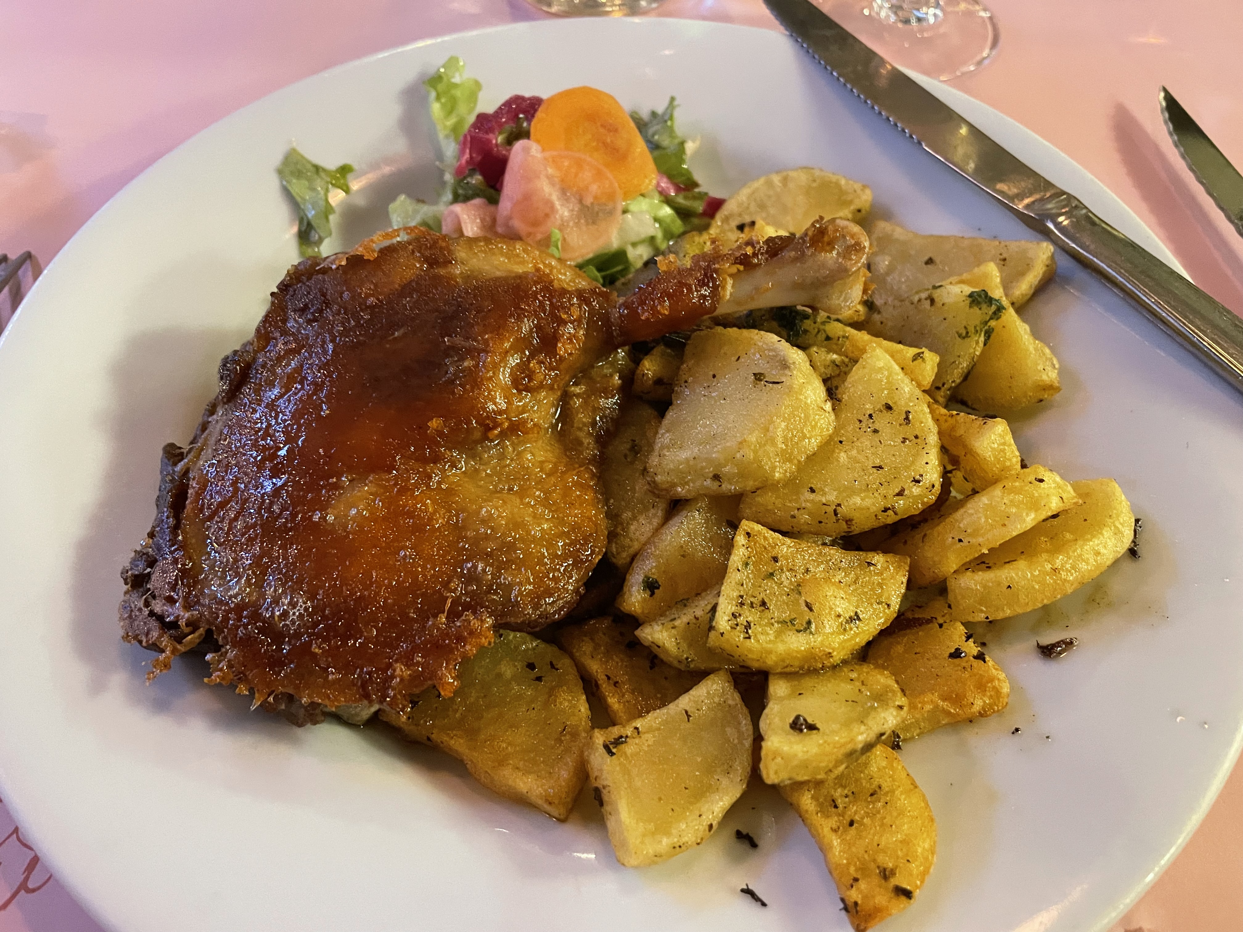Soupe à l'oignon et canard très délicieux à bon prix. C'est un petit restaurant, les sièges auraient pu être plus confortables et il faisait un peu plus froid à l'intérieur que ce que nous préférerions, mais la nourriture était très savoureuse et d'un prix raisonnable (si vous prenez le menu). Il existe plusieurs menus pour 12-17-22 euros selon la nourriture que vous souhaitez manger.