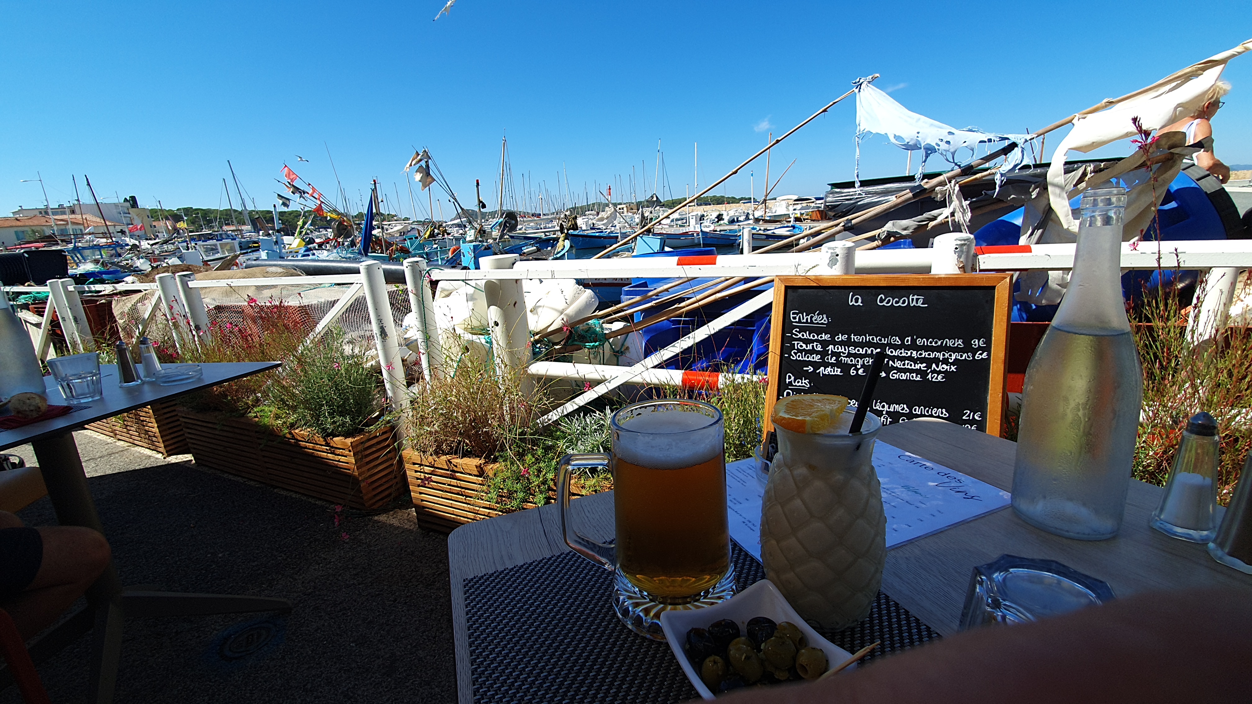 Soupe au pistou délicieuse + Vue sympa sur le charmant petit port du Brusc + Rapport Q/P correct + La jeune serveuse polie, à l'écoute et efficace. = Déjeuner très sympa