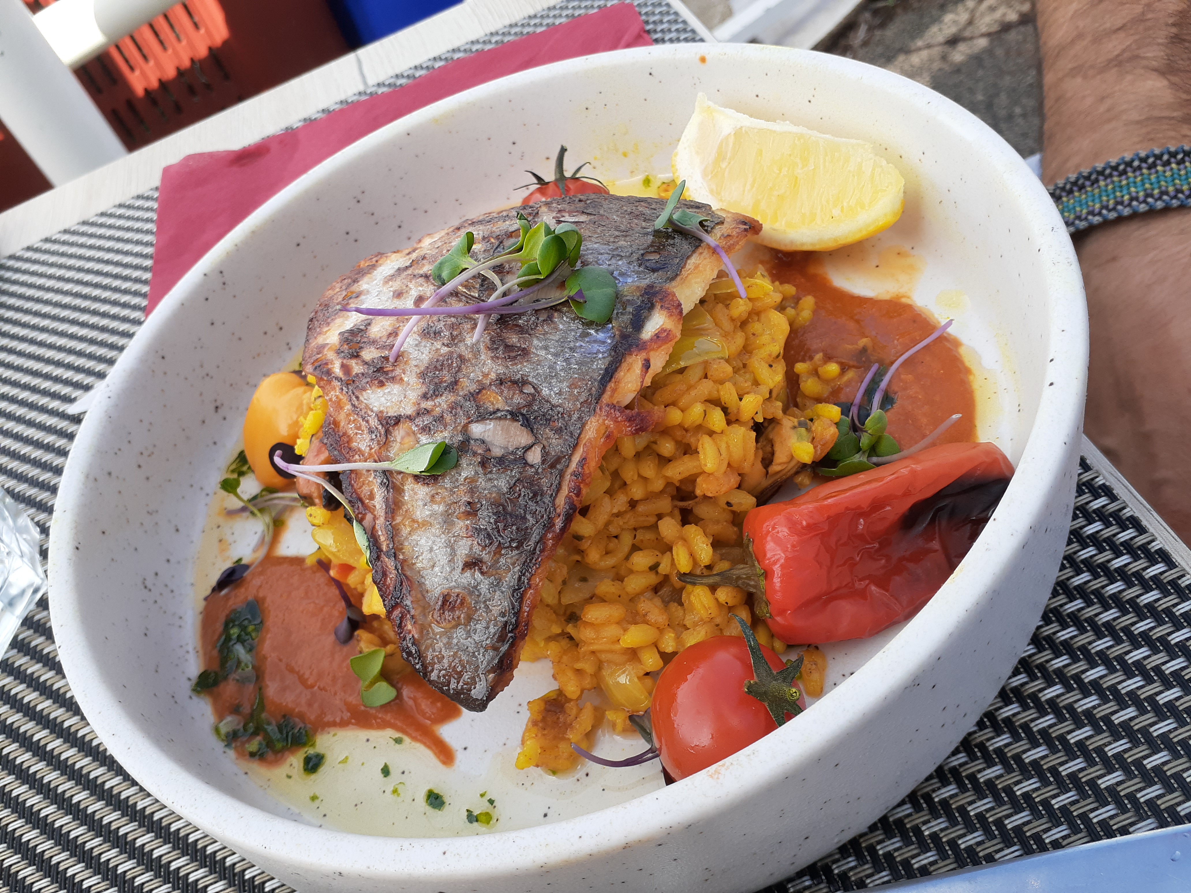 Moment suspendu sur la petite terrasse ombragée de ce restaurant. Dorade entière succulente, « service sourire », parfait !