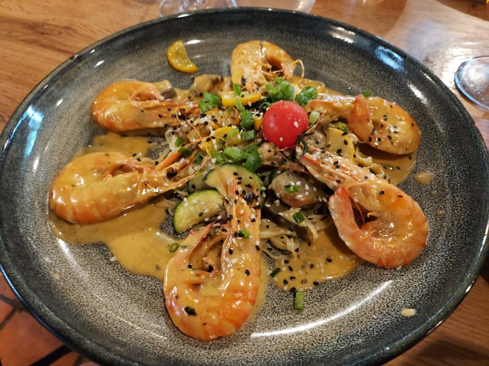 Belle terrasse avec ombre. Crevettes impériales 5 pour 28 € il pourrait en avoir 6 cela fait mescain.