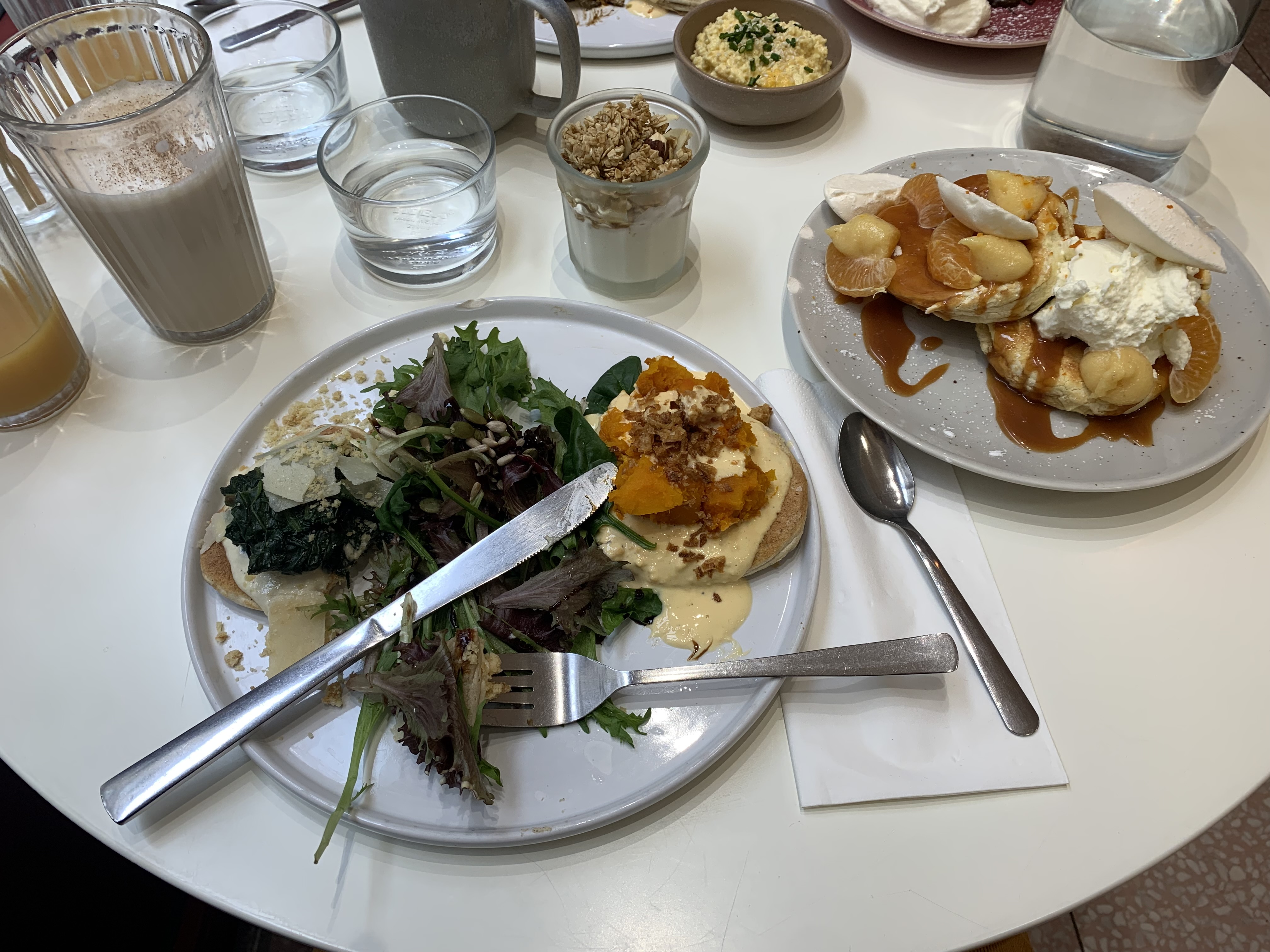 Nous avons bruncher. Boissons chaudes : golden latte et chocolat chaud blanc. Boissons froides: jus de pommes et thé glacé hibiscus et sureau. Pancakes salés : veggie et potimarron chorizo Pancakes sucrés : caramel beurre salé et pâte à tartiner. Dommage pancakes salés froids (pas tièdes) pour ma part et les sucrés n'étaient pas assez fluffy cette fois ci à mon goût. Je ne dis pas que c'était mauvais... Accueil parfait.