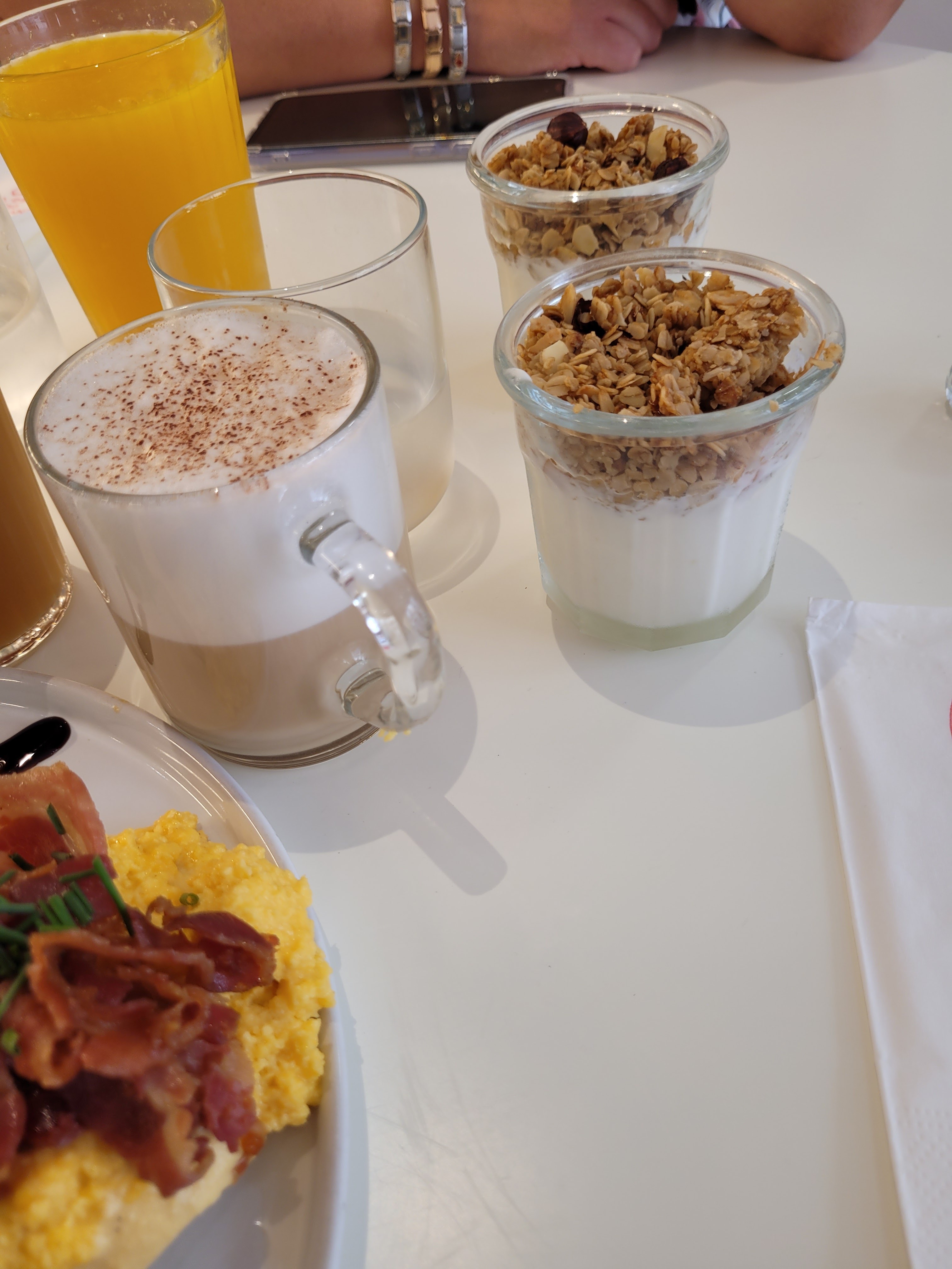Lieu très beau, et brunch excellent (2 pancakes salés, 2 pancakes sucré, et pour accompagner cela soit Muslim, soit oeufs brouillés+ boisson chaude et froide). Je trouve juste qu'il manque l'option d'une petite salade de fruit.