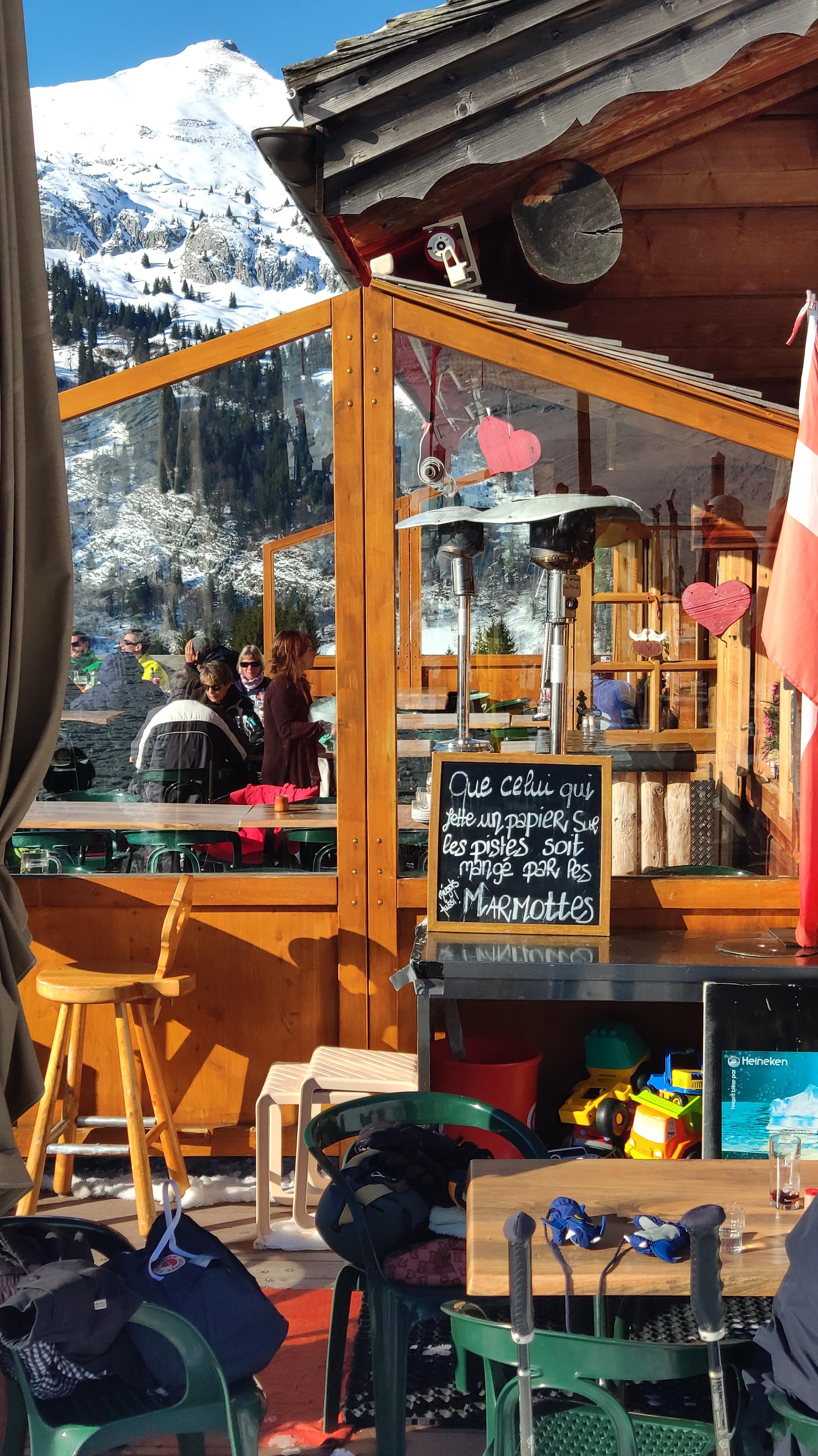 Très bel endroit. Terrasse chauffée donnant directement sur les pistes, notamment la serpentine, piste verte, permettant d'accéder à ce lieu et d'en repartir avec des skieurs tout débutant. Très prisé, venir avant 12h ou après 13h30 pour y déjeuner. Très bonne cuisine locale. Jus d'orange et jus de pommes chaud .... un délice!