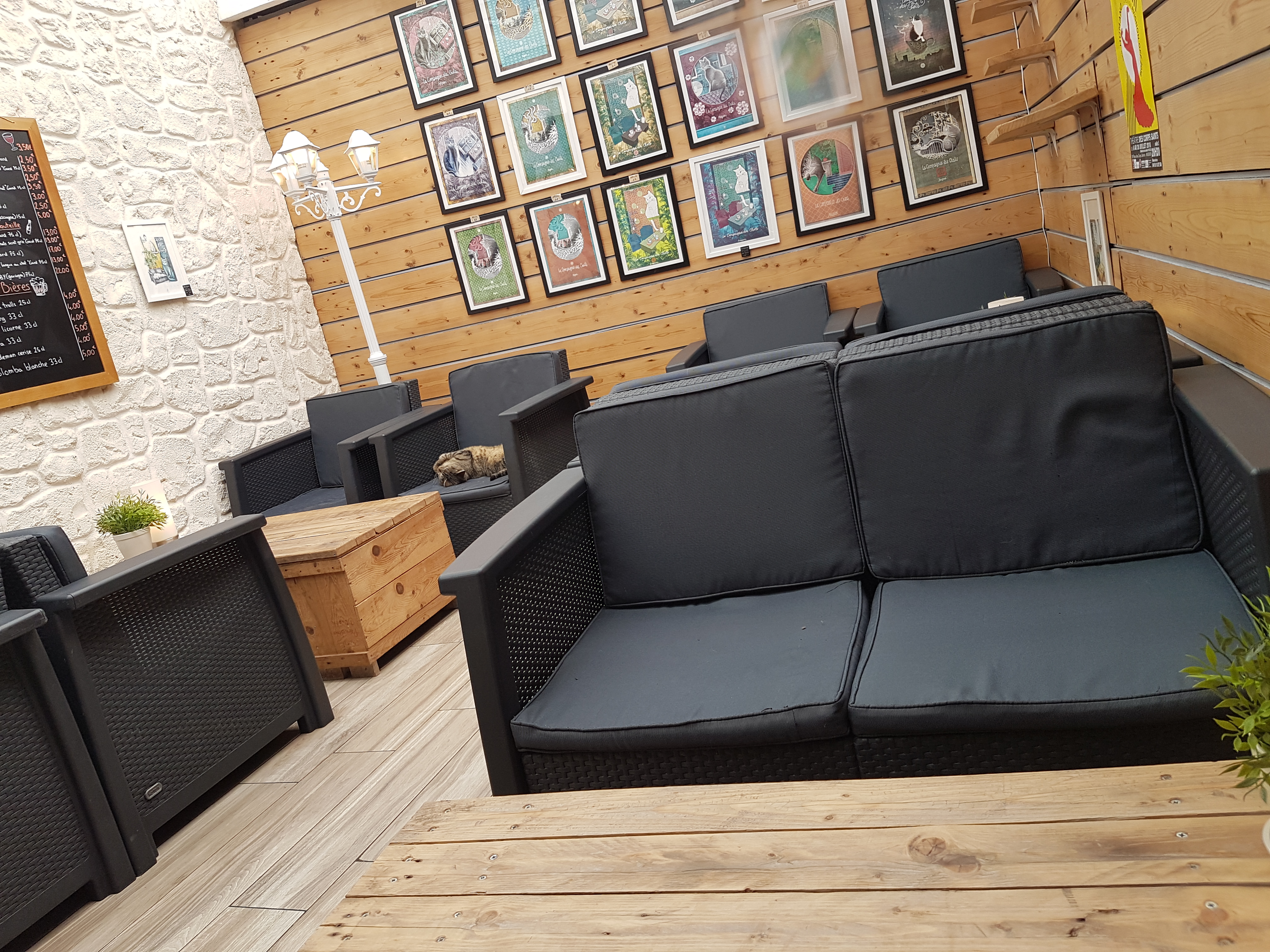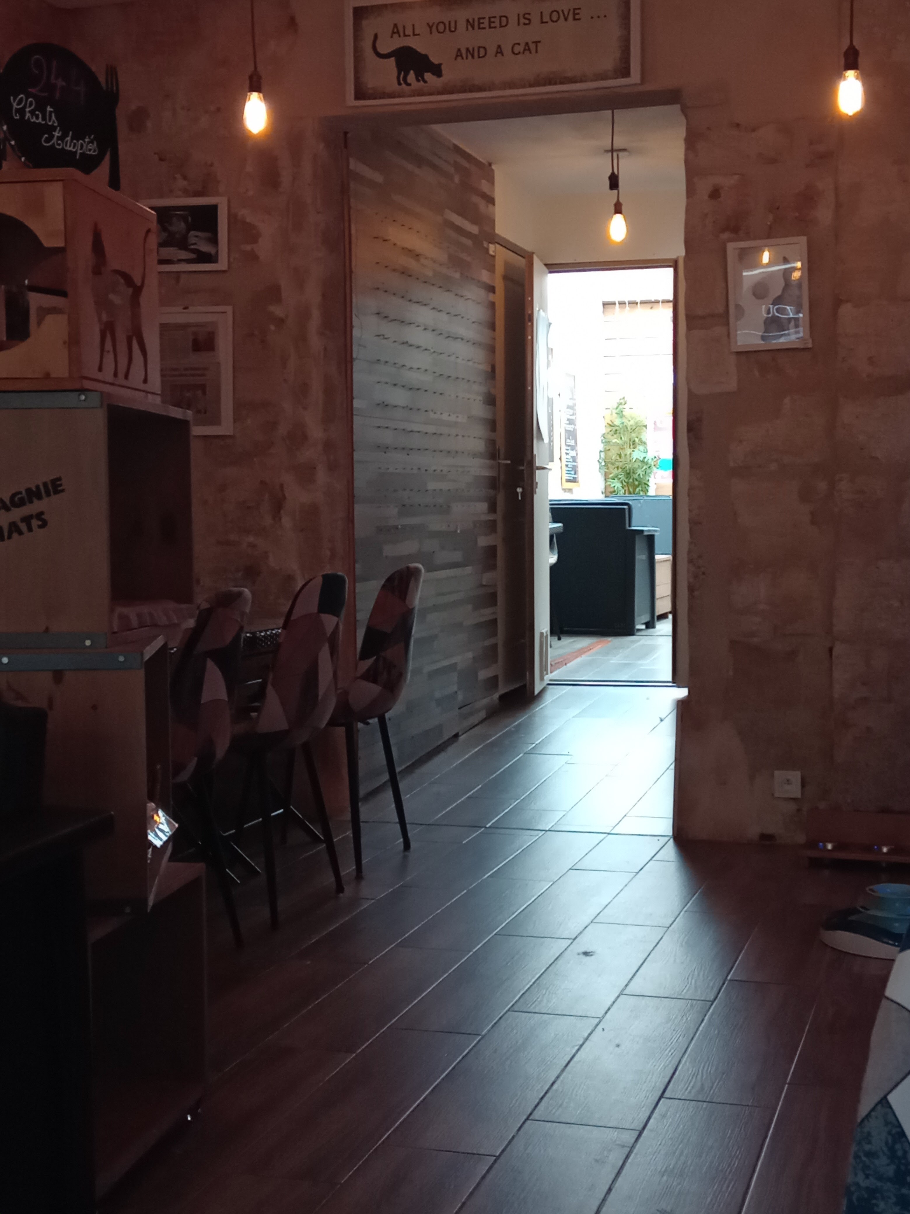 Endroit calme et agréable pour les chats et les humains en journée en revanche le soir l’ambiance n’est pas la même. Point positif vous avez la possibilité de repartir accompagné d’un nouvel ami à 4 pattes. Dommage que les tarifs soient un peu élevés 3,50€ le coca 7€ le hot dog etc...