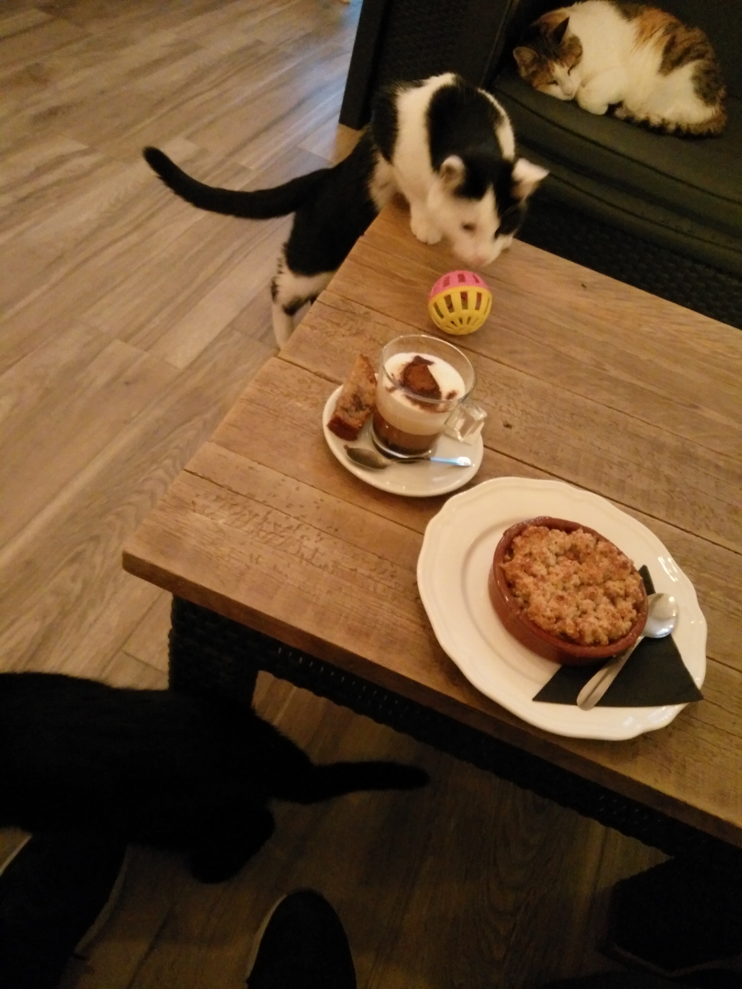Accueil impeccable. Nous y sommes allé au repas du soir. D'excellents desserts faits maison. Et des chats dans le café pour mettre l'animation, avec lesquels on peut jouer. Beau concept !