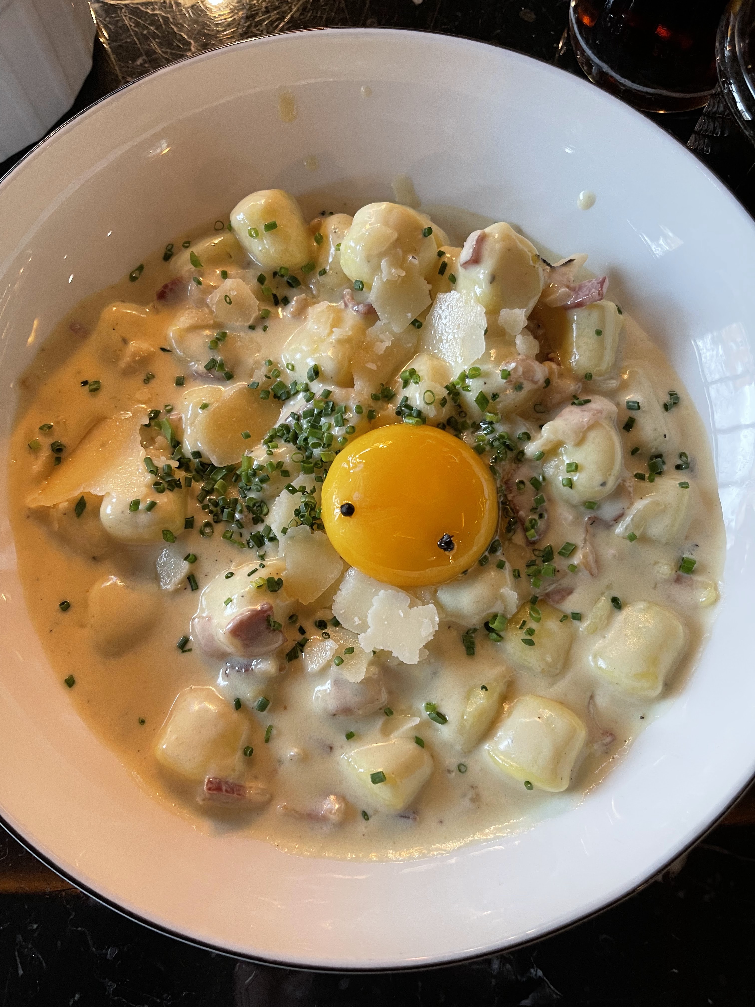 Les pâtes carbonara n'étaient pas du tout a la hauteur du prix.. 19 euros Compacte tiède a la creme Avec un tout petit peu de pancetta et parmesan a mettre soi même bien meilleures il y a deux ans. Les autres plats ont l'air bons.