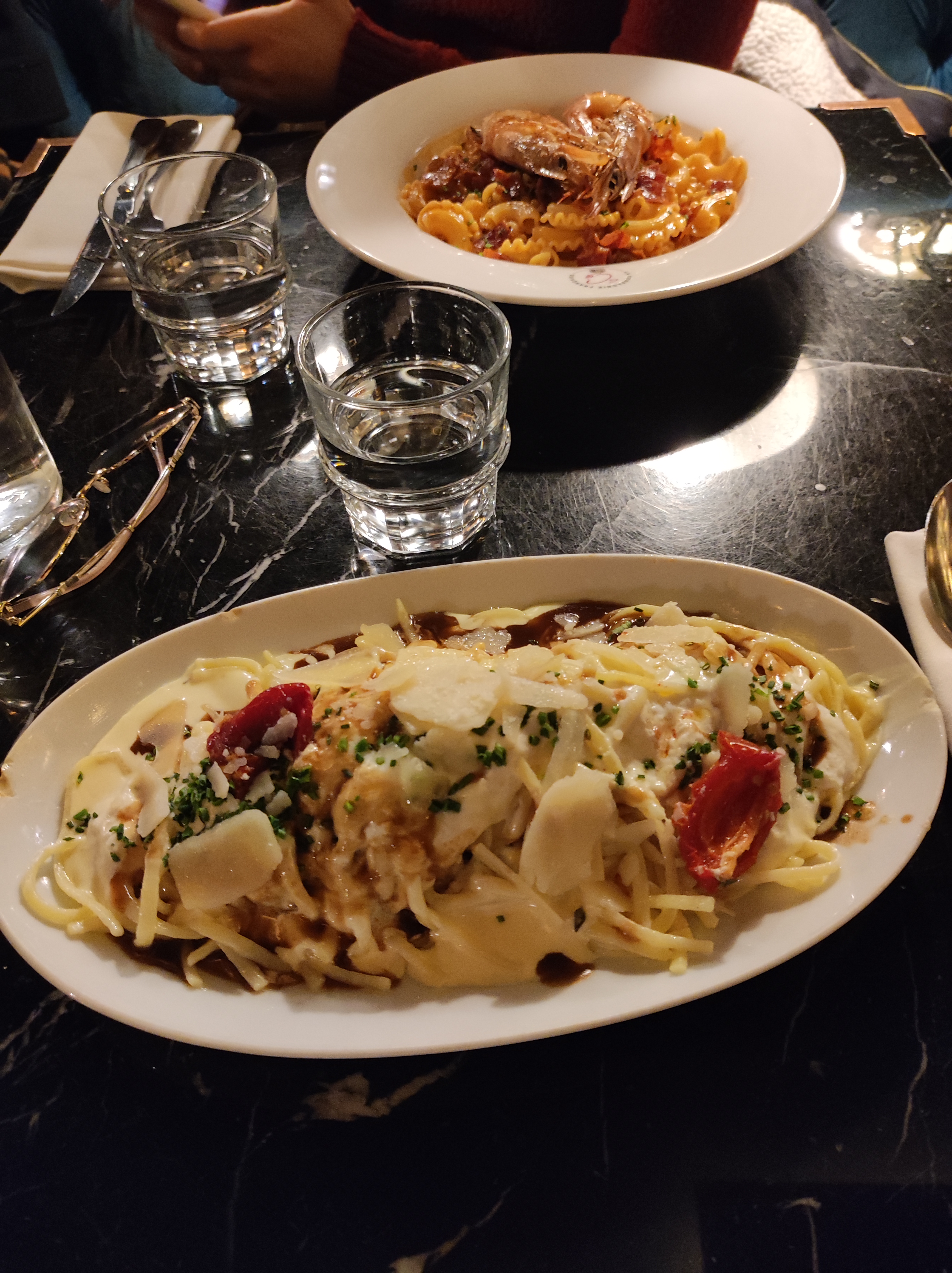 Les pizzas, les pâtes sont tops, je ne m'attendais à plus basique . J'enlève une étoile à cause du prix du plat Gran Spaghettoni. Plat pour 2 personnes, Le concept : baigner les spaghettonis dans une meule de parmesan et ensuite rajouter des morceaux de truffe. C'est excellent, et le spectacle du serveur est chouette cependant 31€ / personne pour ce plat (aussi bon soit-il) est à mon avis surpayé. Quoi qu'il en soit les serveurs sont agréables et on passe un très bon moment.