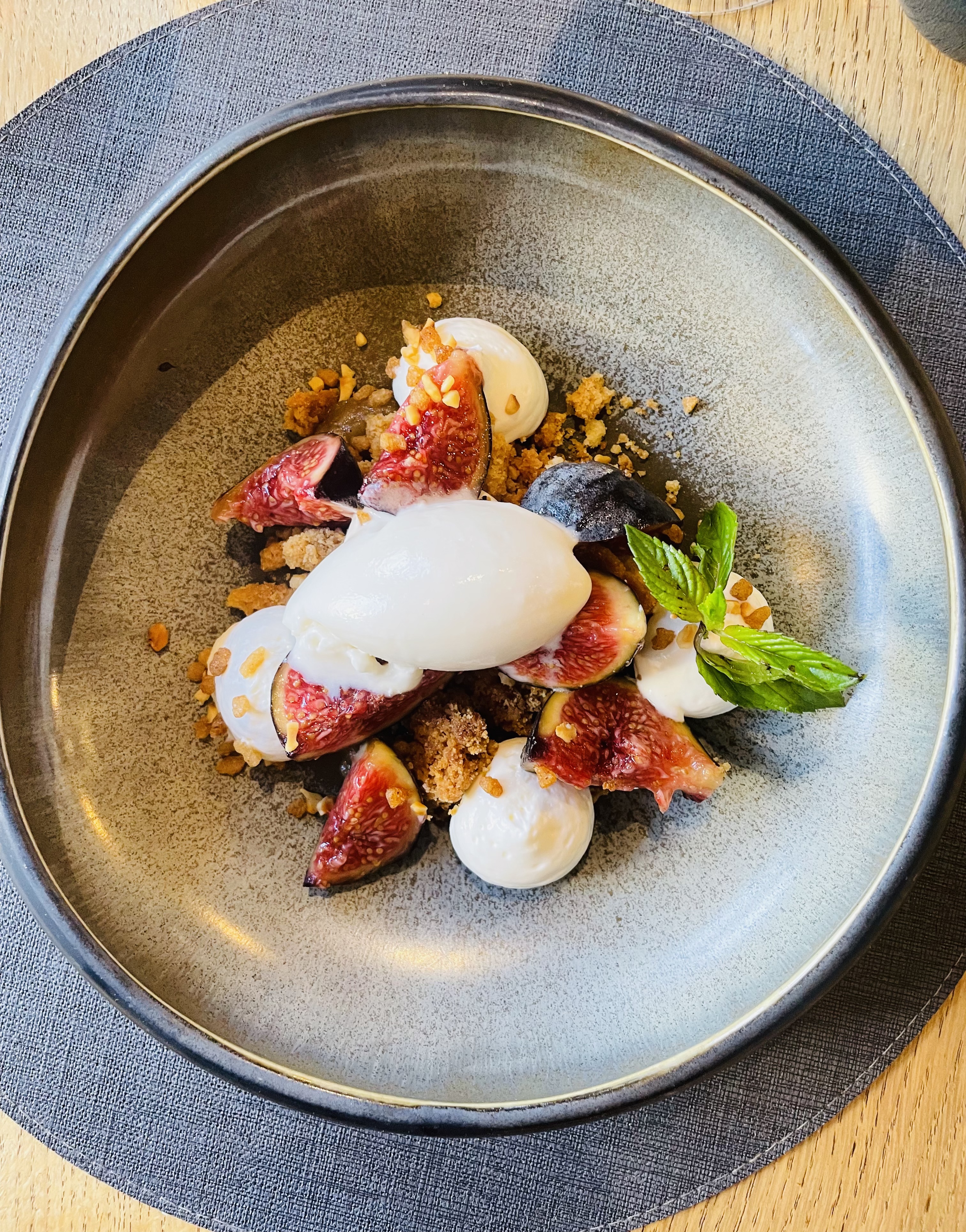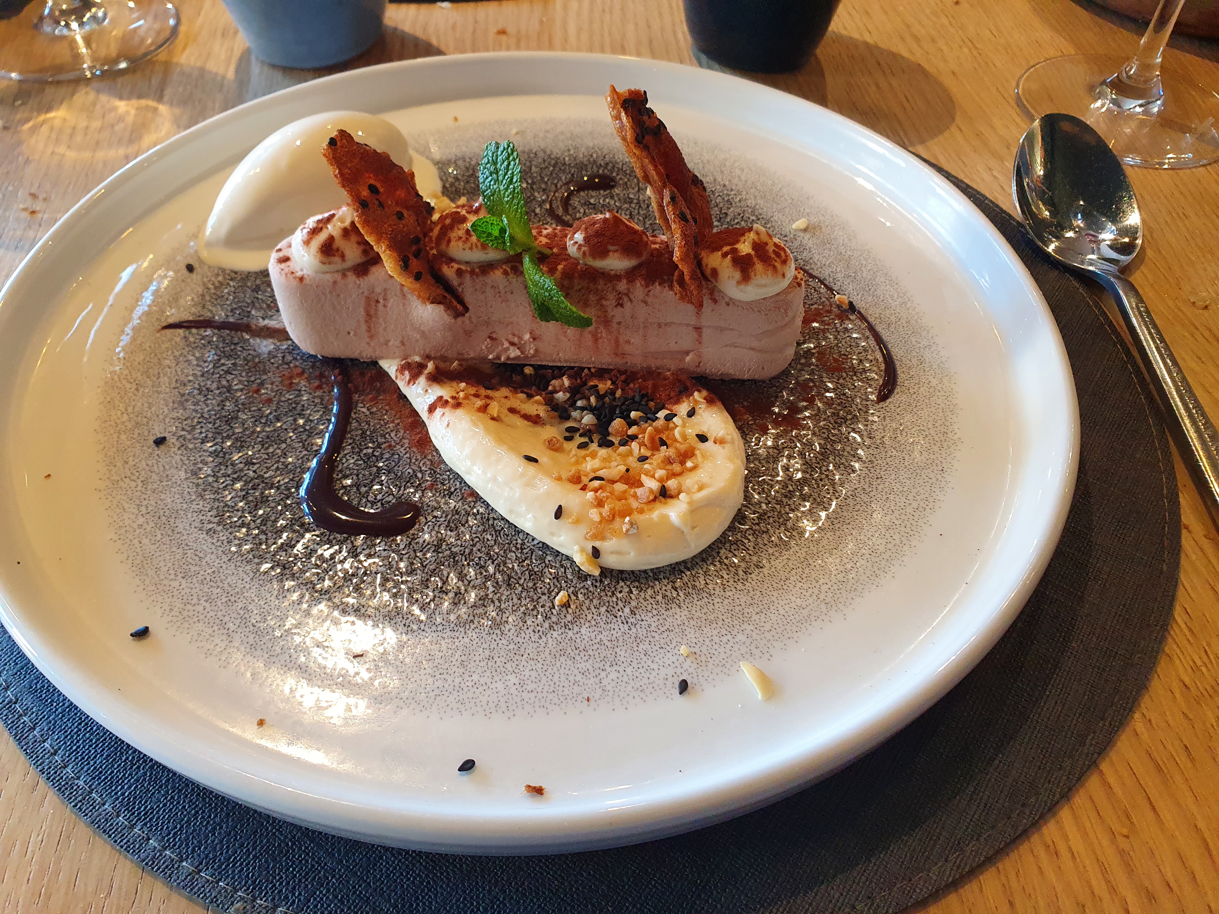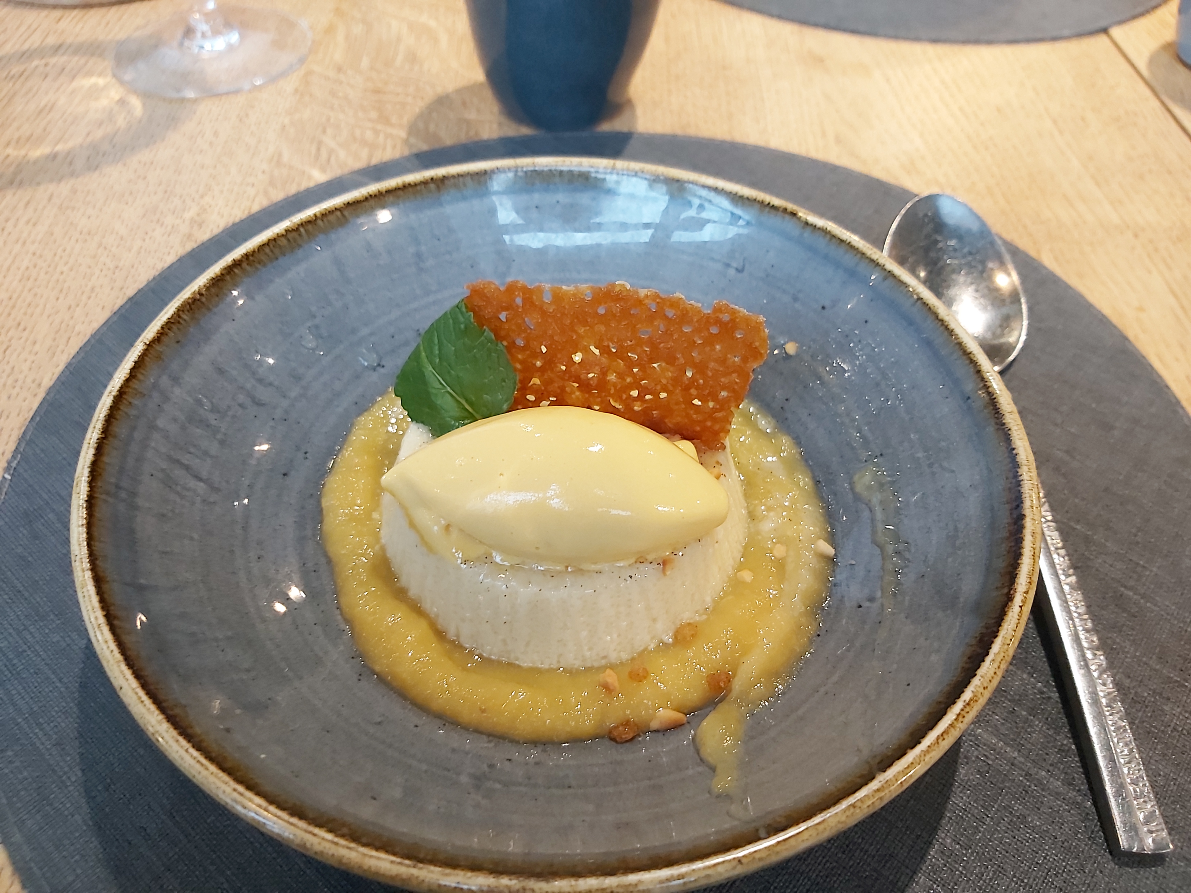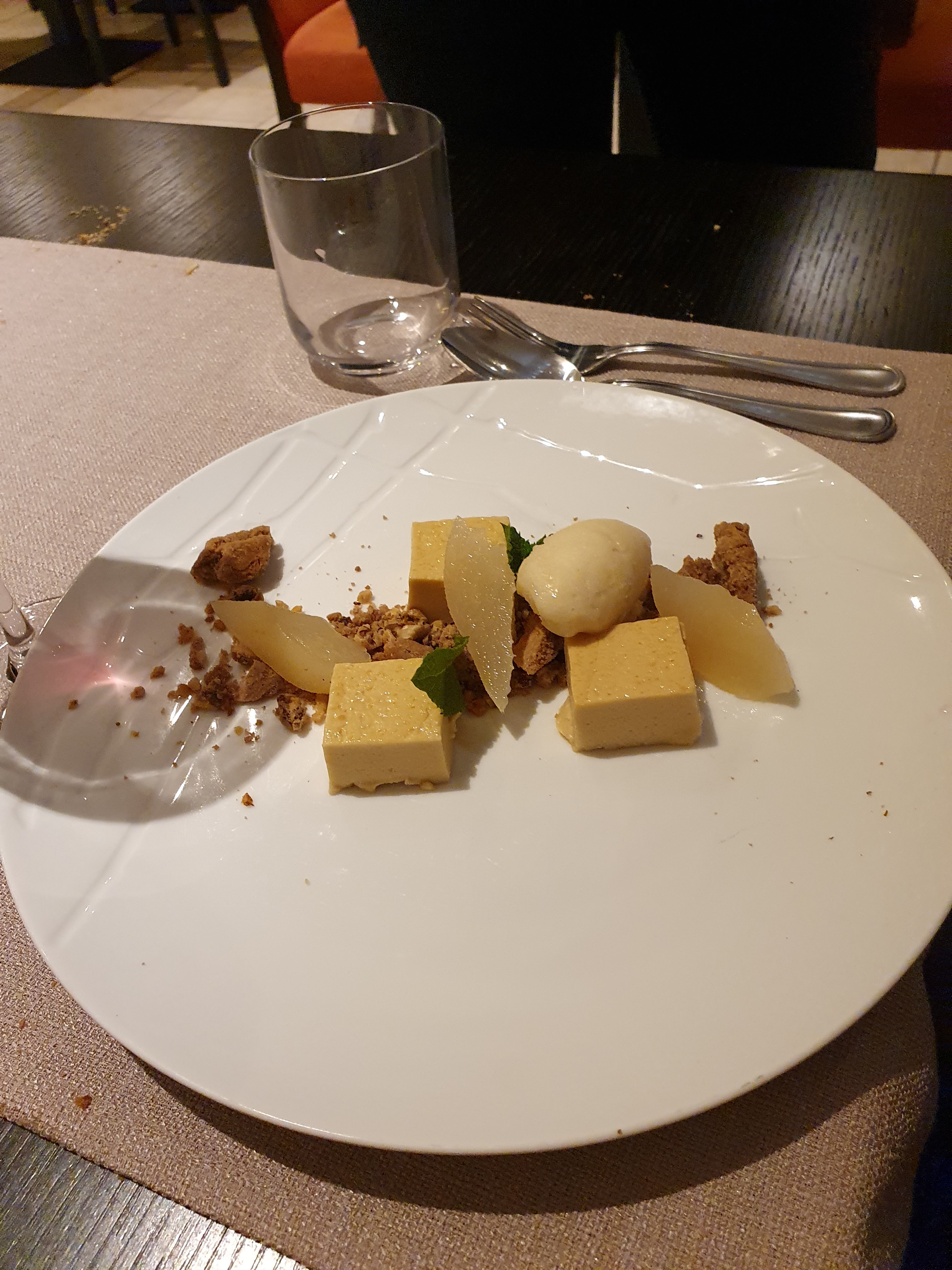 Nous avons choisi un menu à 39 €. Après une entrée délicieuse, le reste n’a pas vraiment tenu les promesses : viande trop cuite pour l’onglet et surtout dessert très décevant. Quelques oreillons d’abricots servis avec avec une crème quelconque, un sorbet, des morceaux de gâteau rassis et une herbe qu’on retrouve peu ou prou dans tous les plats salés ou sucrés !