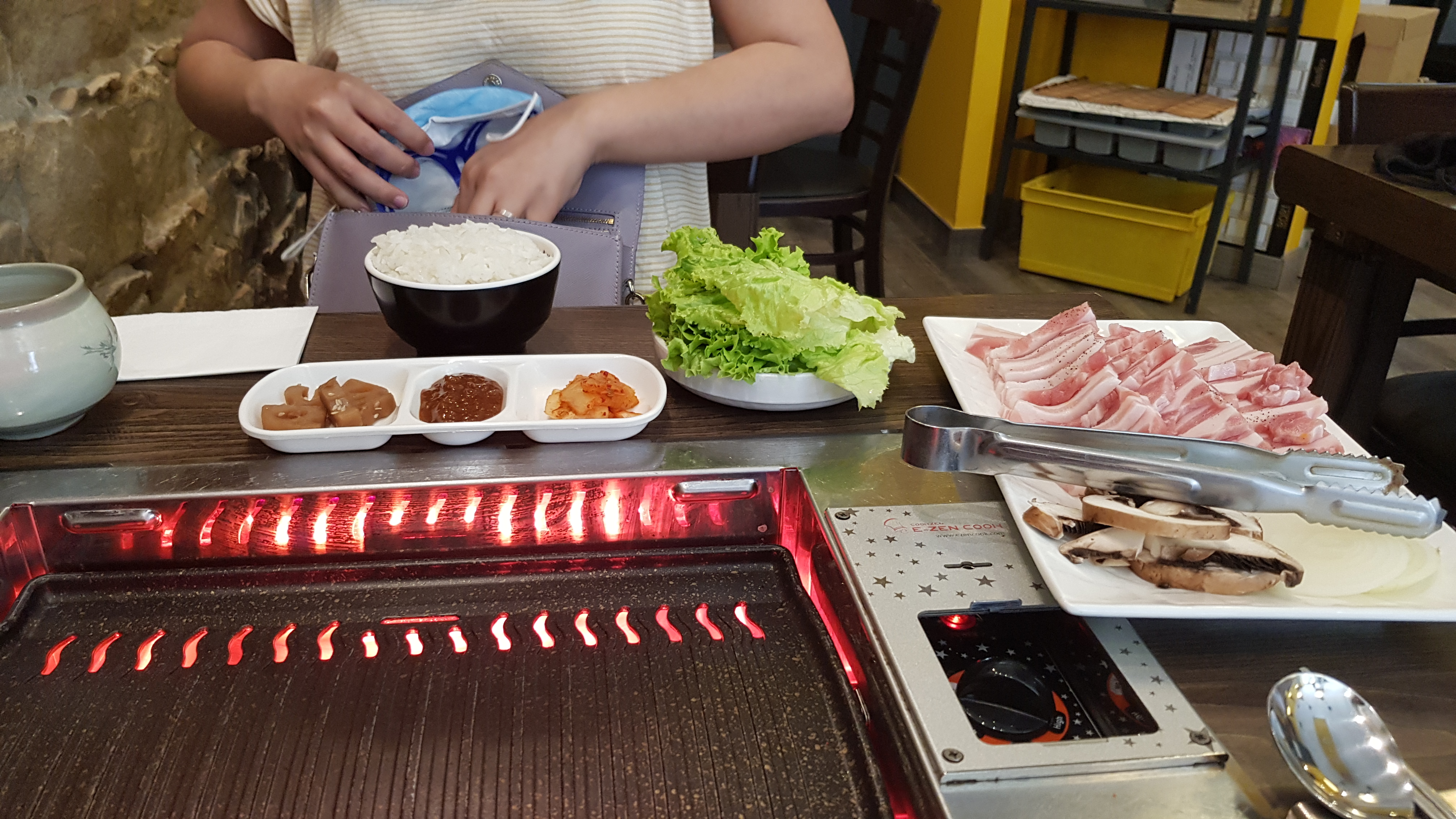 Serveuse qui vient gérer la cuisson du barbecue pendant le repas. Ce qui coupe les conversations plusieurs fois. Mais cela venait d’une bonne intention. Nous avions au moins sûr une bonne cuisson et aucune déception. Prend le temps de nous expliquer comment manger le barbecue Coréen. Prix un peu élevé pour les quantités mais de bonnes saveurs. Je recommande ce restaurant. Nous avons passé un bon moment.