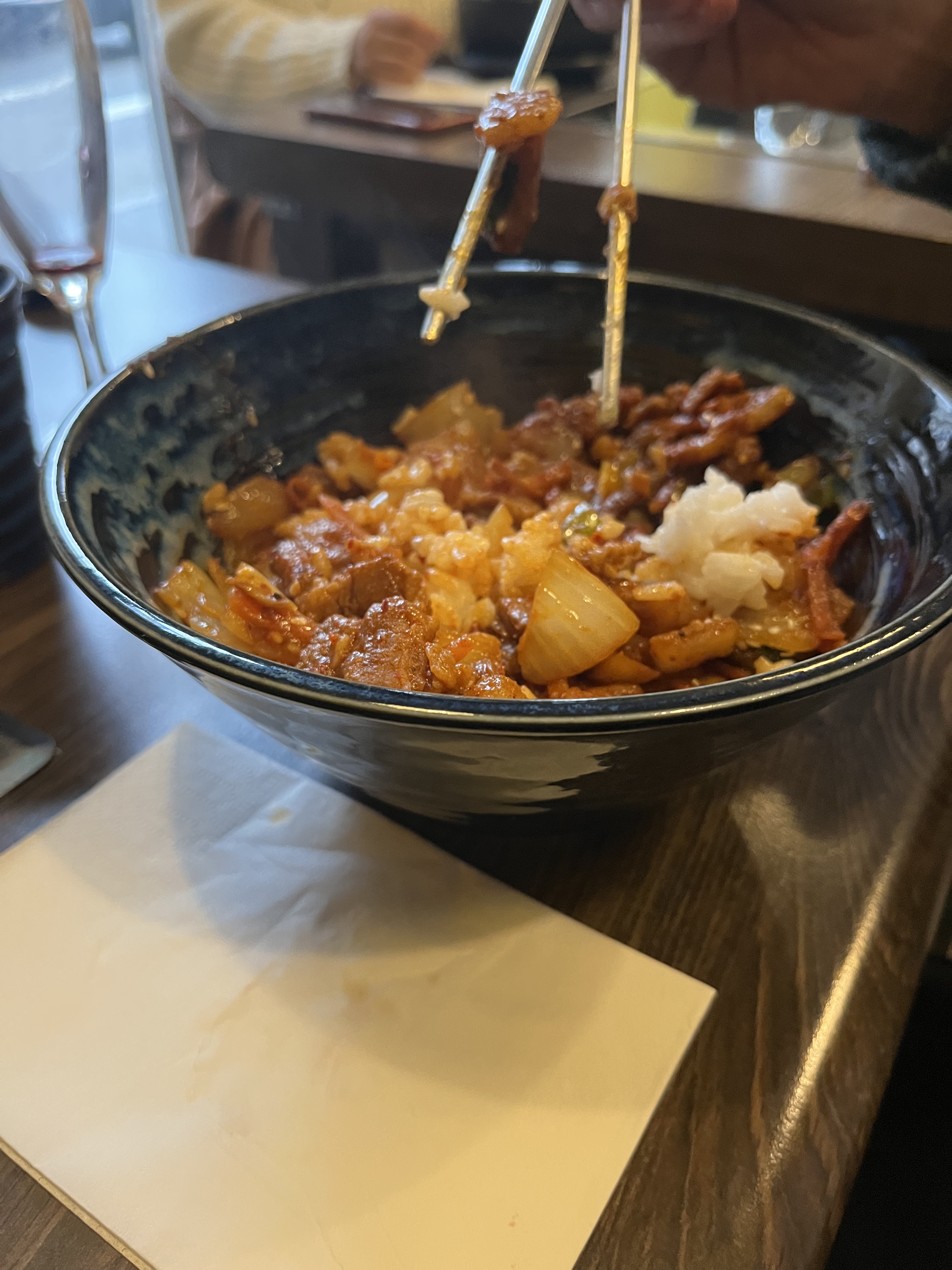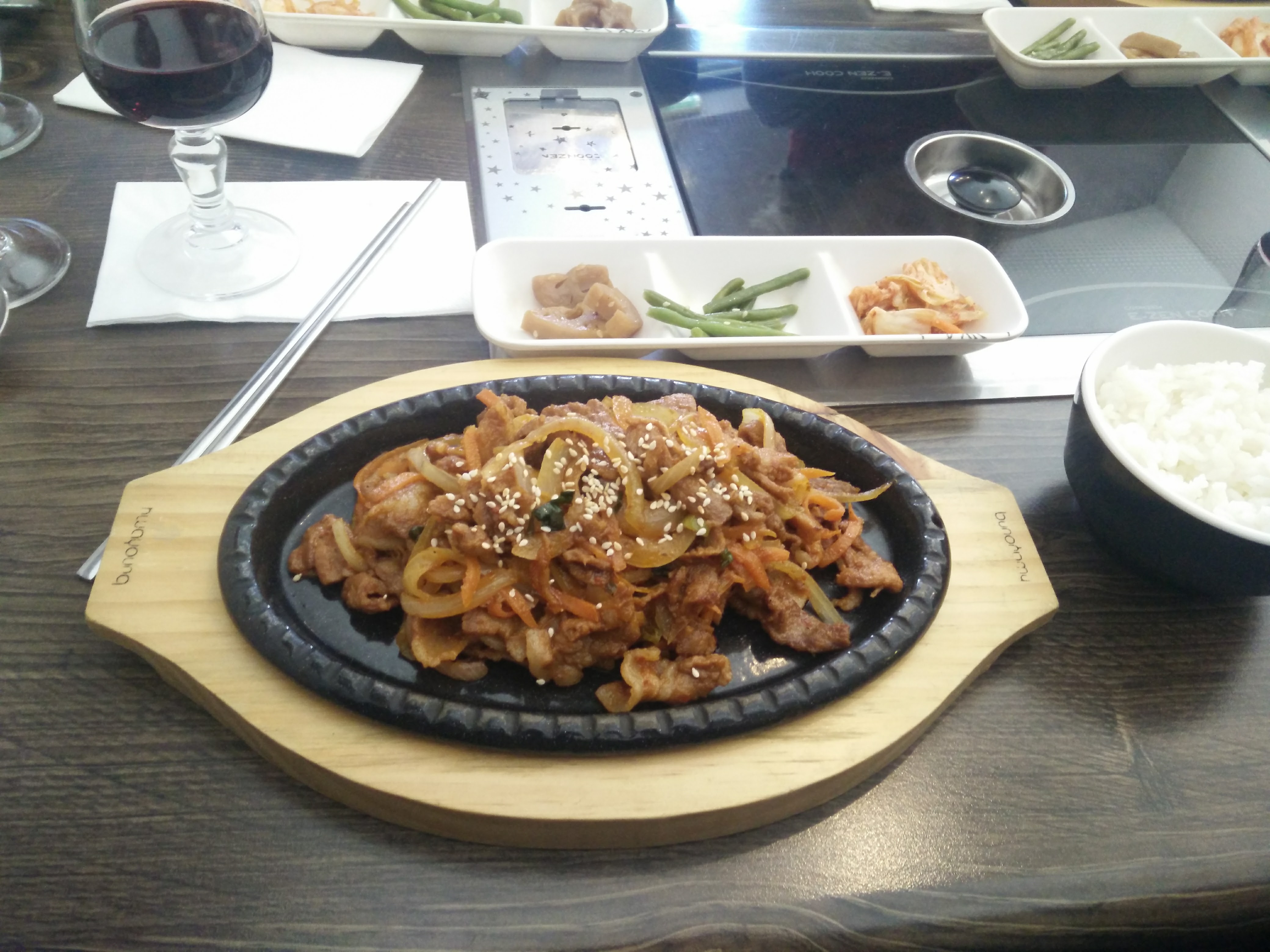 Nous avons pris des raviolis en entrée et 1 bulgogi au bœuf pour 2 Raviolis trop frit donc trop dure sous la bouche Plat de bulgogi, je pense qu’il y avait la bonne quantité malgré un doute Mais surtout, 2 malheureux accompagnements dont le kimchi en toute petite portion et desséché. J’ai eu l’impression d’avoir été servi des restes du service de midi Heureusement que j’ai pris un supplément kimchi Serveuse aimable et souriante Prix : finalement cher par rapport à la qualité On y retournera néanmoins pour avoir je l’espère une autre expérience