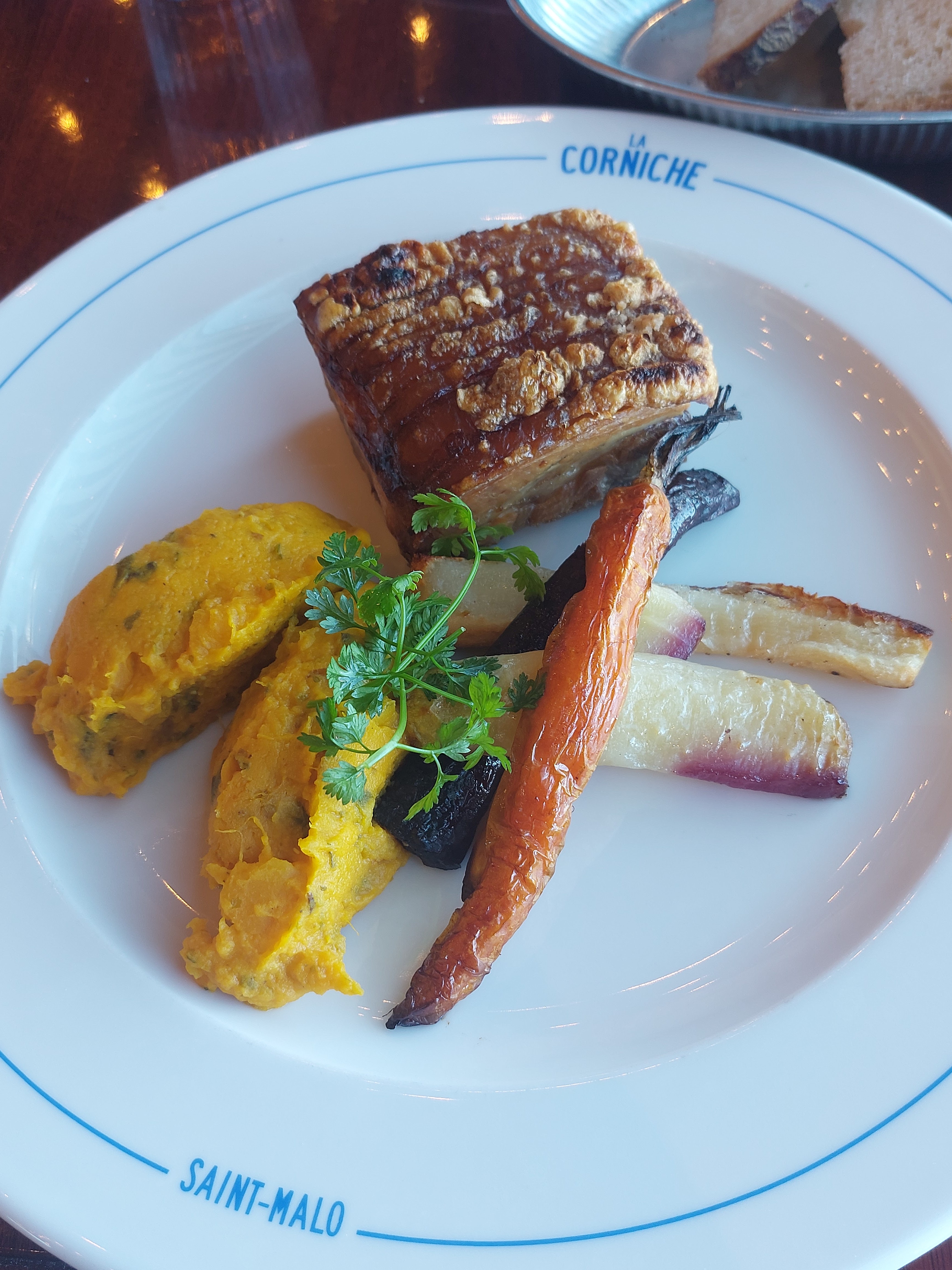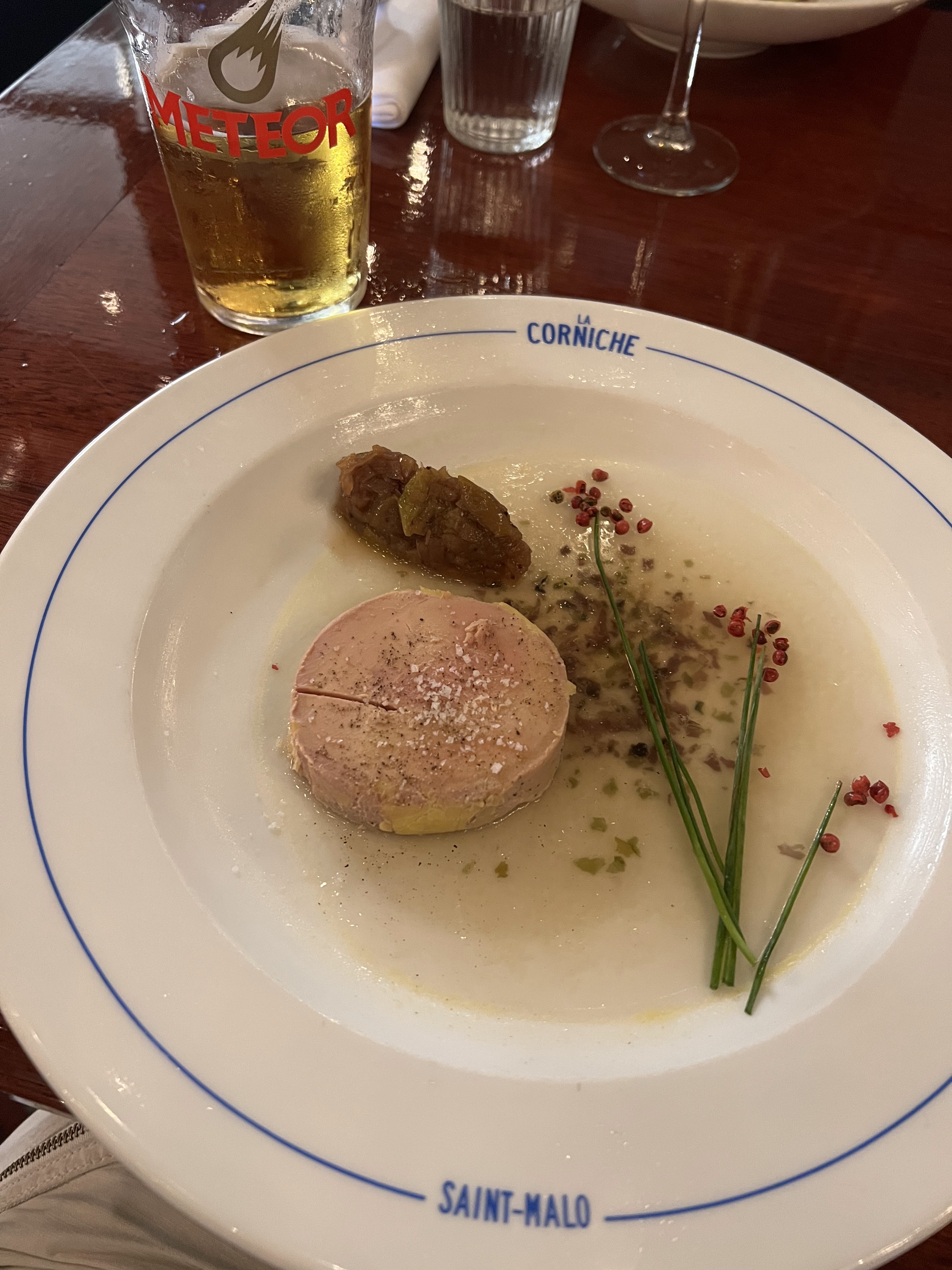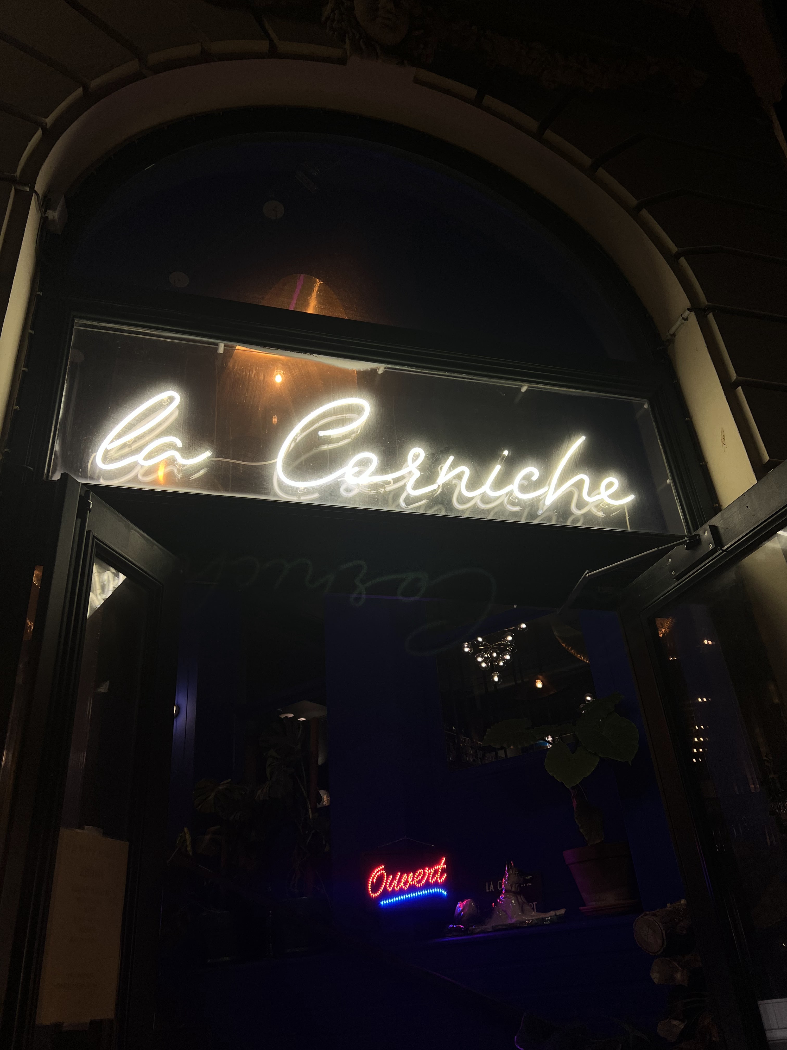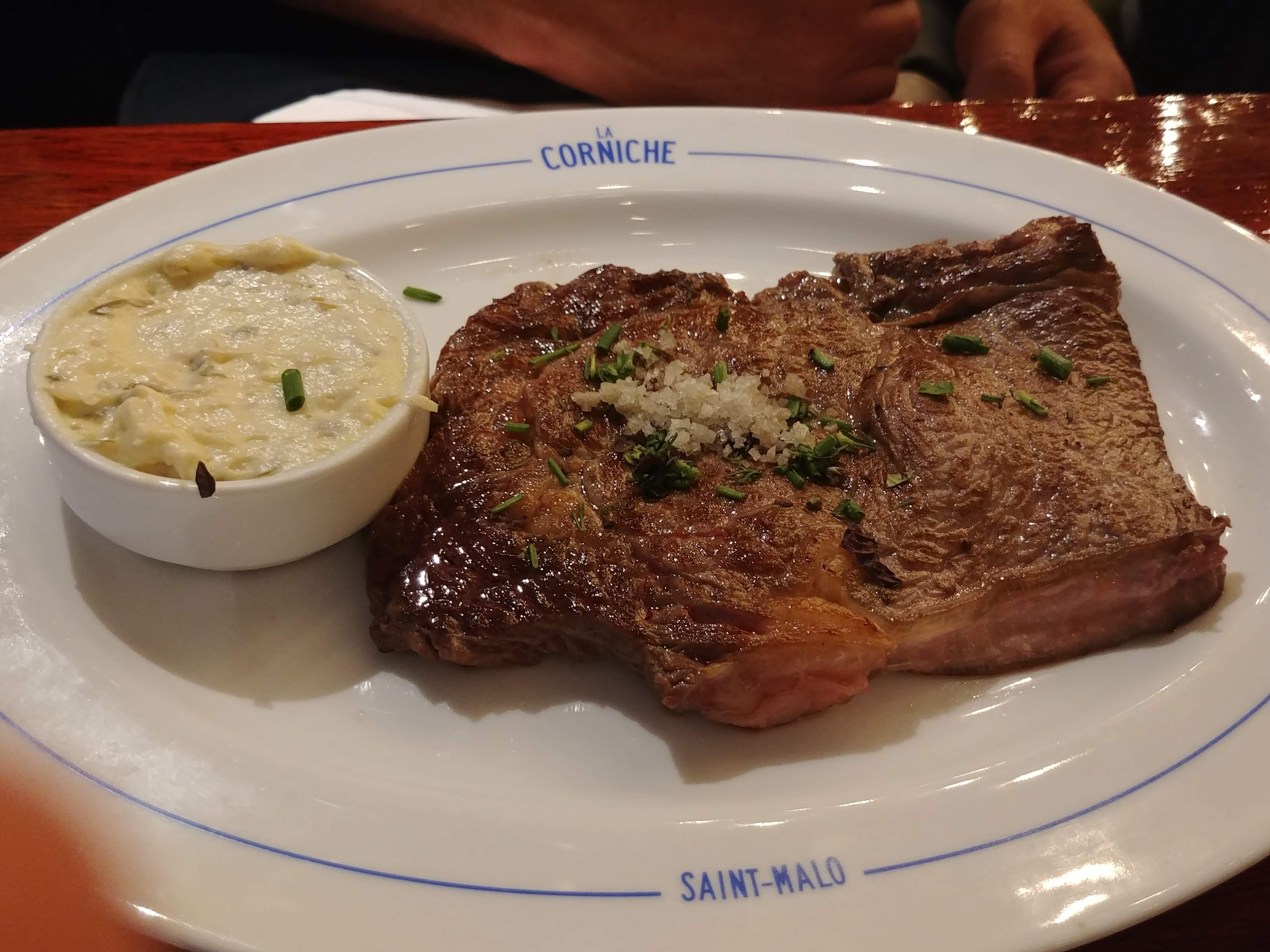 Dans un moment d'égarement lors d'un weekend de printemps, mon confrère et moi-même cherchâmes un endroit pour nous nourrir après une tentative de baignade dans un mer bien trop froide malgré un soleil sans pudeur. De refus en refus sur maints restaurants en bord de mer, nous nous dirigeâmes vers Intra-Muros et repérâmes cette chouette enseigne : La Corniche. Ni une, ni deux, nous parkons la BMW Série 1 de 2004 et abordons l'entrée. Un accueil chaleureux et souriant nous fît prendre place à une petite table haute côté bar. Le mot non ne faisait donc pas partie du vocabulaire du staff ! Des huitres, du pâté en croûte, de la rillette de maquereau ; nous entamions un voyage au pays des plaisirs gustatifs. Accompagnés de Ti-punch et de Lillet, les moules à la crème et le filet de bœuf nous transportèrent un peu plus loin dans cette découverte alimentaire. Le plus hardi de nous deux termina avec une touche sucrée sous forme de Dame Blanche, qu'il dévora comme s'il sortait d'un Carême bien appliqué. Un souvenir incroyable, une vue imprenable, des plats imbattables, une atmosphère confortable, des serveurs adorables. Merci 👌