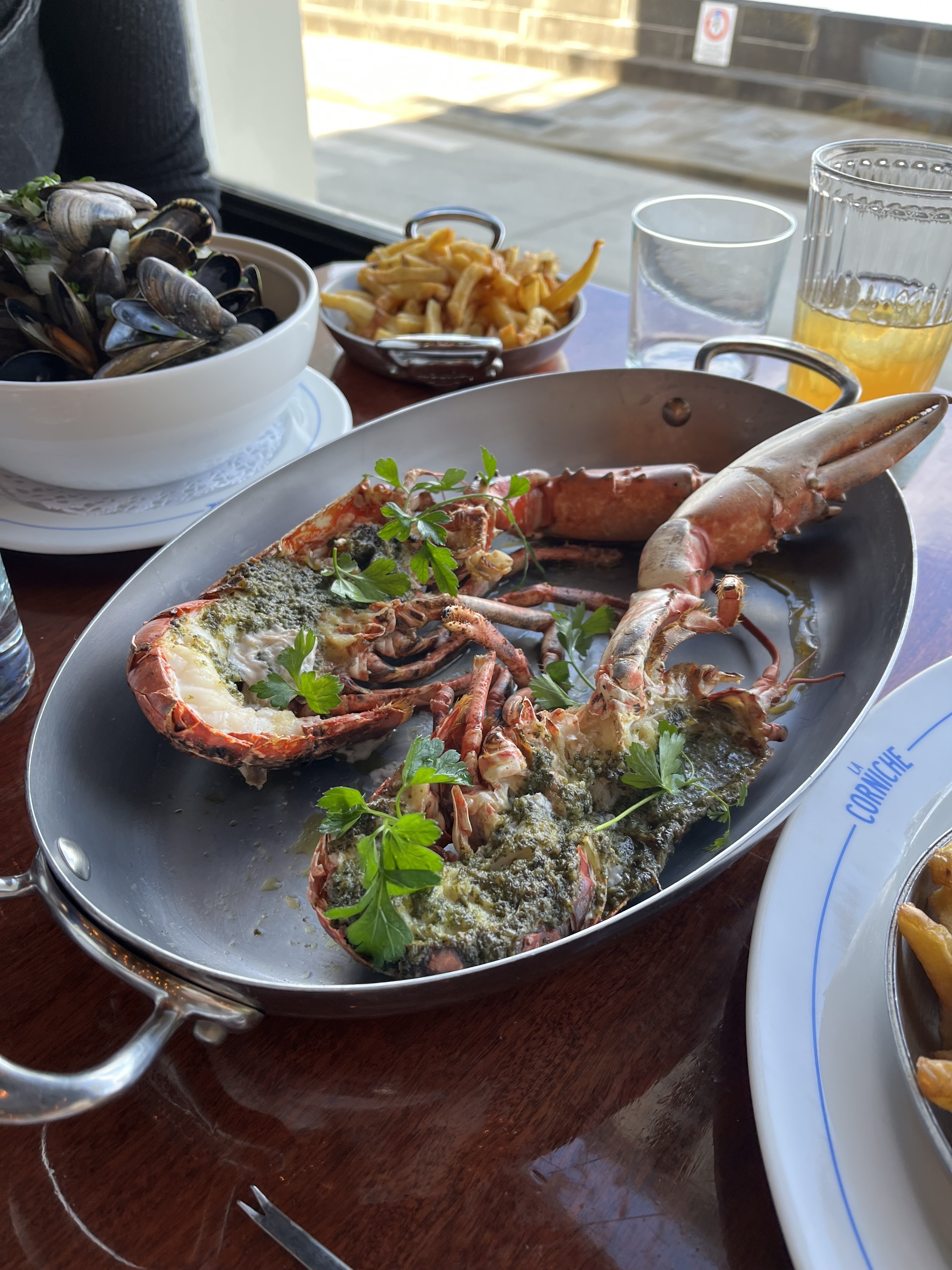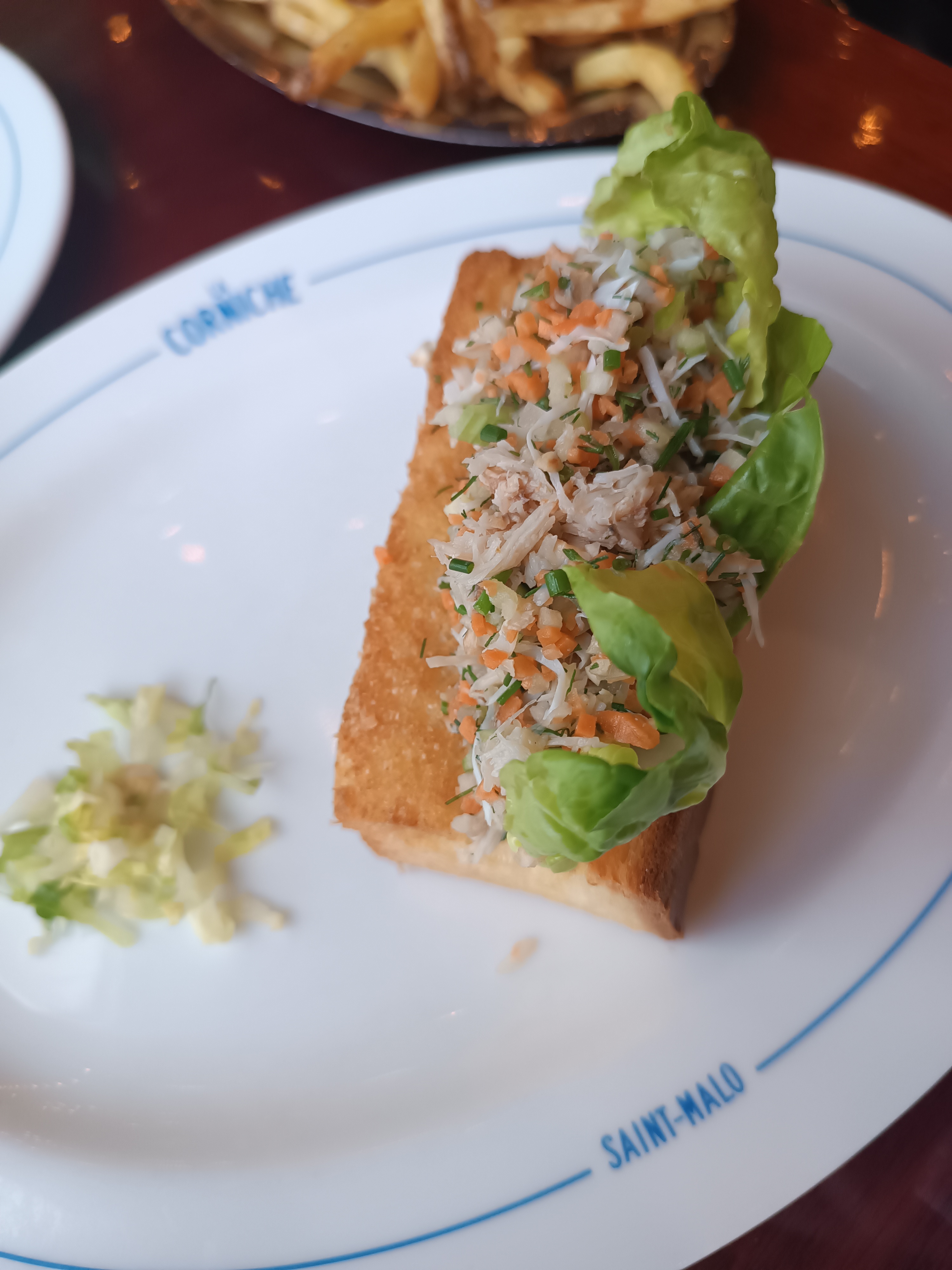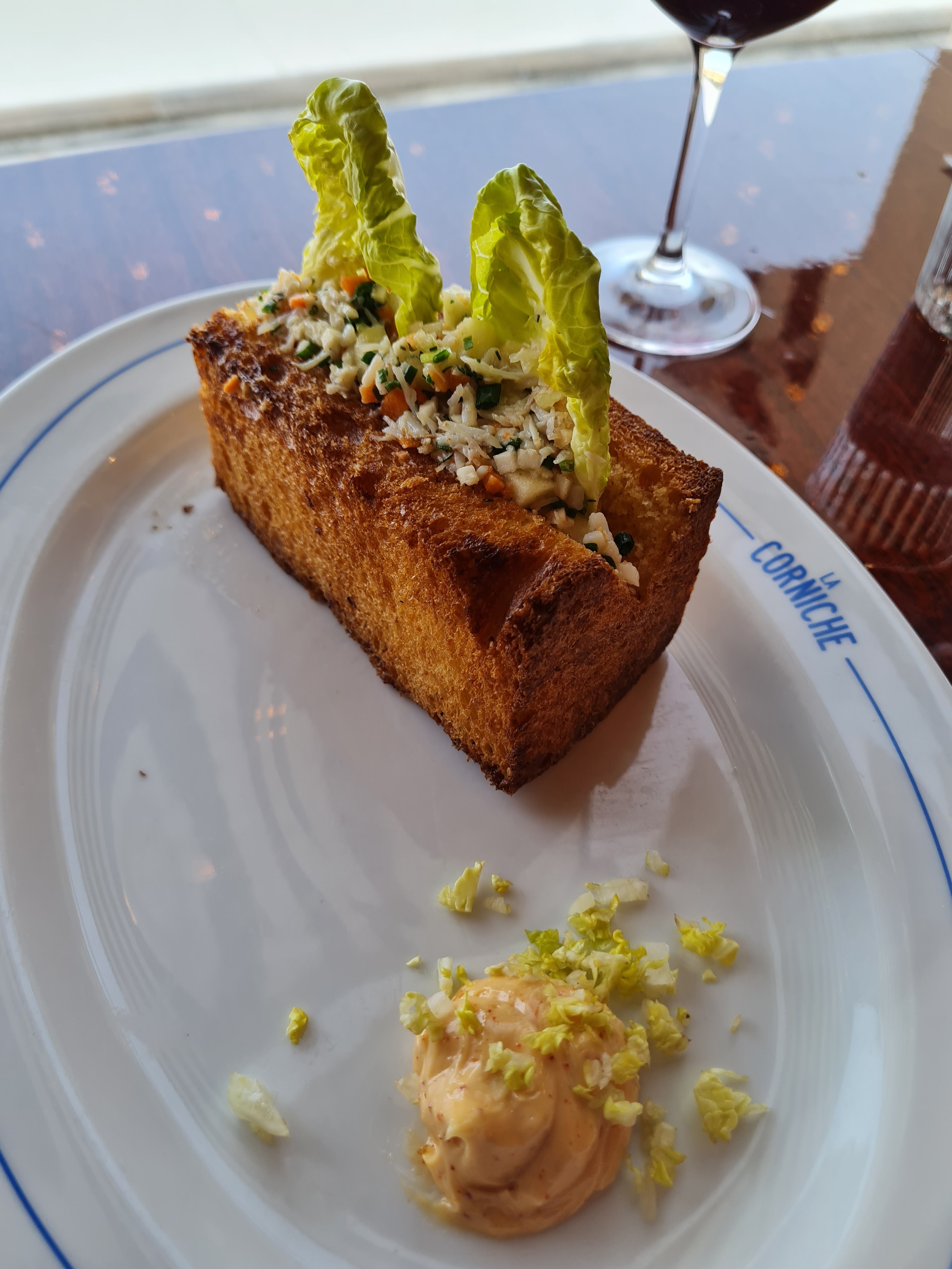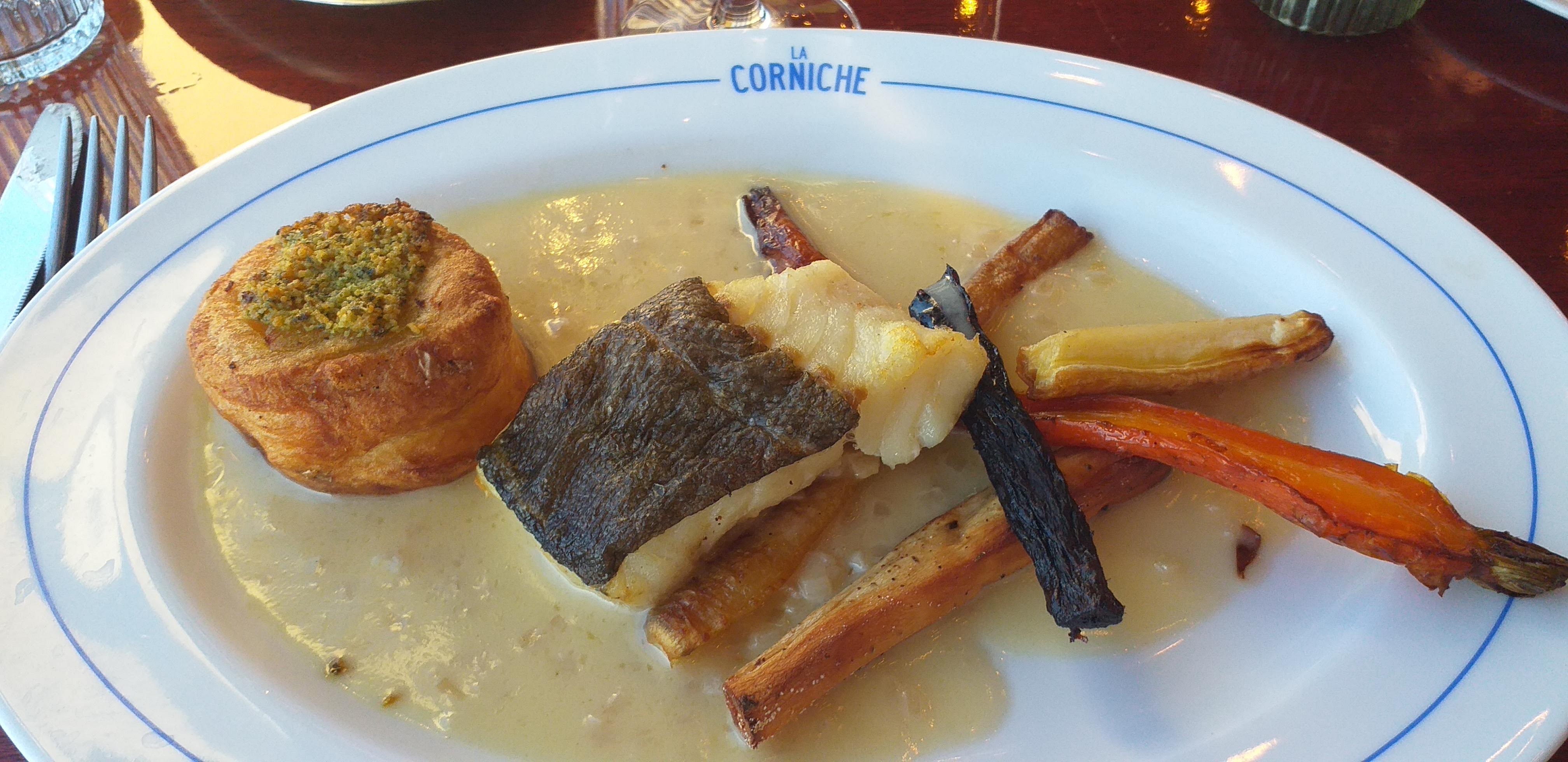 Le service a mal commencé, on m'a proposé un verre encore humide ! La nourriture était d'une qualité médiocre : ma femme a choisi comme entrée 'œuf bio mimosa chair d'araignée de mer & caviar de hareng ; on lui a servi une mayonnaise aux œufs avec des œufs de poisson en morceaux dessus; sans chair de crabe et plutôt insipide. Après m'être plaint, cela a été changé pour La terrine de La Corniche, que j'avais également choisie ; c'était bien meilleur et ressemblait même à la description sur le menu ! En plat principal, elle a choisi le plat du jour, un filet de bar ; il s'est avéré qu'il s'agissait d'un petit morceau de vieux poisson, de couleur beige au lieu de blanc et malheureusement sans goût. La mer était à 10m.....! J'ai choisi le crab roll avec mayonnaise parfumée au gingembre, pain brioché et frites. D'après la description, j'avais pensé recevoir un rouleau de chair de crabe, etc. pas de chance ! On m'a servi quelques morceaux de brioche grillée recouverte de surimi râpé (bâtonnets de crabe), mais leur saveur vient du poisson et non du crabe ! Quant aux frites elles n'étaient pas du tout croustillantes et semblaient avoir été recyclées, peut-être du déjeuner ?! Nous avons eu l'impression que La Corniche cherchait à arnaquer les touristes sans se soucier des produits qu'ils servent ni de leur réputation. Le seul conseil que nous pouvons vous donner est d'éviter ce restaurant, sinon vous risquez d'être sérieusement déçu.