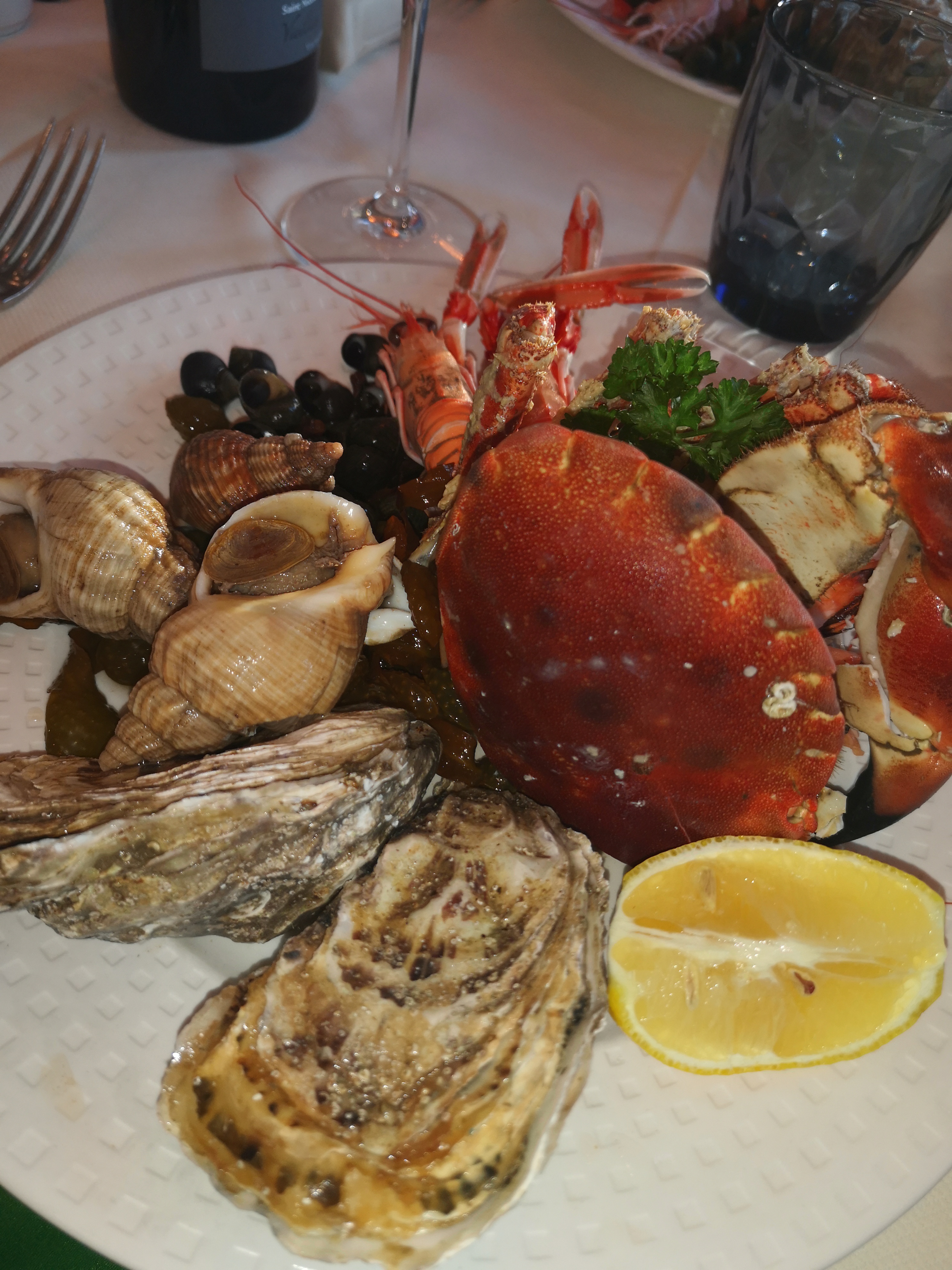 Eh bien, je pense que la motivation de ce restaurant est la cupidité. mais malheureusement pas pour satisfaire les appétits de ses clients. J'avais vraiment hâte de manger du homard, mais la plupart des écrevisses auraient battu la nôtre avec une griffe derrière le dos. Nous n'avons aucun problème à dépenser de l'argent pour la meilleure cuisine et le meilleur vin, mais les prix ne reflètent tout simplement pas la qualité. Nous avons aimé le personnel de service qui était sympathique et engageant, mais quels que soient les propriétaires et où qu'ils se trouvent, ils ne s'attendent probablement pas à ce que les clients reviennent. Très bien situé et vue. Notre table était à l'avant et surplombait la mer mais malheureusement trop proche des autres tables et de la charmante plante qui interférait continuellement avec les cheveux des convives. Benetin à l'entrée.