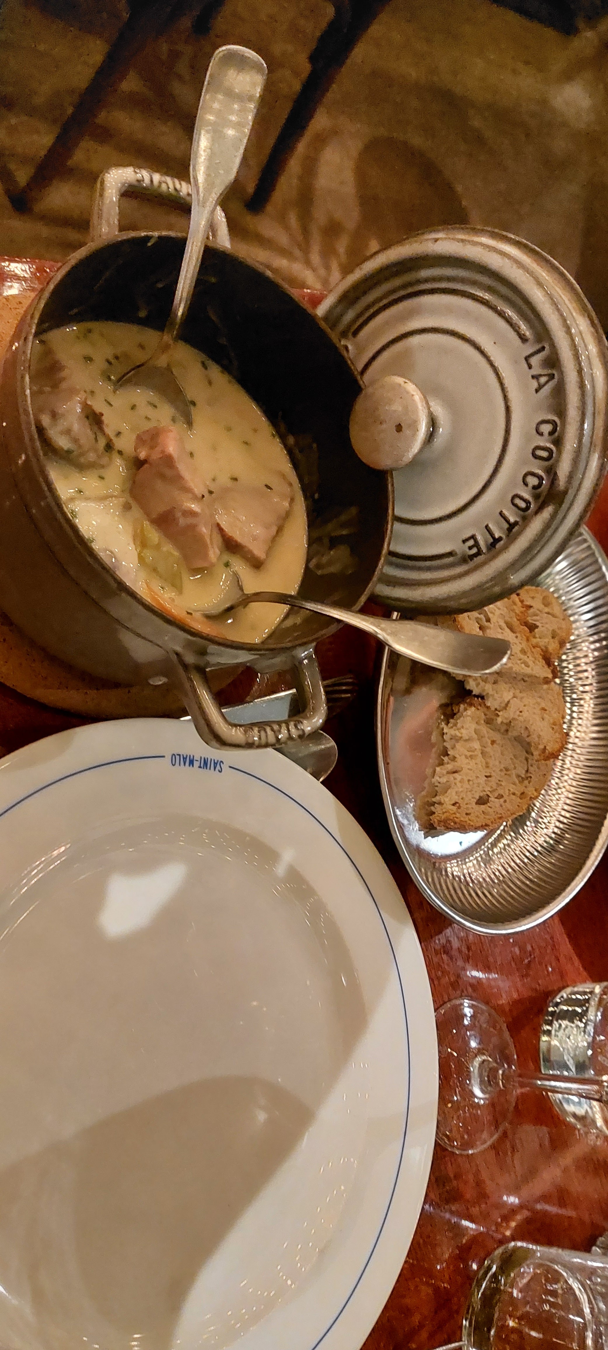 Nous avons pris les moules marinières. Nous ne sentions que le goût de l'oignon. En plus le prix était supérieur aux autres restaurants de Saint Malo. Le plus : le pain et le cidre. A part ça le service était courtois et le local élégant.