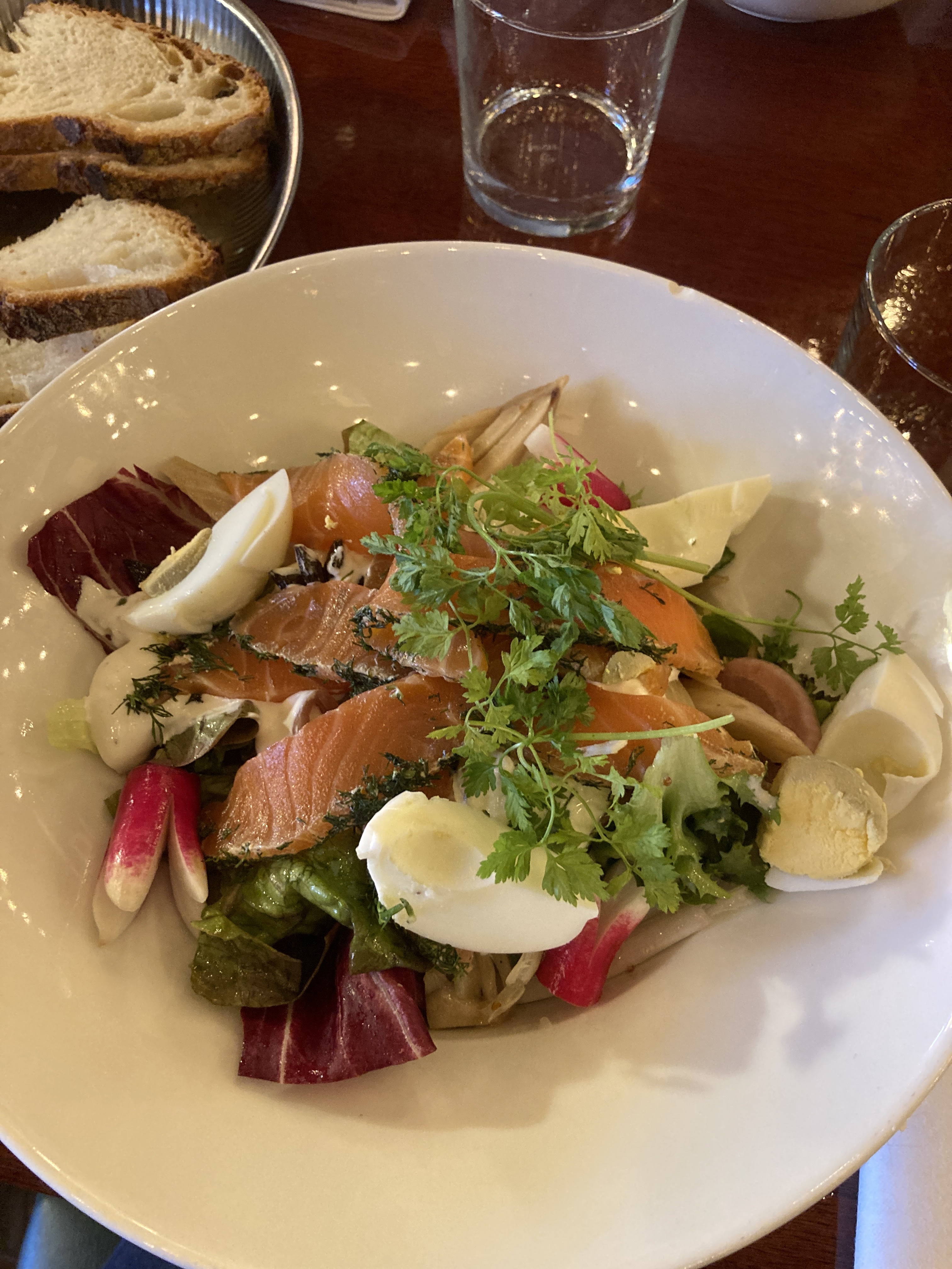 Nous sommes arrivés sans réservation un vendredi soir en pleine saison estivale et avons eu une place au centre de la salle, plutôt côté cuisine. Dès le début nous avons eu un peu le tournis de tous ces passages autour de nous… Le service était très long, nous avons reçu les plats 45 minutes après la commande, n’ayant pas pris d’entrées. Autour de la table nous avions un risotto à la truffe (délicieux apparemment), du cochon il me semble (également bon, très bien cuit) et deux salades de saumon gravlax… malheureusement pas à la hauteur de nos attentes. La mienne était (trop) remplie de crème blanche sous le saumon, possiblement une crème fraîche assez épaisse, et l’ensemble du plat avait un goût vinaigré. J’étais très déçue, seul le saumon était bon. Nous ne sommes pas parvenues à finir notre salade… Il s’agirait probablement d’une sauce pickles, mais il faut vraiment aimer car même les pommes de terre au fond du plat avaient ce goût. Légère déception pour nous, surtout avec l’attente des plats en plus.