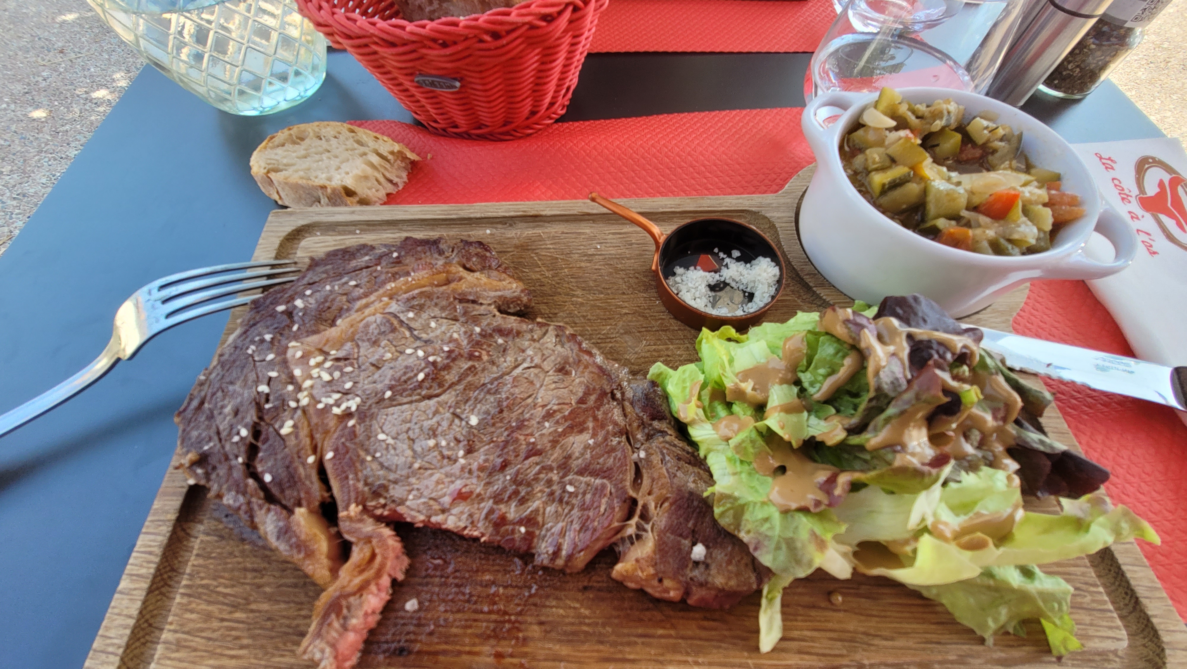 Restaurant choisi au hasard sur la route des vacances et nous n’avons pas été déçu. Cote de bœuf dégustée à 4. Cuisson parfaite (bravo au chef), viande tendre et délicieuse. La serveuse était seule mais rudement efficace et très sympathique. Elle a dû refuser des clients qui arrivaient sans réservation malgré des tables vides. Je pense qu’elle a privilégié le service des clients à table plutôt que de remplir le resto et faire du chiffre. Très professionnelle ! Certains pourraient trouver cher mais nous avons payé 123€ avec apéro, côte de bœuf, vin, desserts et café à 4 personnes. Je trouve que le rapport qualité/prix était très raisonnable.
