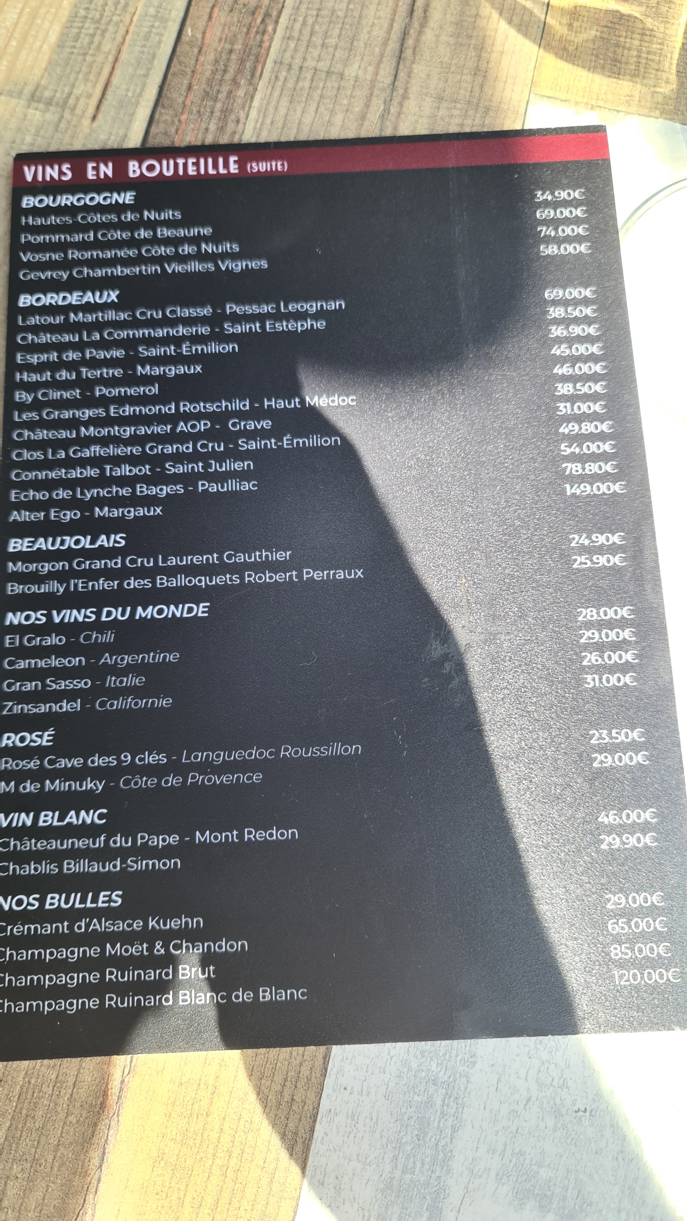 Une belle carte pour les mangeurs de viande comme moi 😉 L'équipe au service est géniale, rapide et a toujours le sourire. Je recommande vivement, nous avons passé une très belle soirée en terrasse. Merci La côte de bœuf
