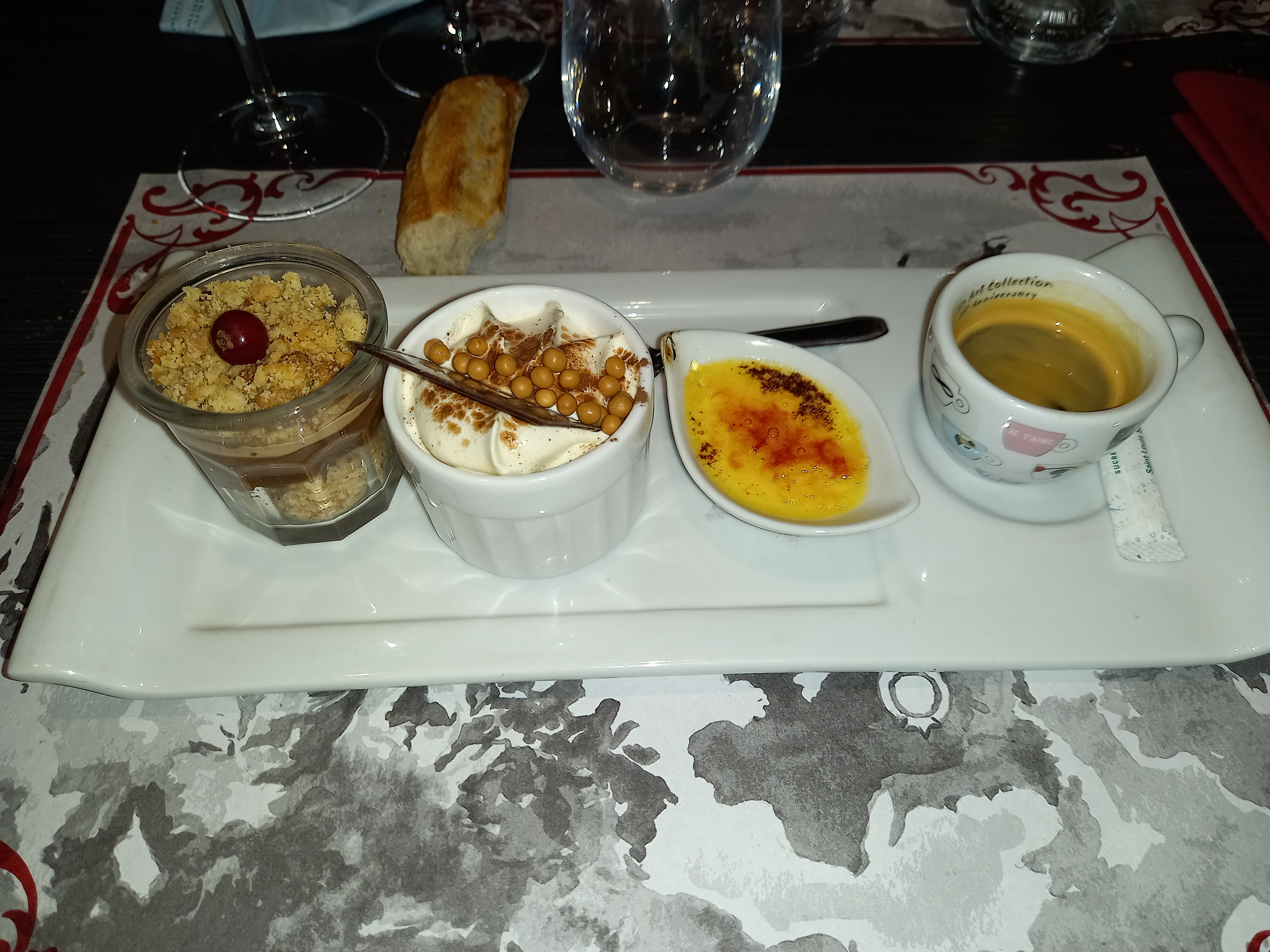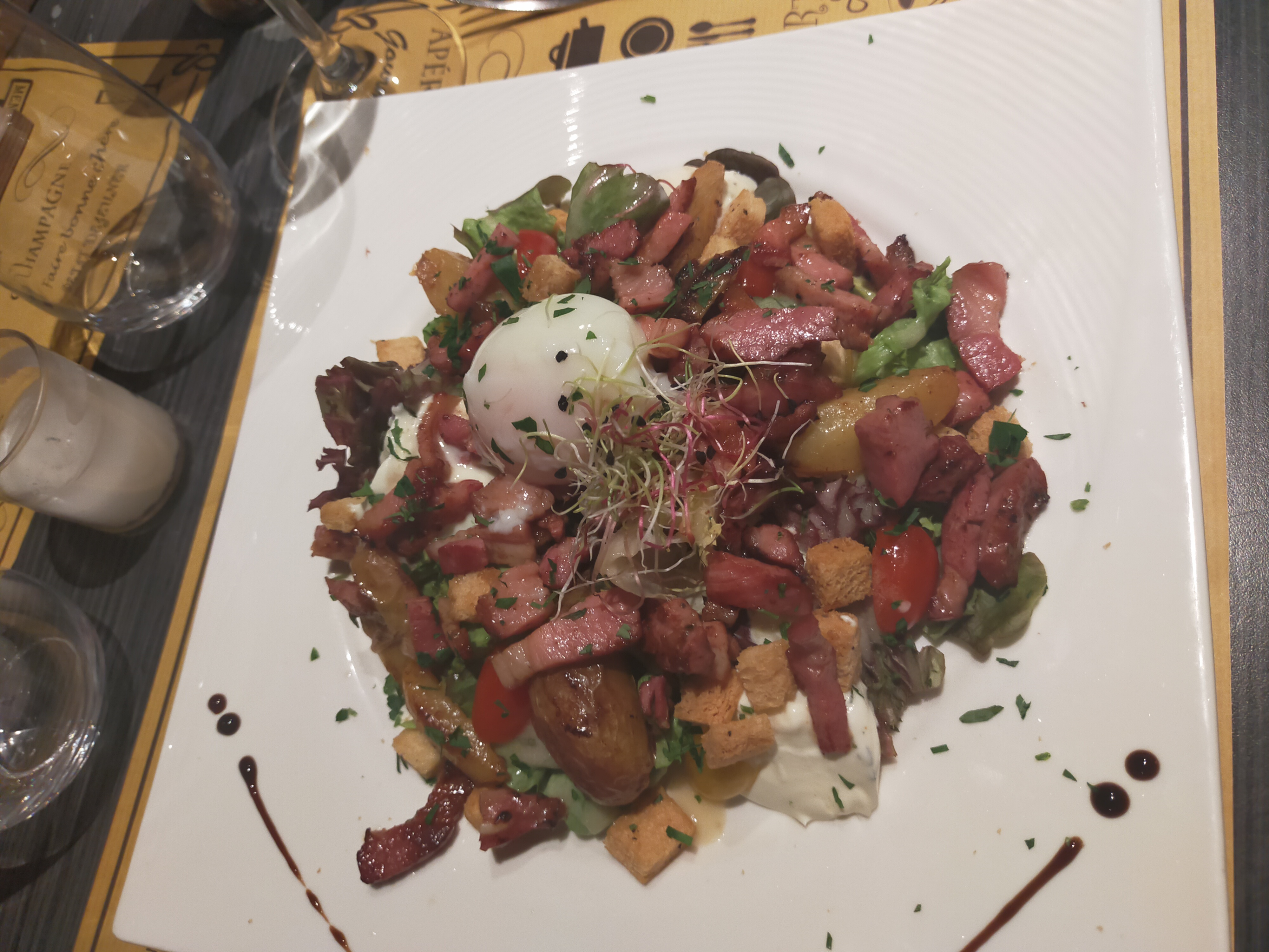Super expérience gustative avec en entrée un œuf meurette crème de munster lardons. Un trio de viande tendre arrosé par un excellent terrasse du Larzac.