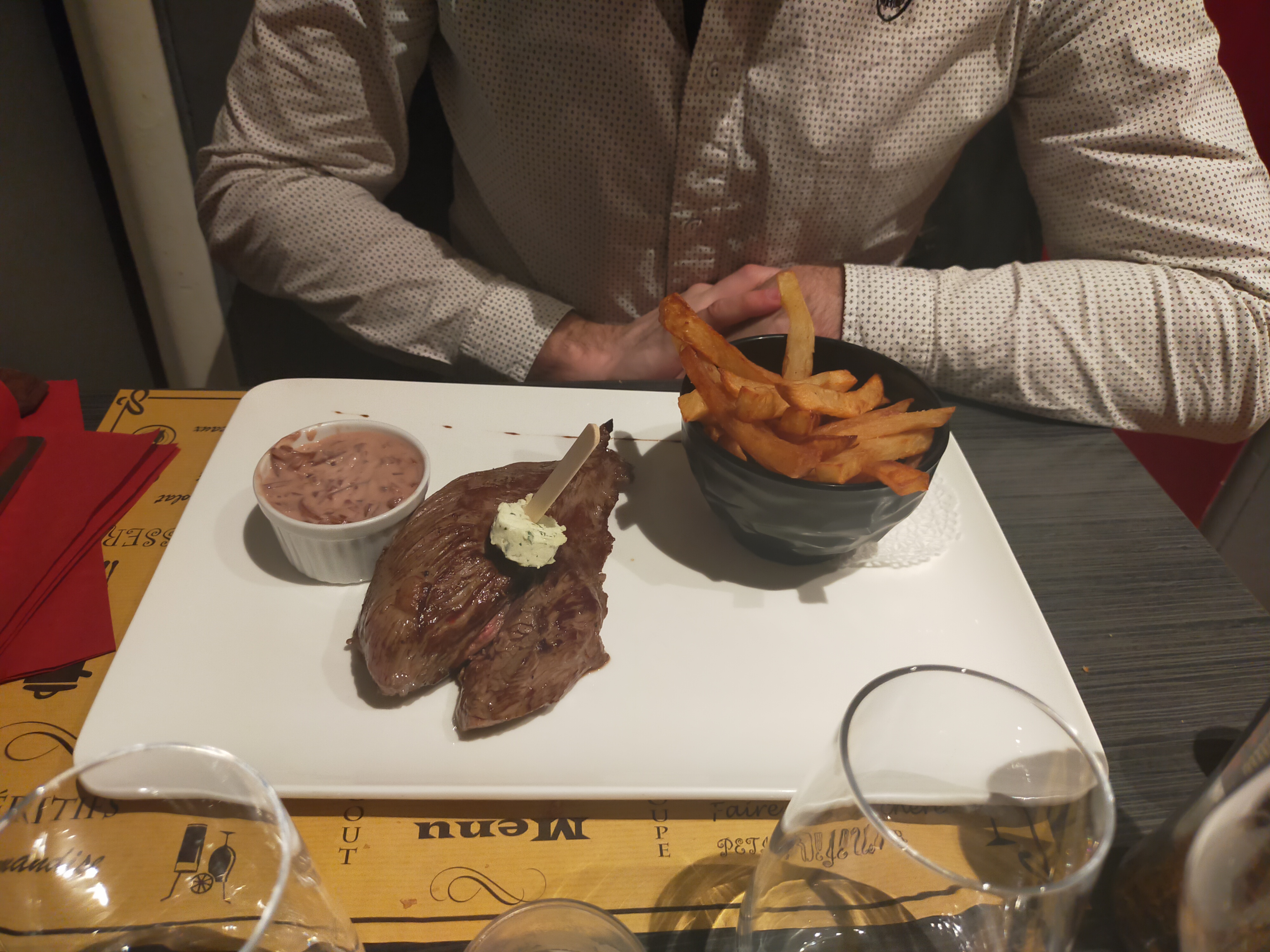 Très bonne viande servie généreusement, frite avec peaux faites maisons bonne mais sans plus ( je ne suis pas trop frite) cuite au blanc de bœuf. Je n'ai pas prix de dessert mais pas mal me donnaie envie( paris Brest,crème brûler chocolat blanc feve de tonka,...) fait maison aussi . Prix abordable à deux pour83€ ( 4 os à mouelle, poire de boeuf et bavette, frite, café, thé) trop bon . Le service ces fait à deux une demoiselle très souriante mais nouvelles et un grand jeune homme très aimable et réponse à tous très sympa les deux , compte bien y retournée au prochaines formation à epinal . Merci à vous