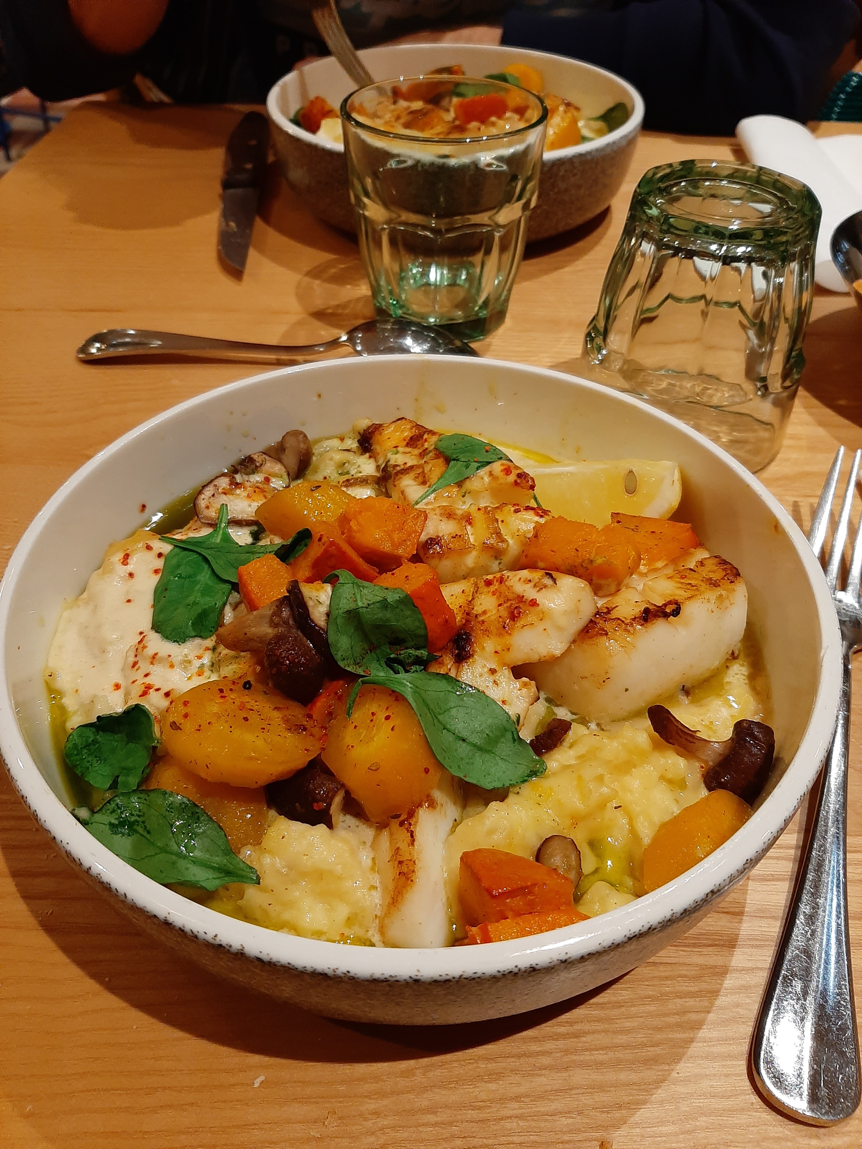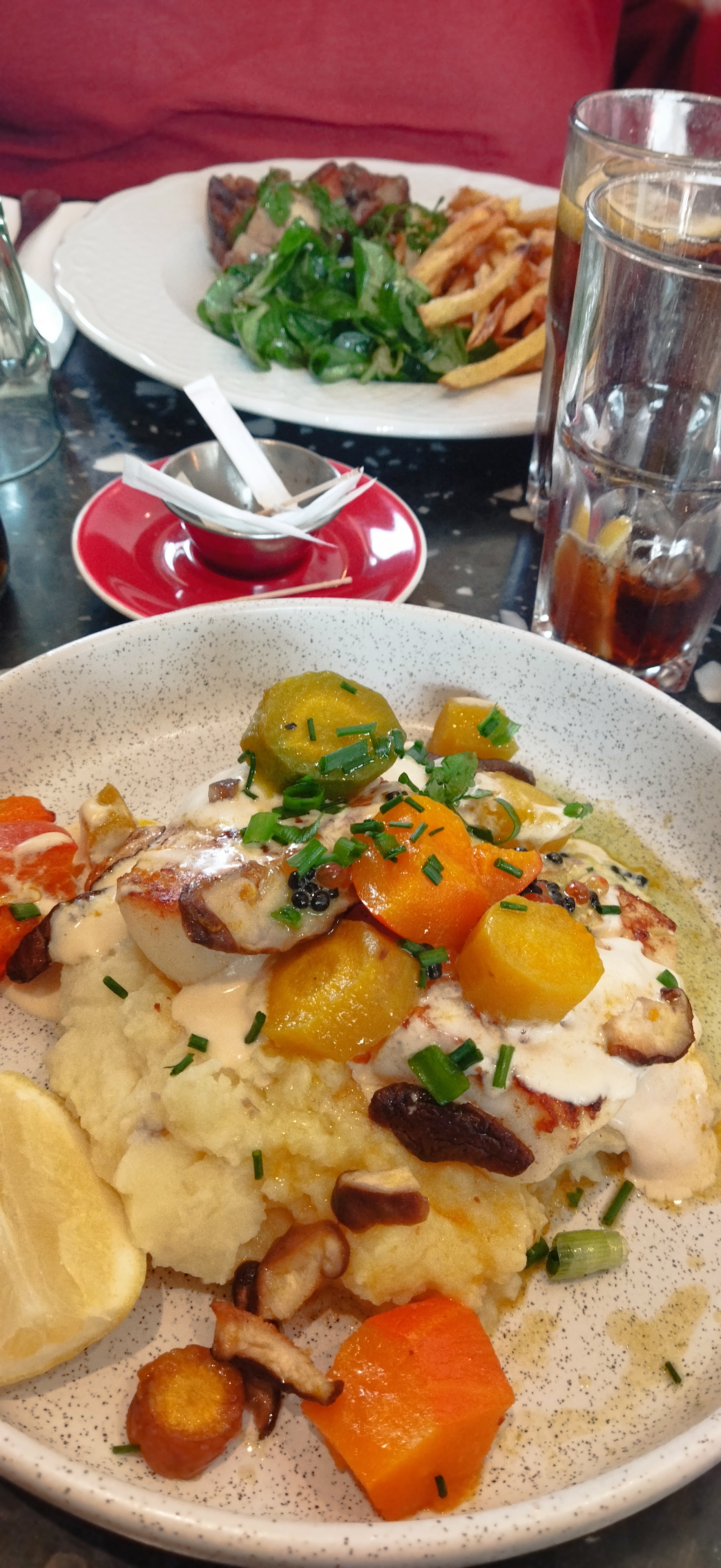 Restaurant très joli mais assez simple dans la proposition de leur plat. Le poisson était un peu sec, la purée correcte. Il n'y a pas d'entrée si on ne prend pas de menu j'ai trouvé cela très bizarre ! Le tout était correct !