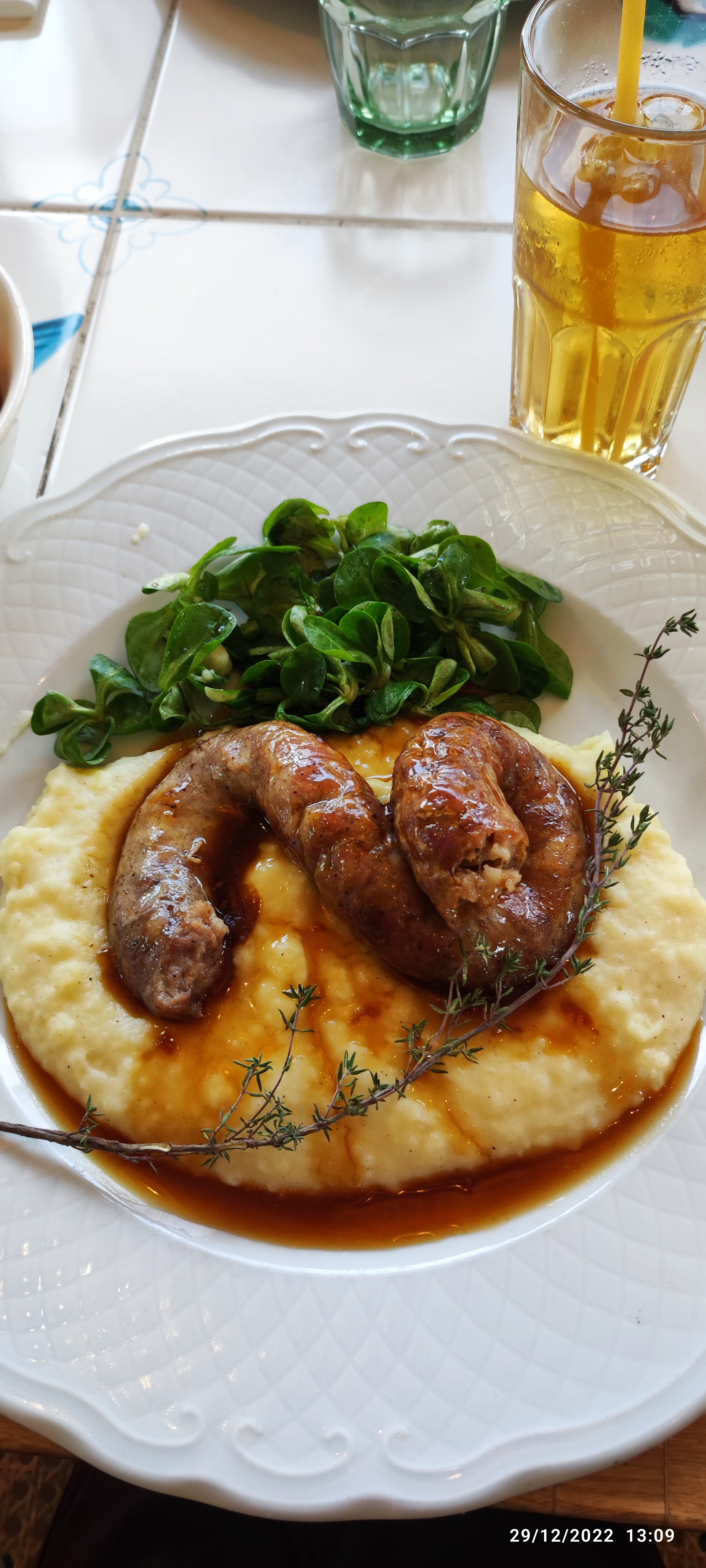 Saucisse maison/purée (16€) inouï ! Encornet snacké, bien cuit et en quantité (3 grosses tranches). Les serveurs sont très sympa. La terrasse bordée de végétation fait oublier la circulation. Nous reviendrons.