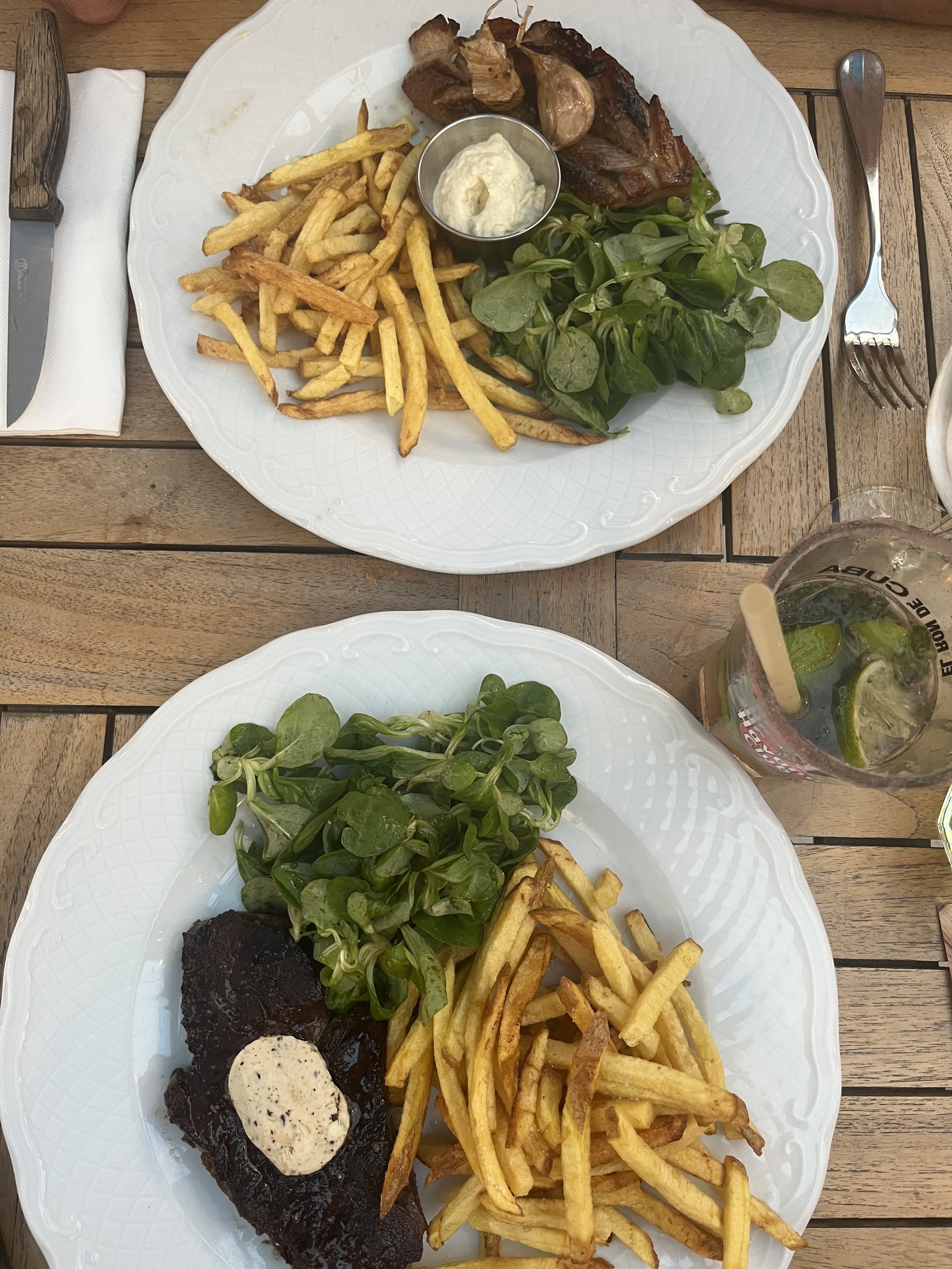 Très bon service accueillant et serviable en restant disponible une carte limitée mais intéressante par sa diversité. Celle des poissons est redondante mais efficace. Les apéros le mojito red est de bonne qualité bien marqué en grenadine épicée un peu trop sucré, le kissmetender dans une flûte est minimale en quantité et répond à son nom baisé doux. Les plats La basse côte est de taille minimale pour moi 200 g environ environ l'entrecôte de 350 g passe bien avec les accompagnements a volonté. La cuisson parfaite pour les viandes la sauce chimichurri très parfumée et onctueuse. Les desserts La coupe gourmande est une tuerie avec son chocolat moelleux et une vanille artisanale très savoureuse. Le pain perdu ou beige perdue est très bonne et copieuse. Le petit BÉMOL est de voir les clients précédents se voir offrir un petit rhum arrangé et de ne pas avoir le même traitement. Note a 89€ pour deux sans vin.