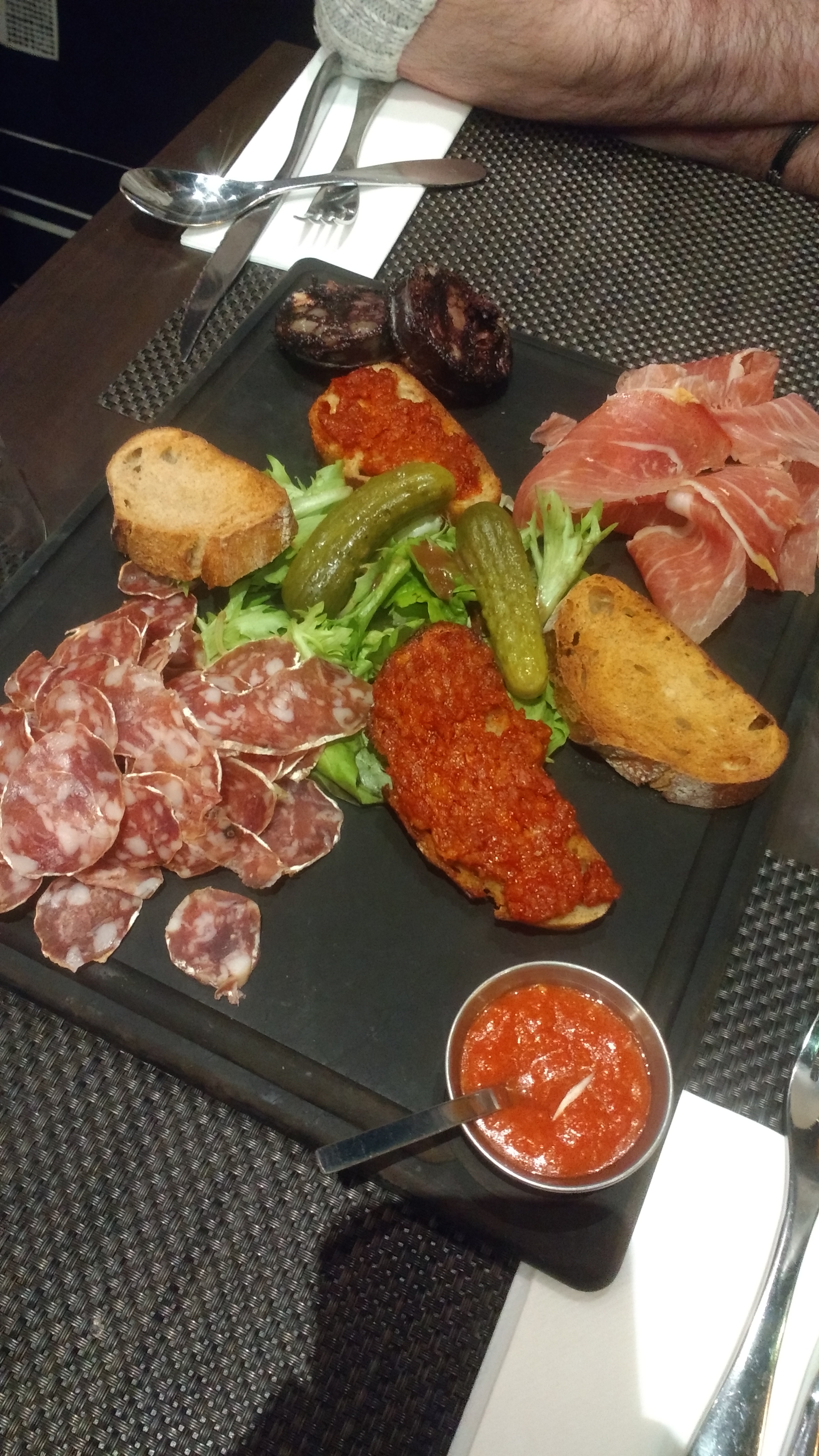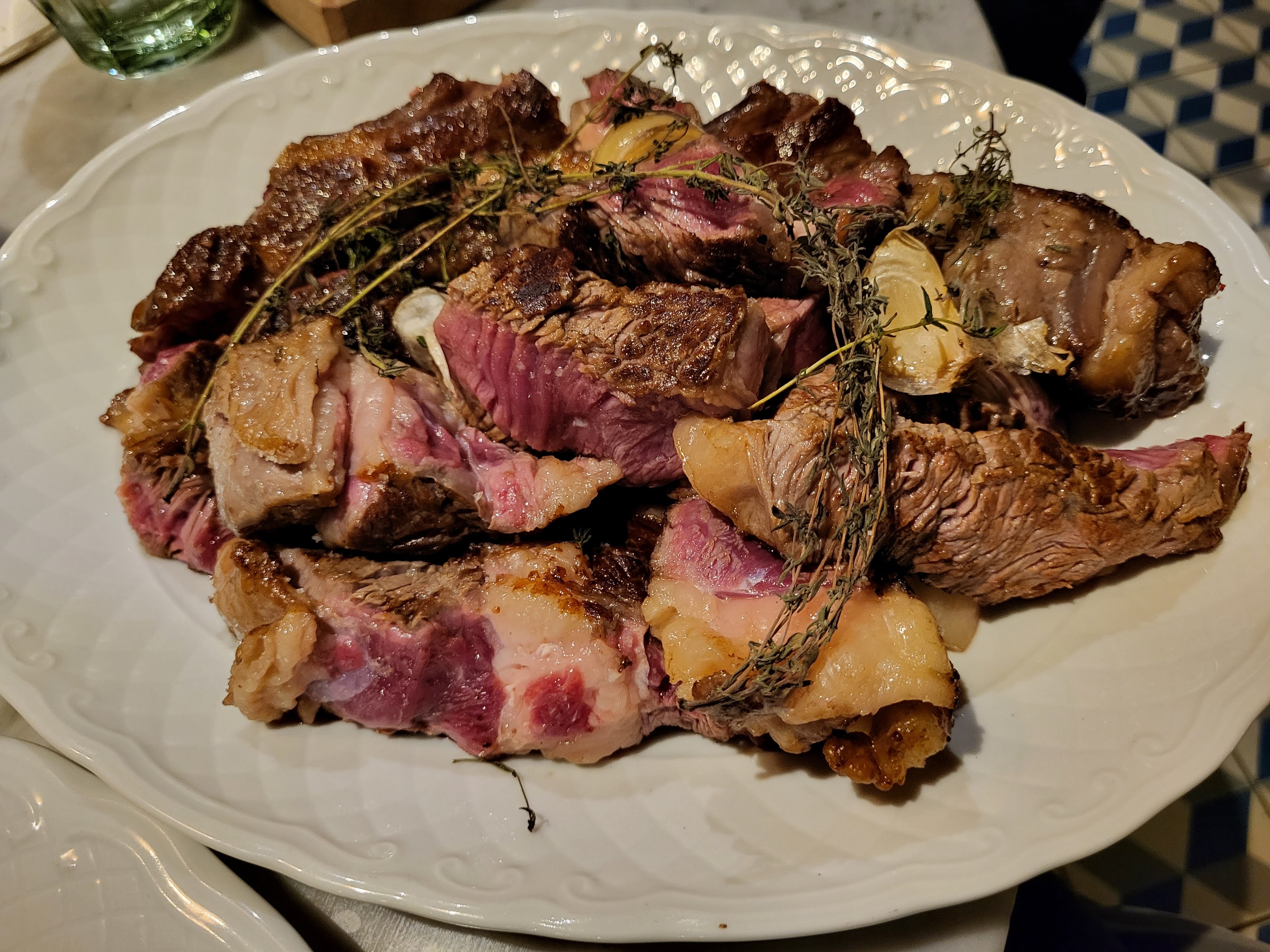 Au top ! En apéro / entrée nous avons opté pour l'assiette de charcuterie Tapas , puis andouillette panée avec frites maison et salade. Mon chéri a fini le repas sur une crème brûlée maison et excellente. Nous avons payé 60€ pour 2 en incluant le Perrier menthe et la bière. Une très bonne adresse, les assiettes sont copieuses et la viande vraiment bonne . L'assiette de tapas est divine. Le boudin est parfait ! Le service à été rapide ,nous avons peu attendu puisque nous sommes restés au total moins d'1h30. Les serveurs étaient adorables. Je recommande vivement ! PS : la table d'à côté avait prit une entrecôte qui a été coupée sous leurs yeux. Je pense que ce sera notre prochaine commande pour ce restaurant.