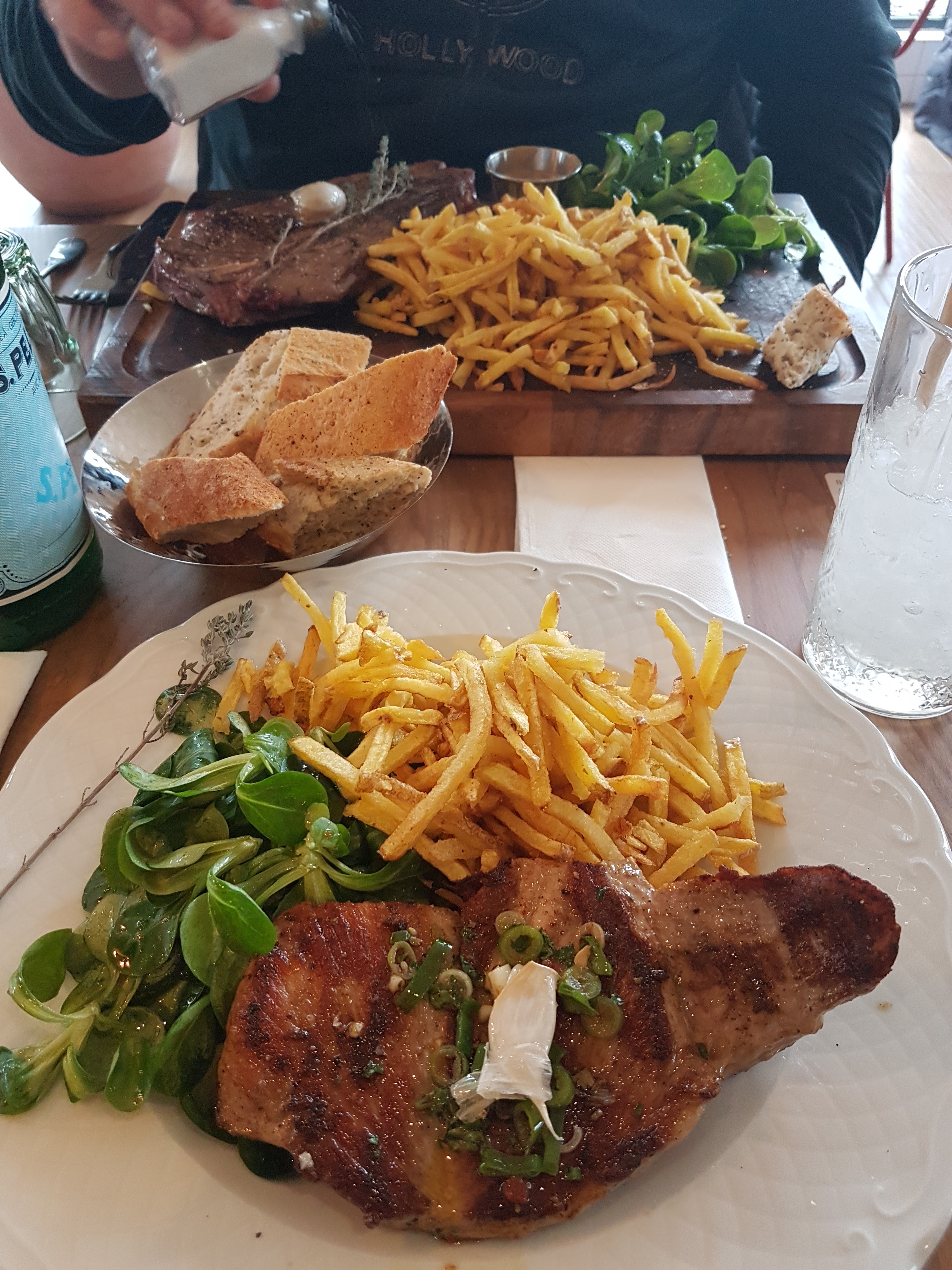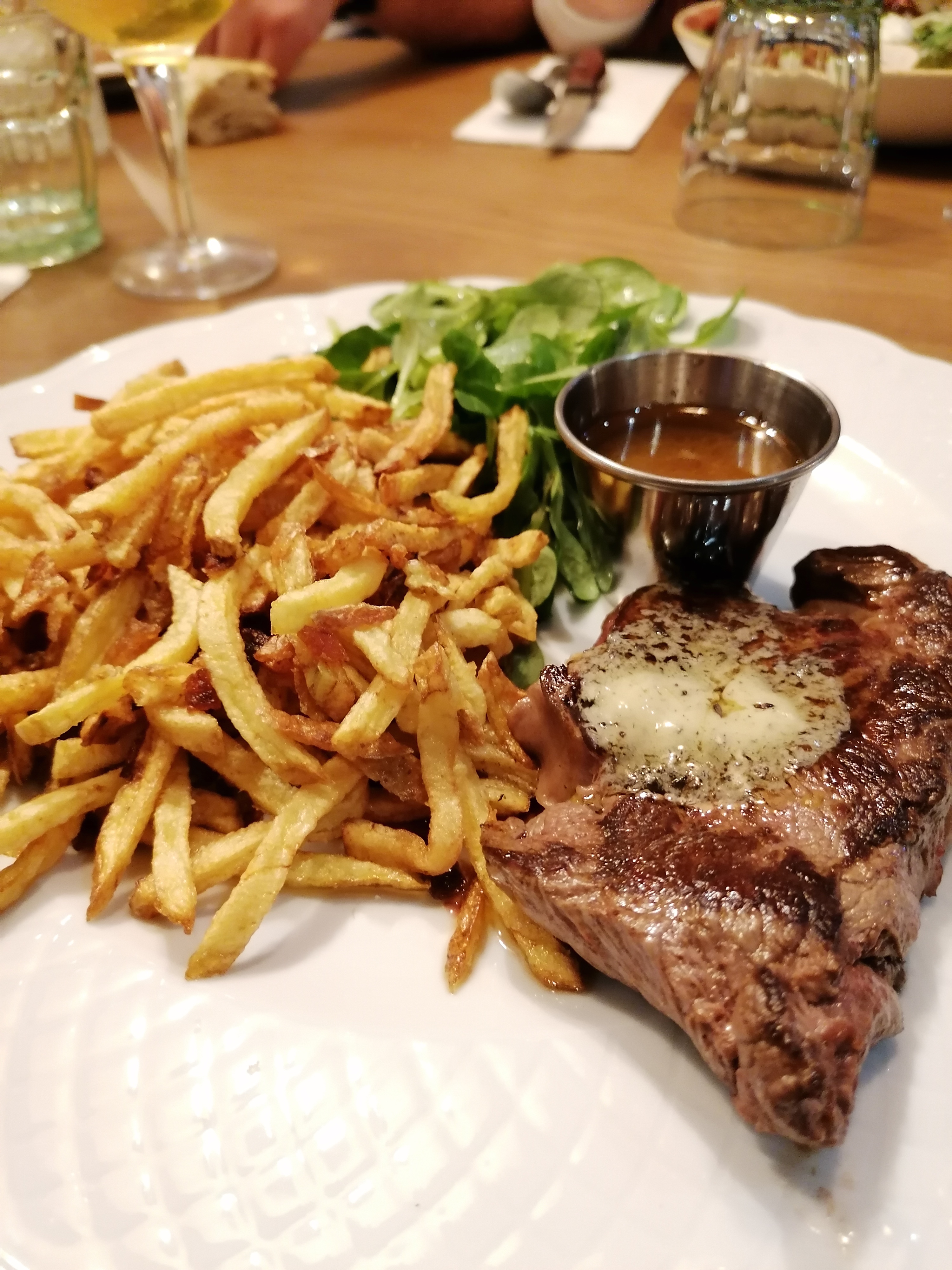 Les magnifiques morceaux de viande maturés donnent le ton dès l'entrée : ici on aime les bonnes choses. Un vrai régal comme chez mémé, d'ailleurs ils lui ont piqué aussi son goût de la décoration. Tout est frais et généreux. Cuisson parfaitement maitrisée. Petit bémol perso sur l'utilisation de l'huile d'olive, dont je ne raffole pas, sur la salade et avait aussi imbibé mes frites. Mais c'est vraiment un détail.