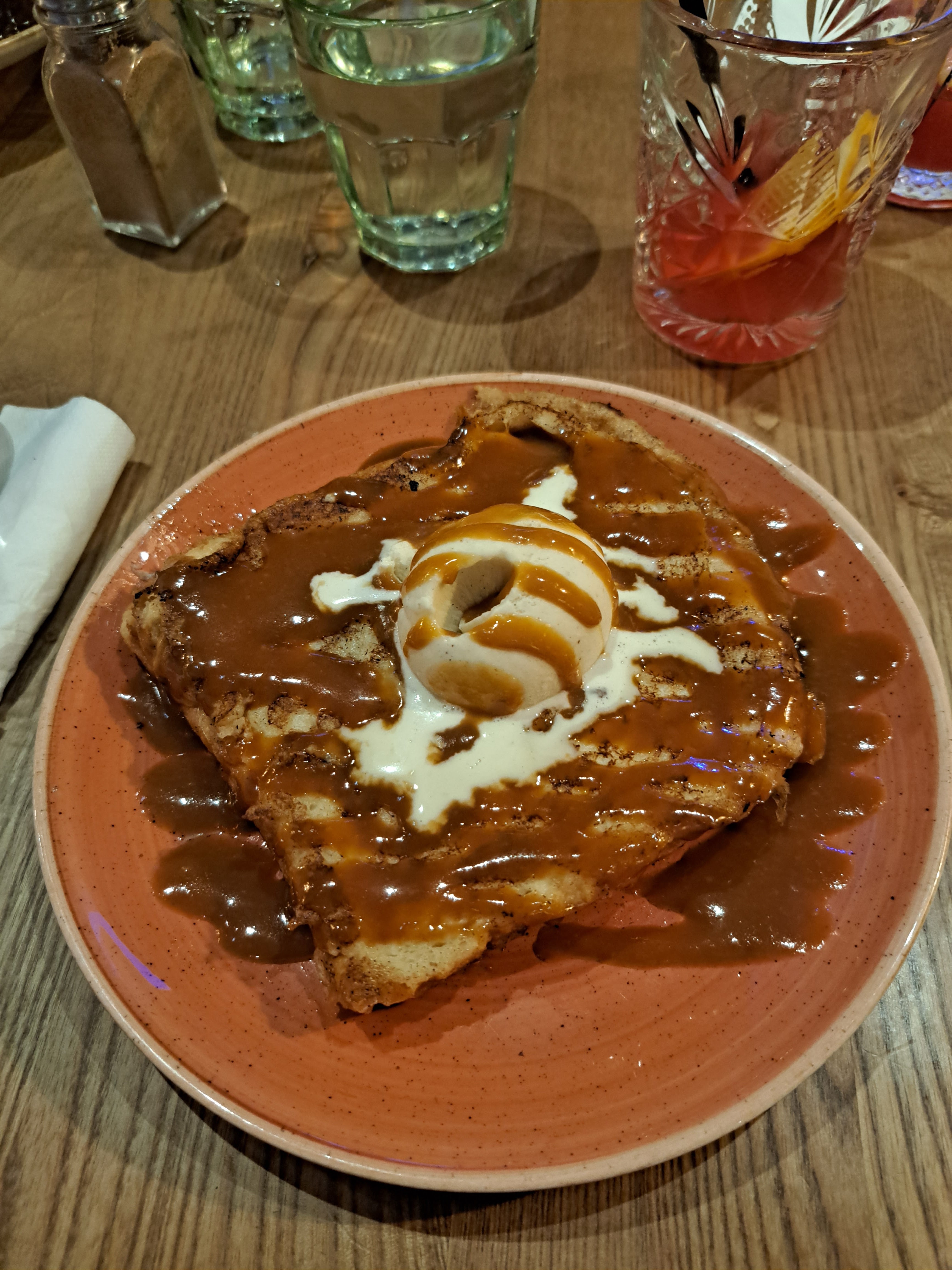 Le service était très sympa. Les serveuses, le barman et serveurs étaient patients et accueillants. Le tartare au boeuf était bon et bien condimenté (échalotes et câpres notamment). Le pain perdu a eu du succès. Pas spécialement fan des frites toutes fines... Tout était cool hormis la cuisson juste et la texture de la gaufre. Pourtant le chocolat étaient généreux et la chantilly également. Ça reste une bonne adresse.